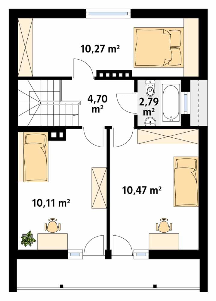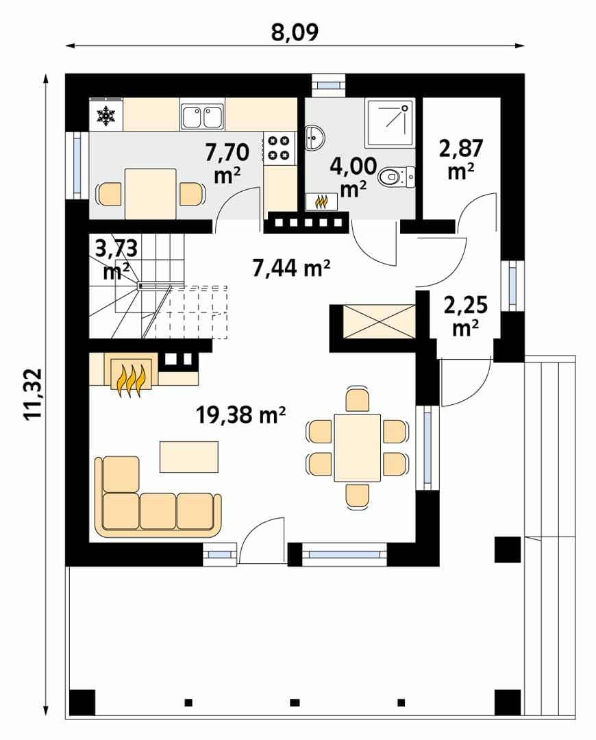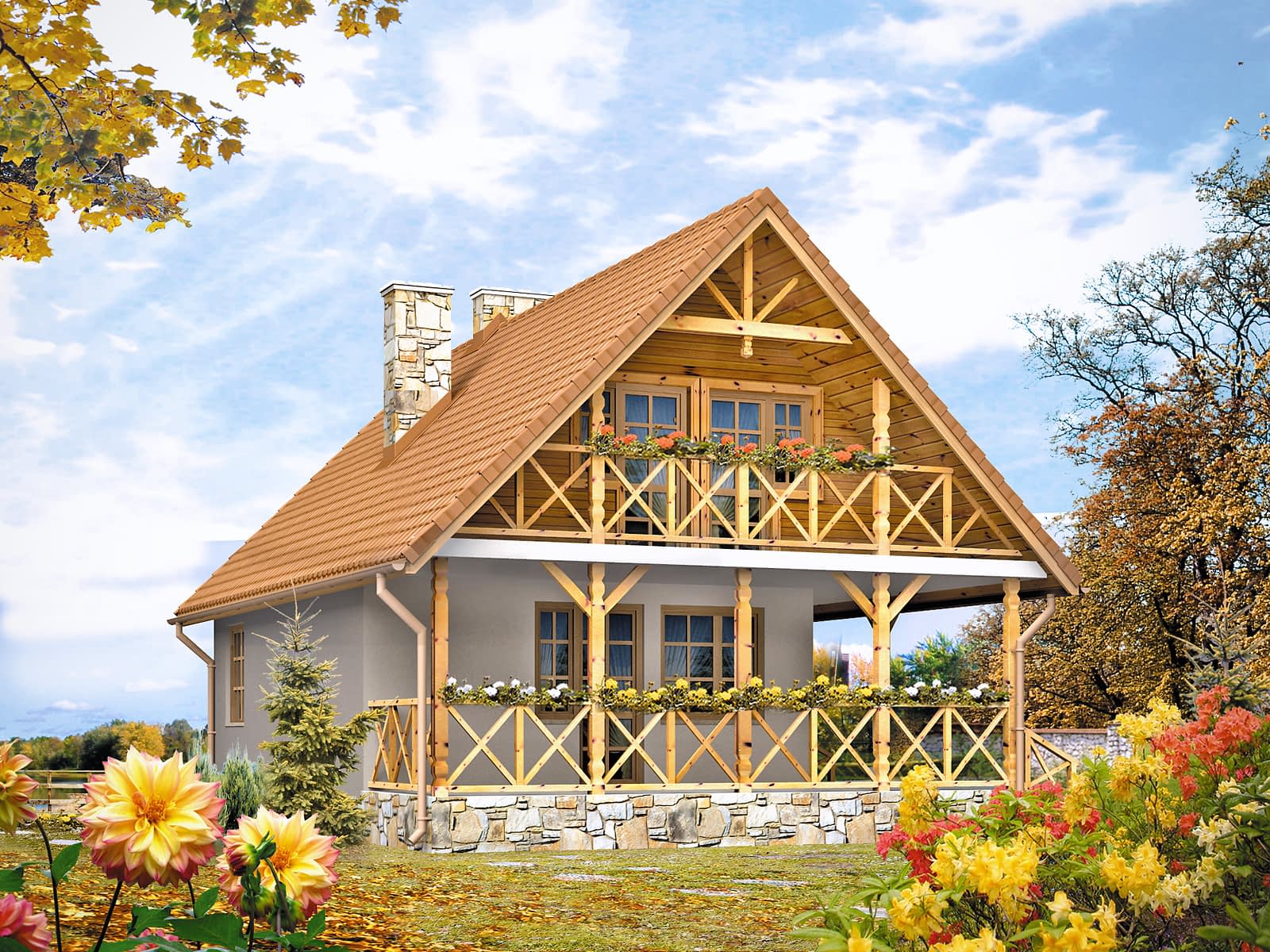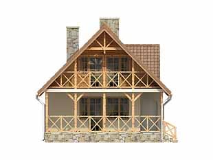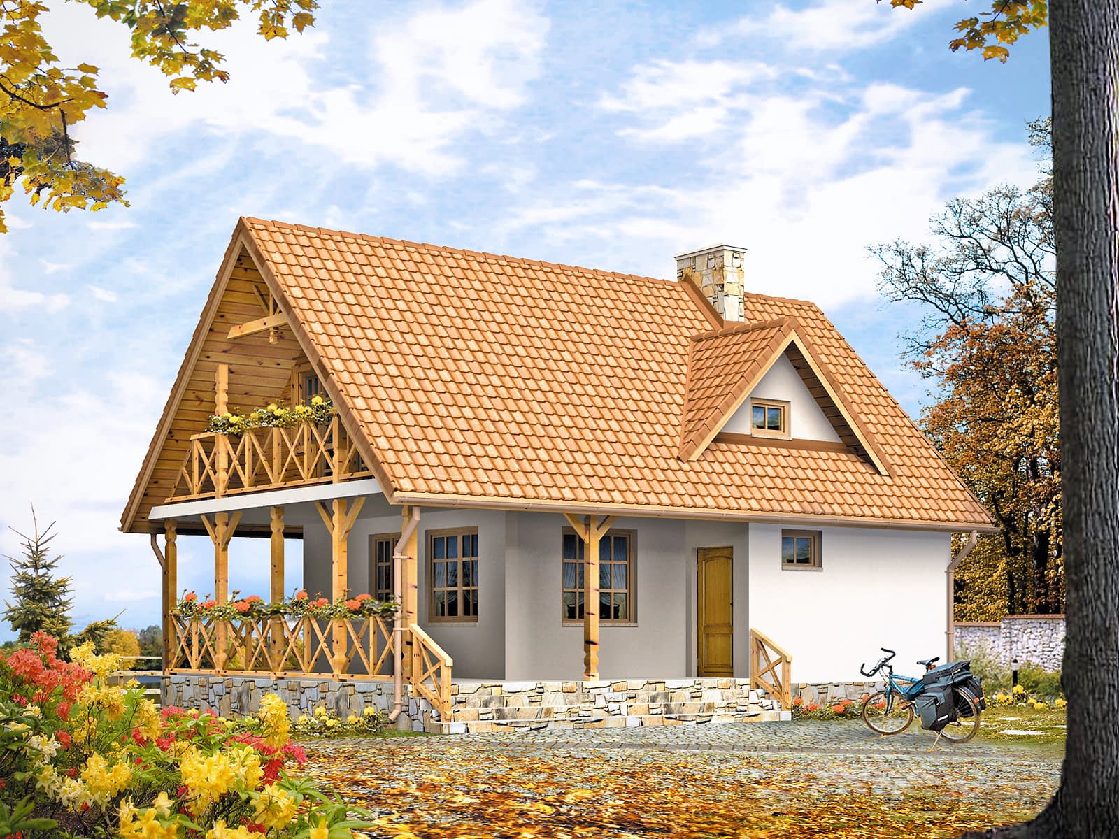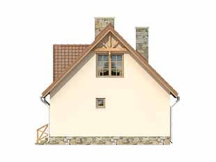 Mały dom jednorodzinny lub letniskowy z użytkowym poddaszem i możliwością podpiwniczenia. Prosty, funkcjonalny układ. Duży taras.Konstrukcja