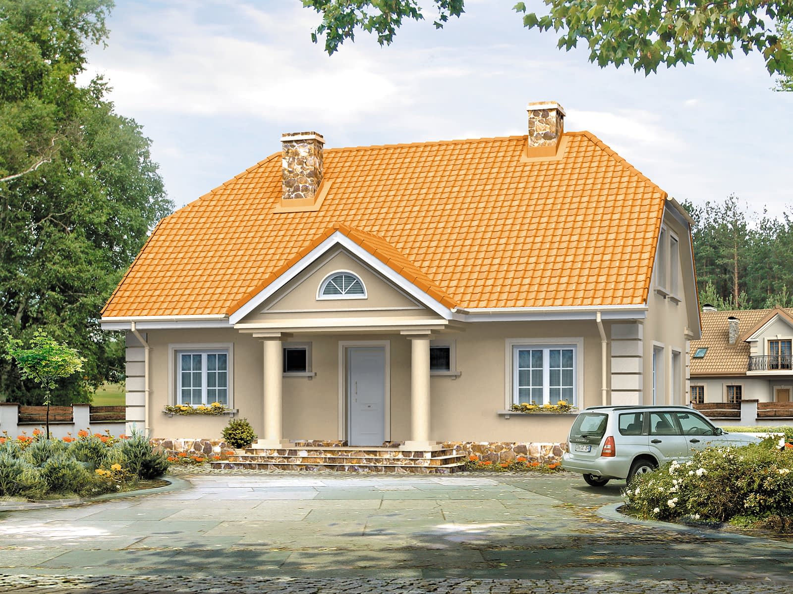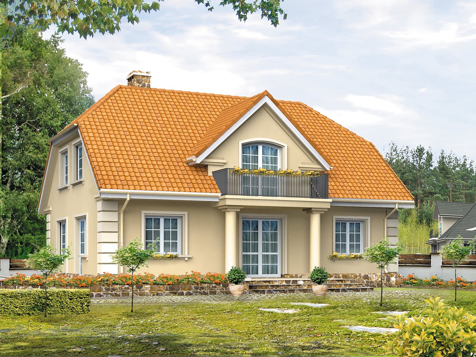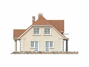 Dom jednorodzinny z użytkowym poddaszem. Przeznaczony dla 4-osobowej rodziny. Architektura domu utrzymana w stylu dworku polskiego. Na parterze zaprojektowano dodatkowy pokój - gabinet. W pokoju dziennym zamiast kominka umieszczono piec kaflowy. Na poddaszu zlokalizowano trzy sypialnie, garderobę i łazienkę.Konstrukcja