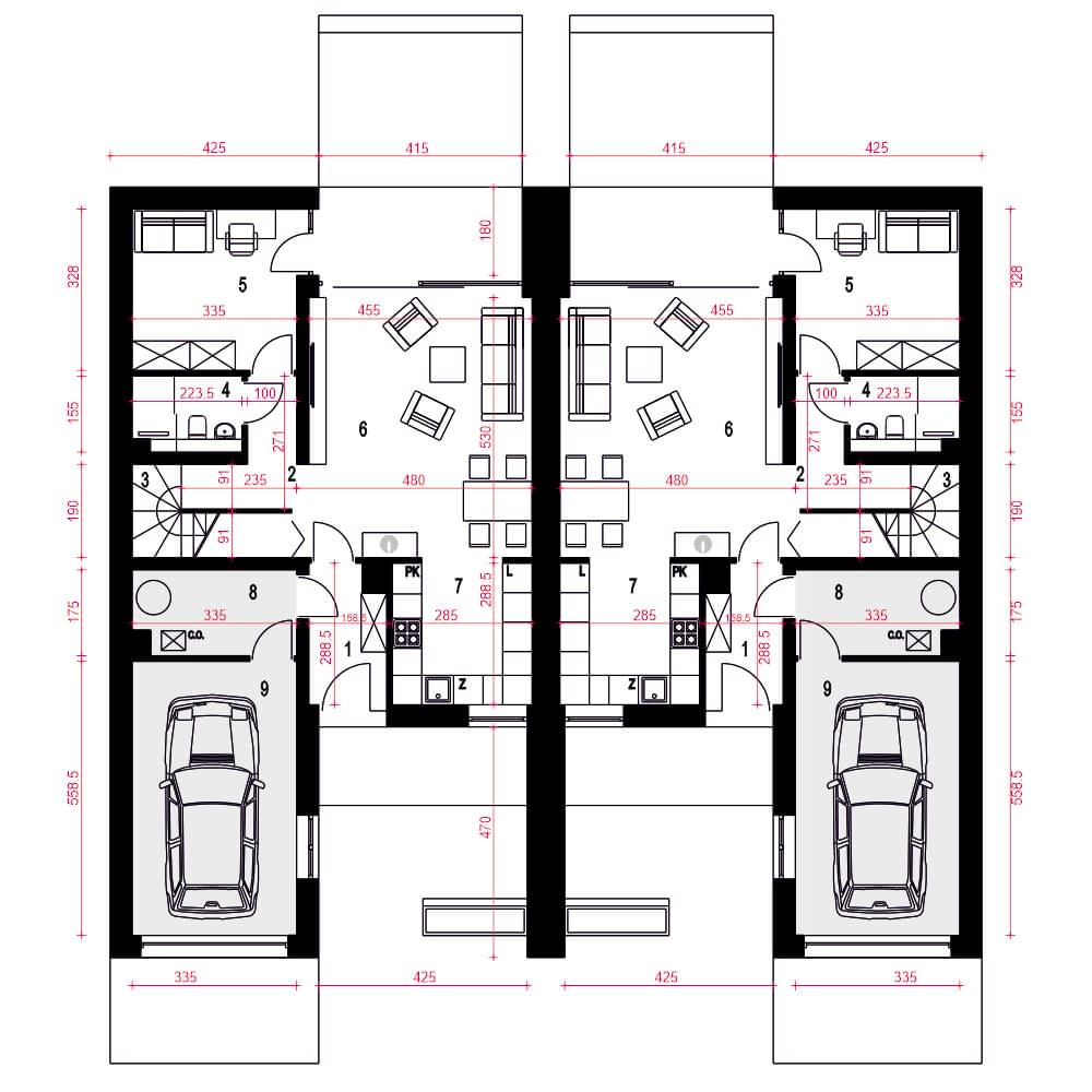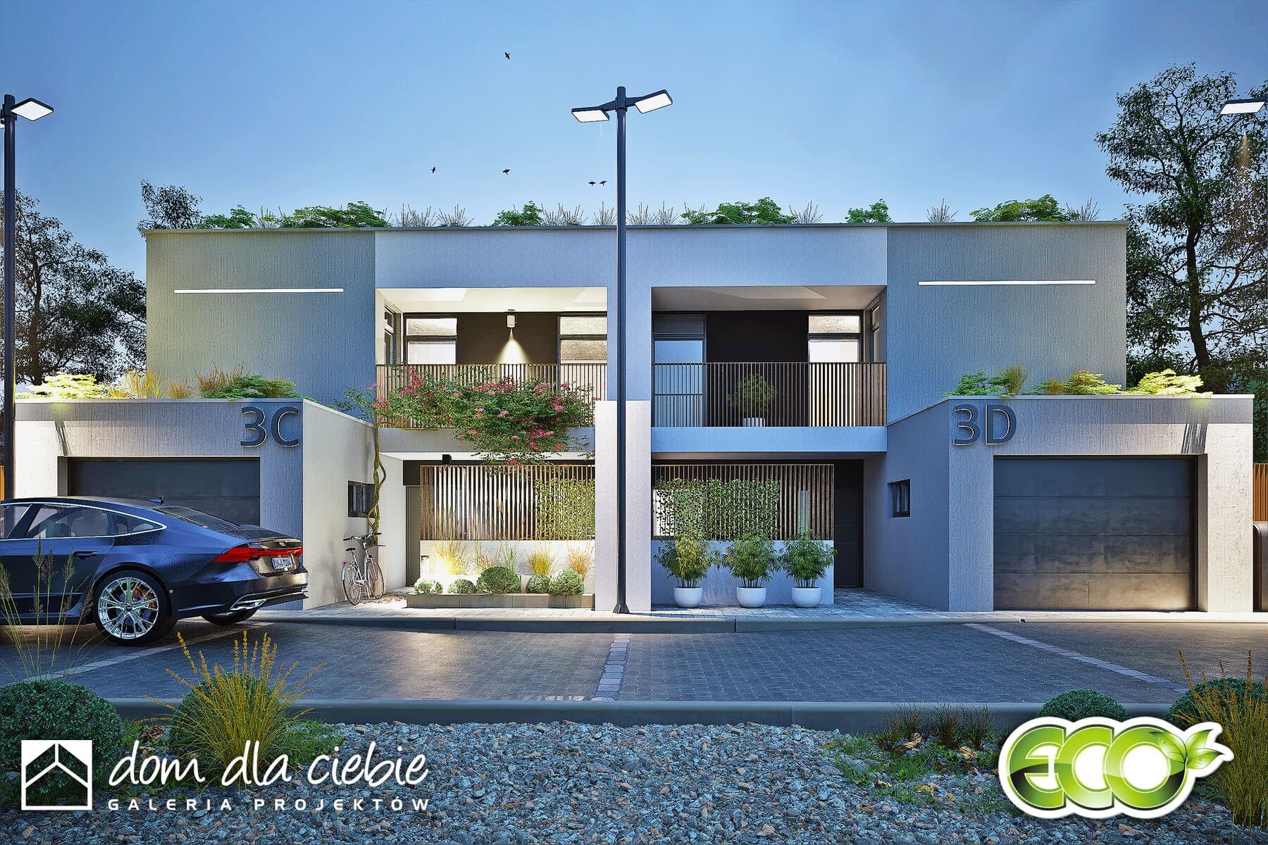 Poniższy opis odnosi się do jednego segmentu:Talia to nowoczesny, funkcjonalny dom rodzinny, dostępny jako wolnostojący lub w zabudowie bliźniaczej. Jego kompaktowa forma pozwala na posadowienie na wąskich działkach, co czyni go atrakcyjnym dla deweloperów.Parter obejmuje wiatrołap z wejściem do pomieszczenia gospodarczego i garażu, garderobę pod schodami, małą łazienkę, pokój oraz przestronną strefę dzienną z kuchnią, jadalnią i salonem. Garaż łączy się z częścią mieszkalną przez pomieszczenie techniczne.Na piętrze znajdują się trzy sypialnie, duża łazienka oraz wnęki na pralkę i suszarkę. Każda sypialnia ma dostęp do balkonu. Zielone tarasy nad garażem i pokojem na parterze podkreślają nowoczesny, ekologiczny charakter domu, który doskonale wpisuje się w estetykę współczesnych osiedli.