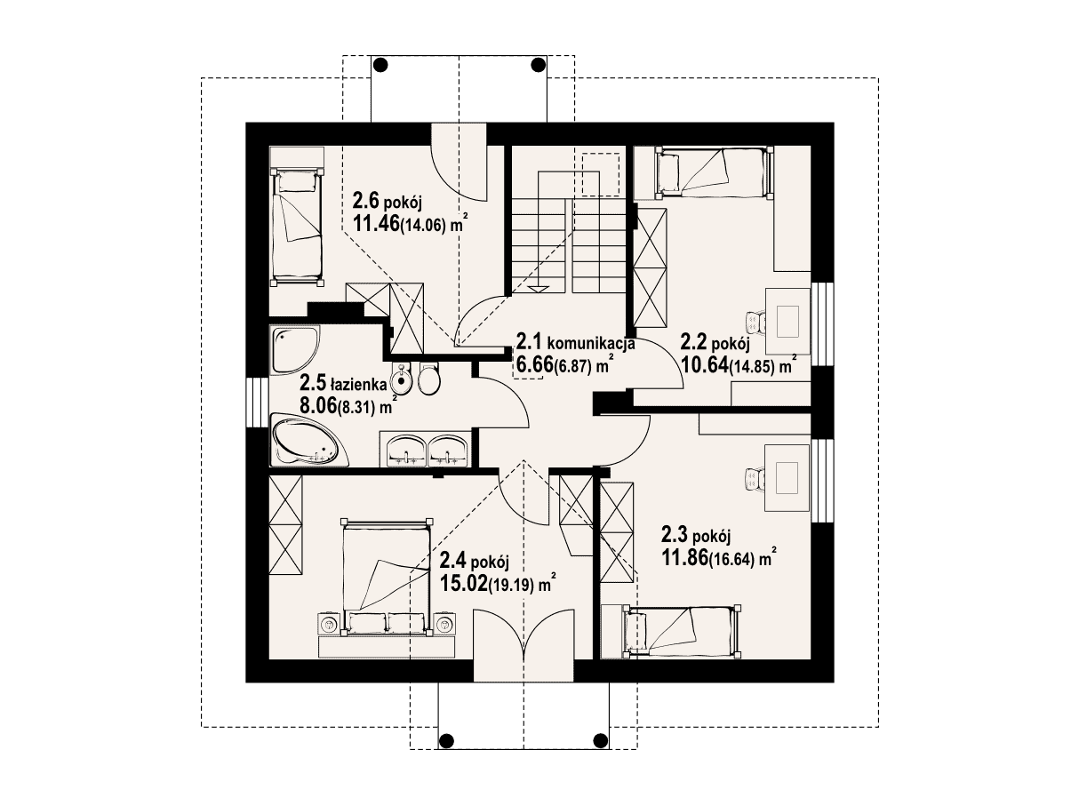Całkowicie podpiwniczony dom z poddaszem. Na parterze duży salon z kuchnią tworzą wspólną przestrzeń. W salonie kominek. Dodatkowy pokój na parterze dostępny z salonu. Ponadto łazienka i duża garderoba. Część nocna na poddaszu obejmuje cztery sypialnie i łazienkę.Rzuty