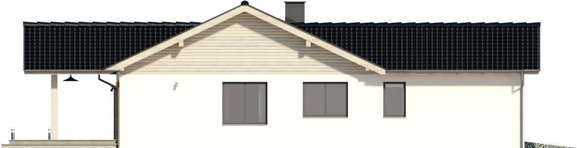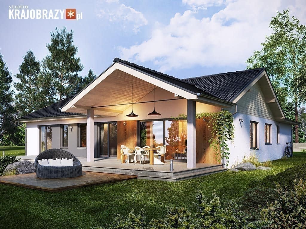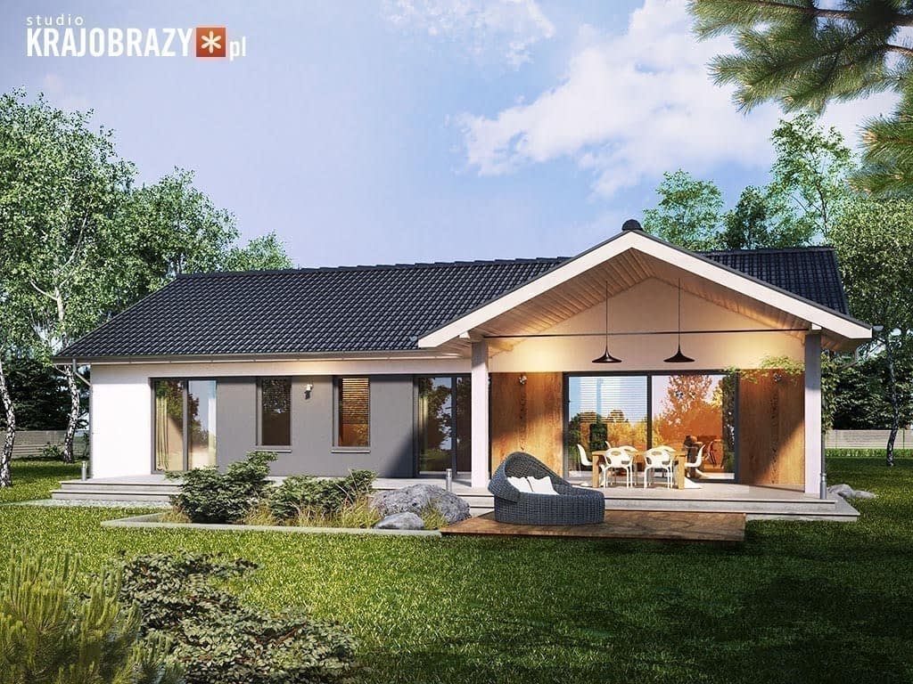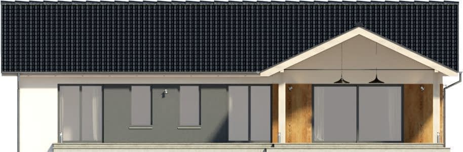 Projekt domu Tartufo 2 z garażem dwustanowiskowym to nowoczesny budynek parterowy z otwartą częścią dzienną, której ozdobą jest funkcjonalna kuchnia z zabudową w kształcie litery L i wolnostojącą wyspą. Reprezentacyjny salon przedłużony został przez dostępny przez duże okno komfortowy, zadaszony taras. W części nocnej do dyspozycji są cztery następne pokoje, dwie łazienki oraz garderoba dostępna z największej sypialni. Tartufo 2 ma przemyślaną, ekonomiczną konstrukcję parterowego bungalowu bez masywnego stropu.