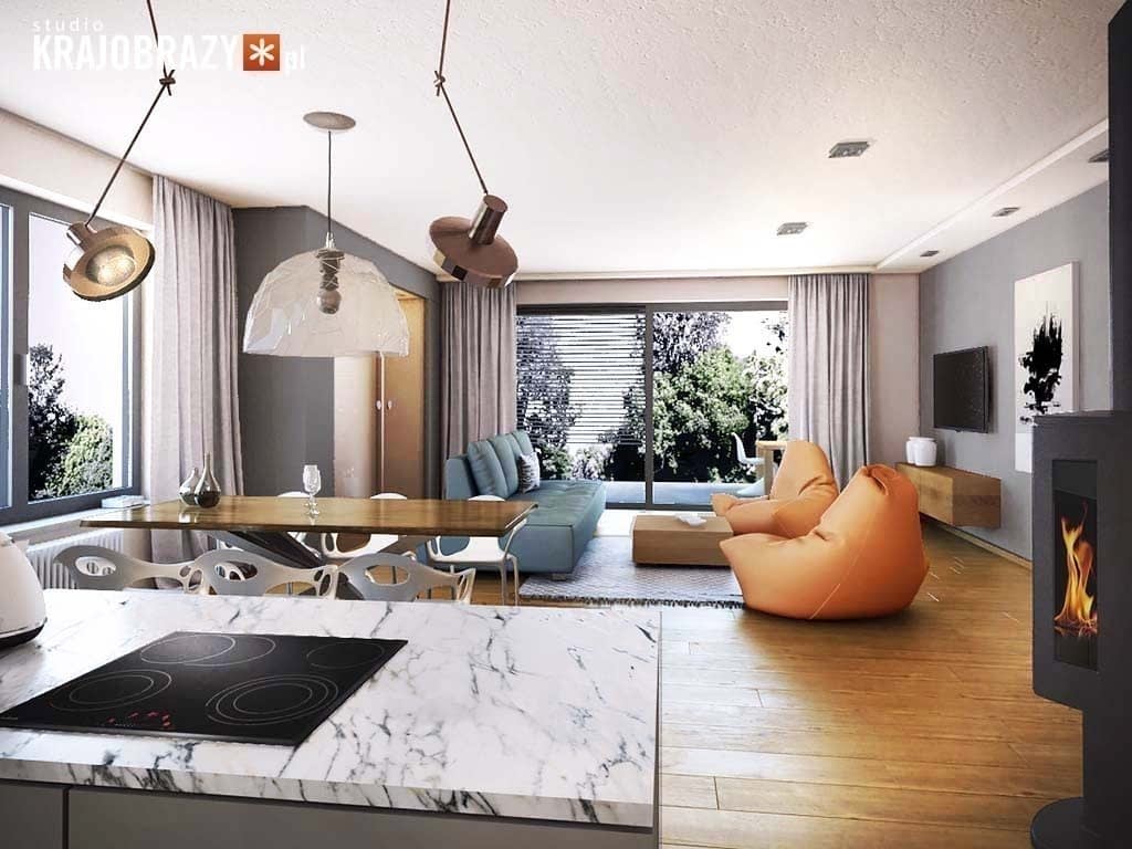 Darmowy zielony pakiet do projektu oznacza, że w tej samej cenie można otrzymać wariant z ogrzewaniem przy zastosowaniu ekologicznej pompy ciepła powietrze-woda i podłogówką we wszystkich pomieszczeniach, zamiast standardowego pieca gazowego zasilającego stalowe grzejniki płytowe.
