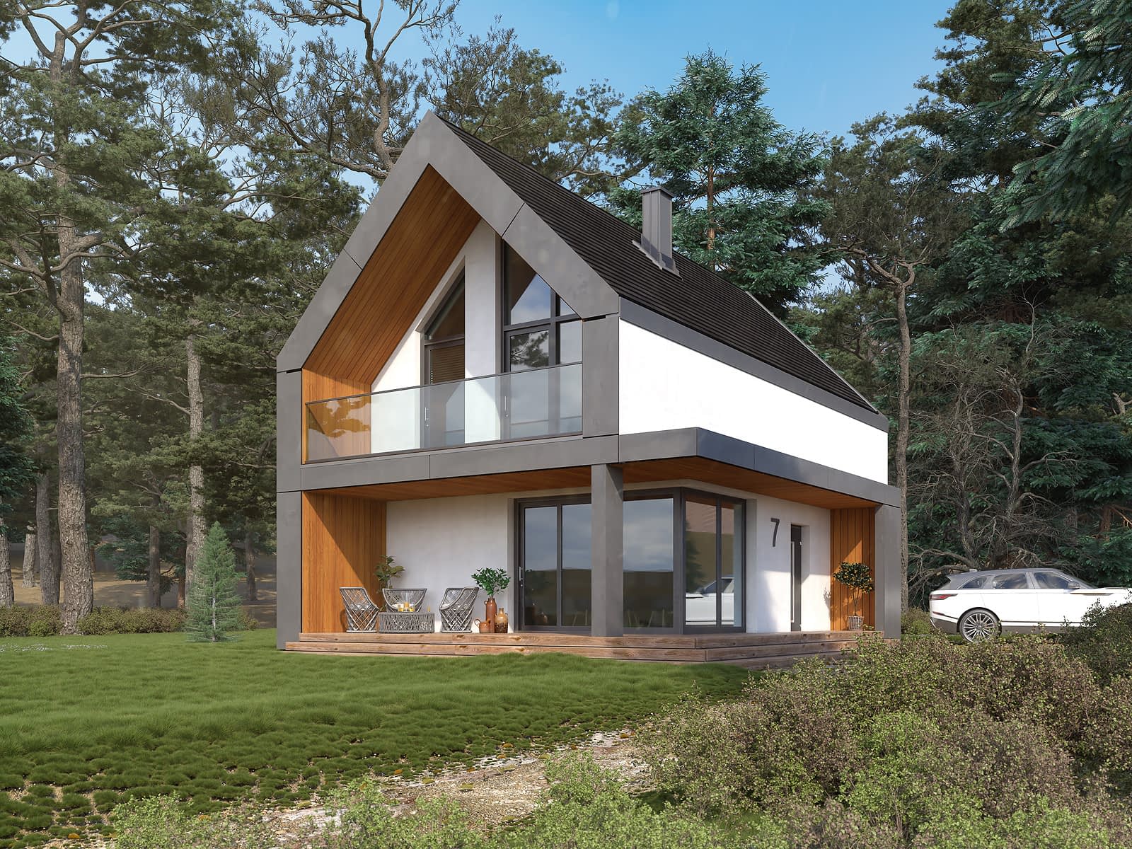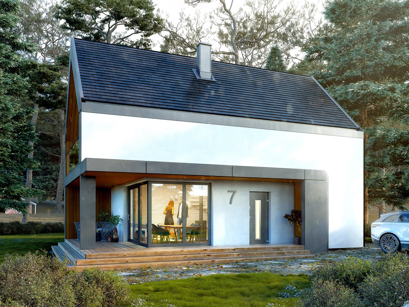 Projekt Teja to nowoczesny projekt z użytkowym poddaszem zaprojektowany w stylu nowoczesnej stodoły. Prosta bryła została przykryta dwuspadowym dachem bez okapów. Biała elewacja kontrastuje z grafitową dachówką oraz drewnianą okładziną, którą wykończono zadaszenie tarasu oraz balkonu. Na parterze zaprojektowano otwartą strefę wypoczynkową z salonem, jadalnią oraz otwartą klatką schodową. Wysokie przeszklenia w części dziennej zapewniają dużą ilość naturalnego światła oraz otwierają wnętrze na ogród. Ogromną zaletą projektu jest zadaszony taras biegnący od salonu do wejście głównego. Uzupełnieniem układu funkcjonalnego na parterze jest kuchnia ze spiżarnią oraz łazienka. Na poddaszu zaprojektowano strefę nocną, na którą składają się trzy sypialnie oraz łazienka. Sypialnia główna gospodarzy posiada dodatkowo prywatną garderobę.Konstrukcja
