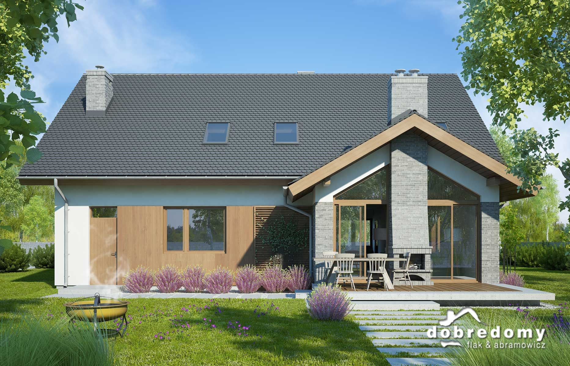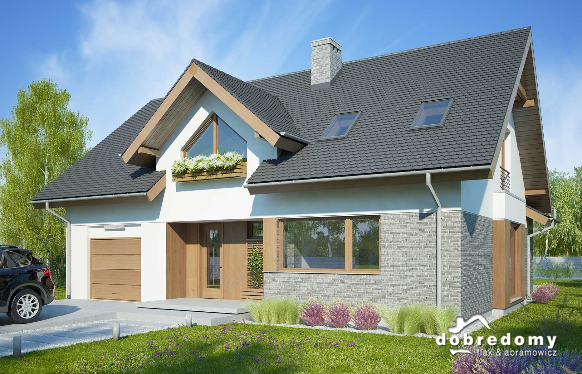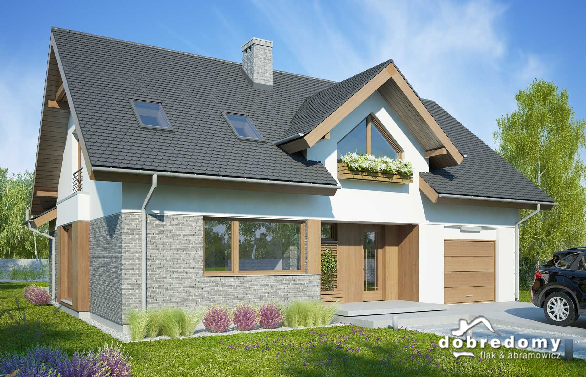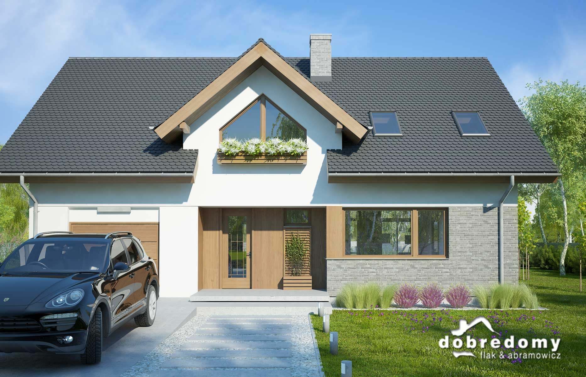 Dom z użytkowym poddaszem, przeznaczony dla 4-osobowej rodziny. Na parterze znajduje się pokój dzienny z bezpośrednim wyjściem do ogrodu, przestrzennie połączony z jadalnią oraz częściowo otwartą kuchnią. Przy jednostanowiskowym garażu znajduje się obszerne pomieszczenie gospodarcze. Na poddaszu znajdują się trzy pokoje, w tym jeden z własną garderobą, oraz łazienka.