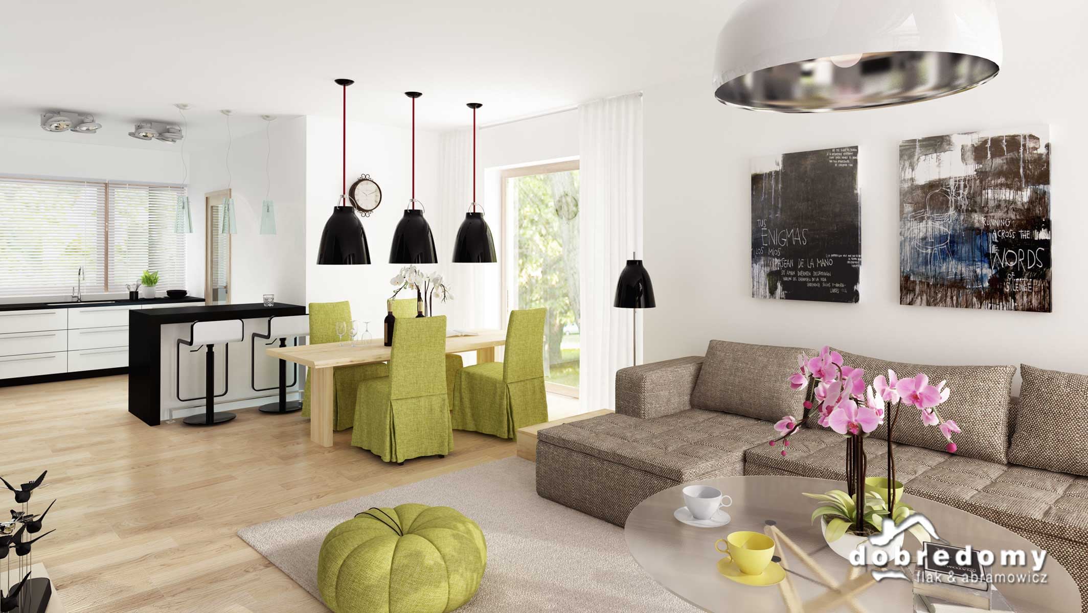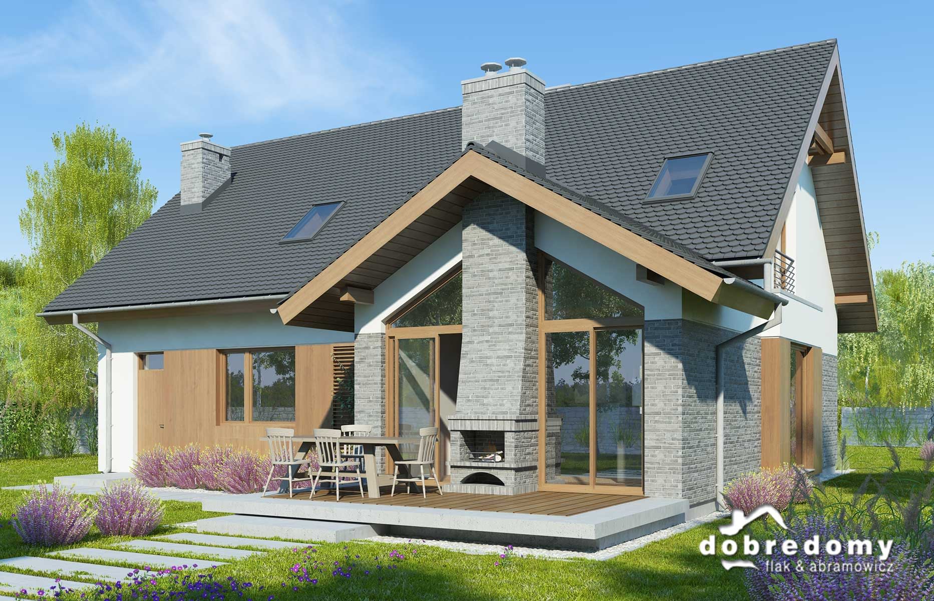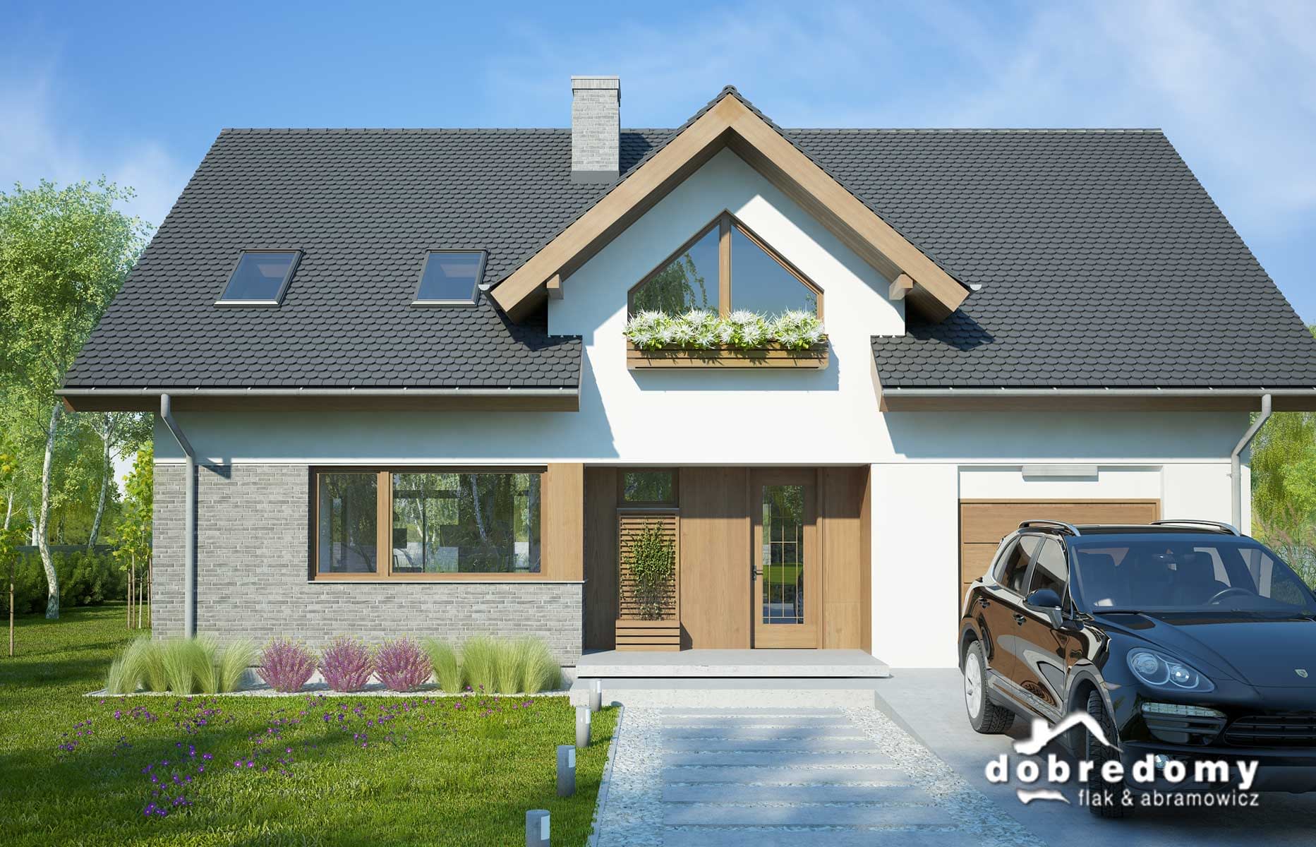 Dom z użytkowym poddaszem, przeznaczony dla 4-osobowej rodziny. Na parterze znajduje się pokój dzienny z bezpośrednim wyjściem do ogrodu, przestrzennie połączony z jadalnią oraz częściowo otwartą kuchnią. Przy jednostanowiskowym garażu znajduje się obszerne pomieszczenie gospodarcze. Na poddaszu znajdują się trzy pokoje, w tym jeden z własną garderobą, oraz łazienka.