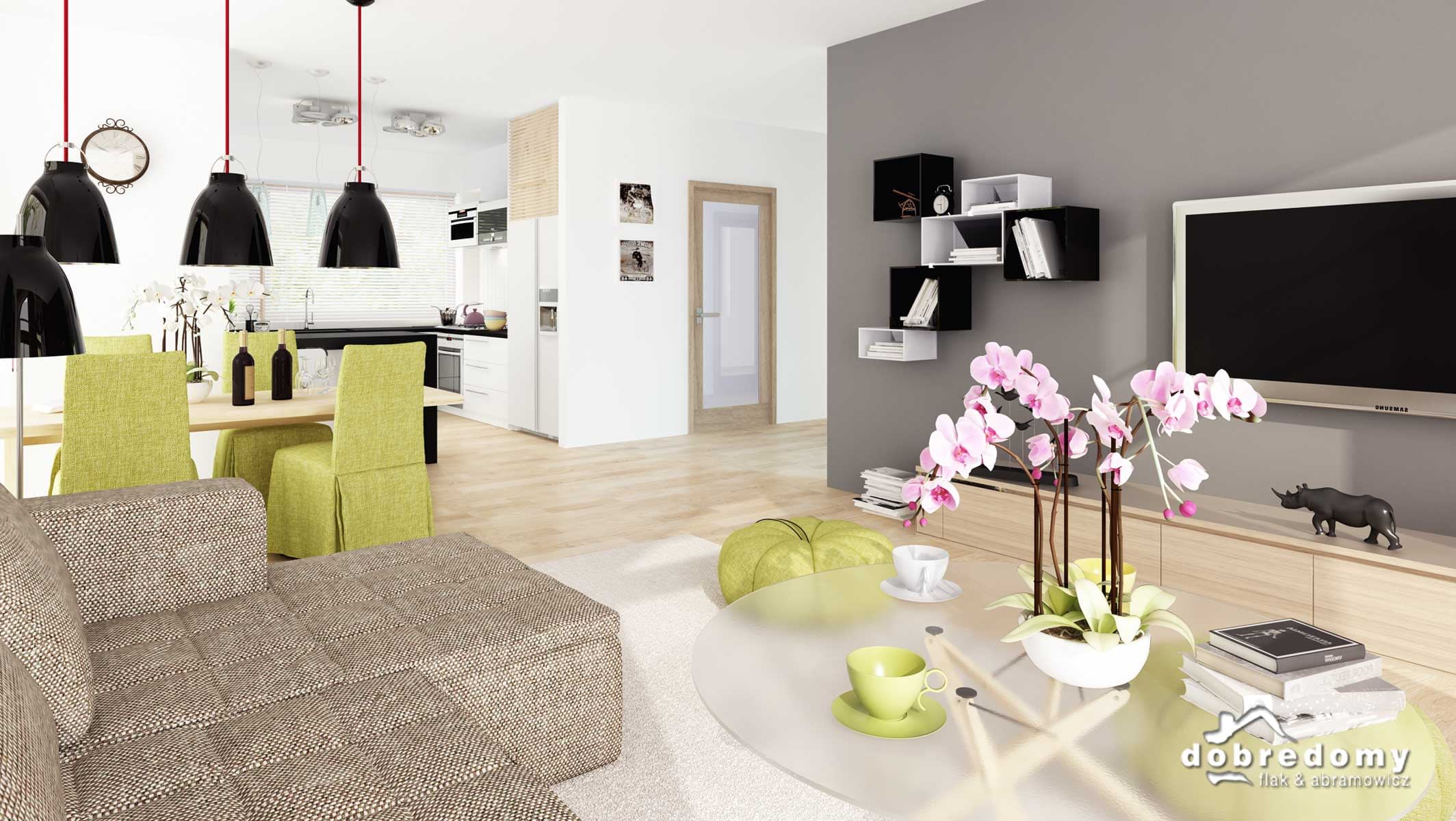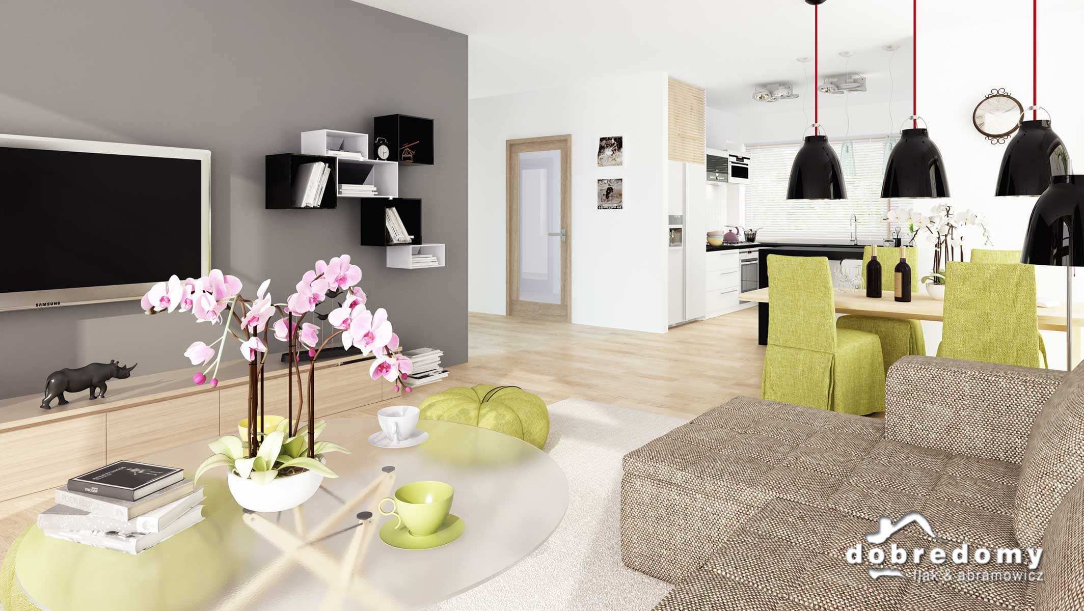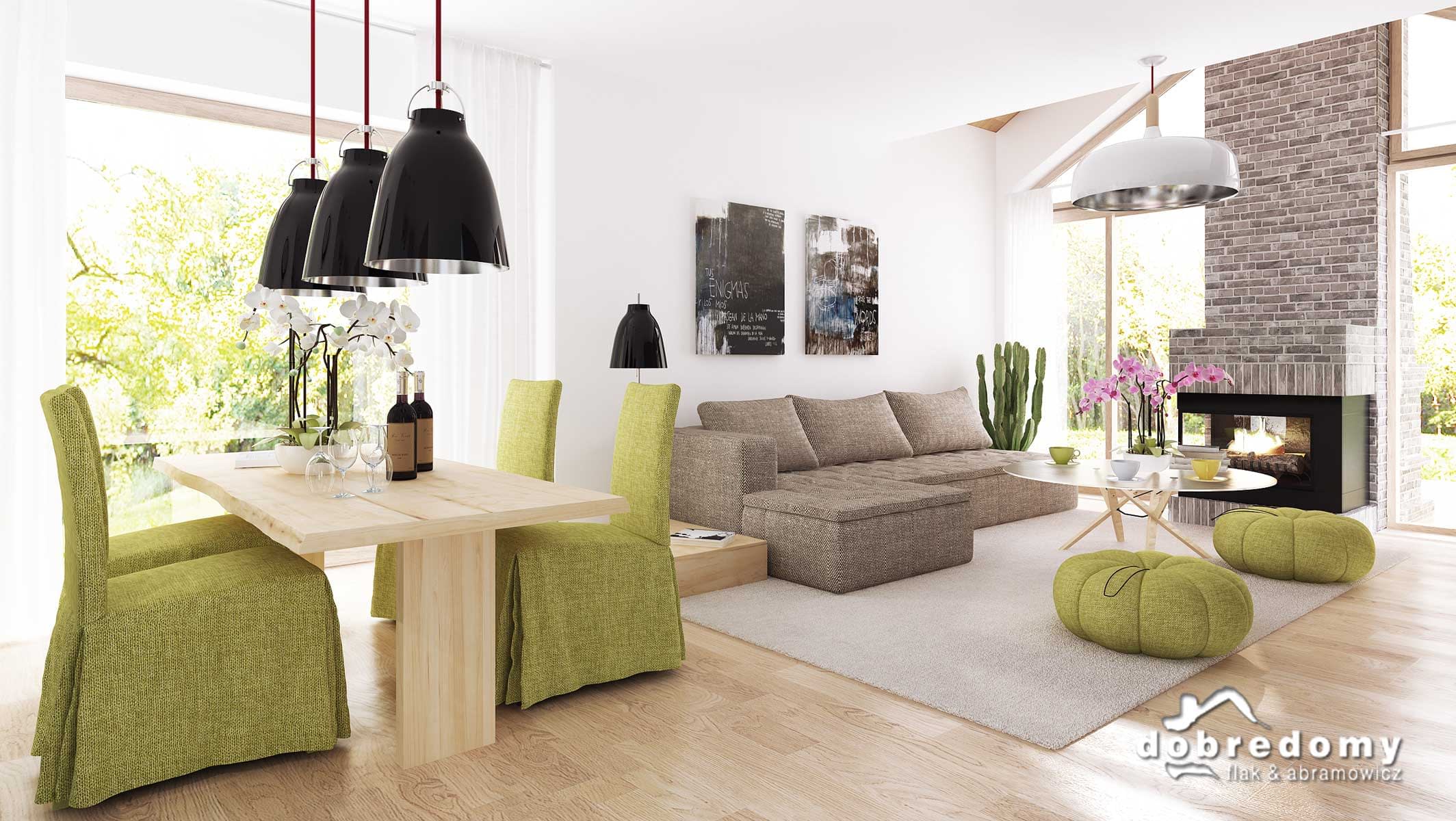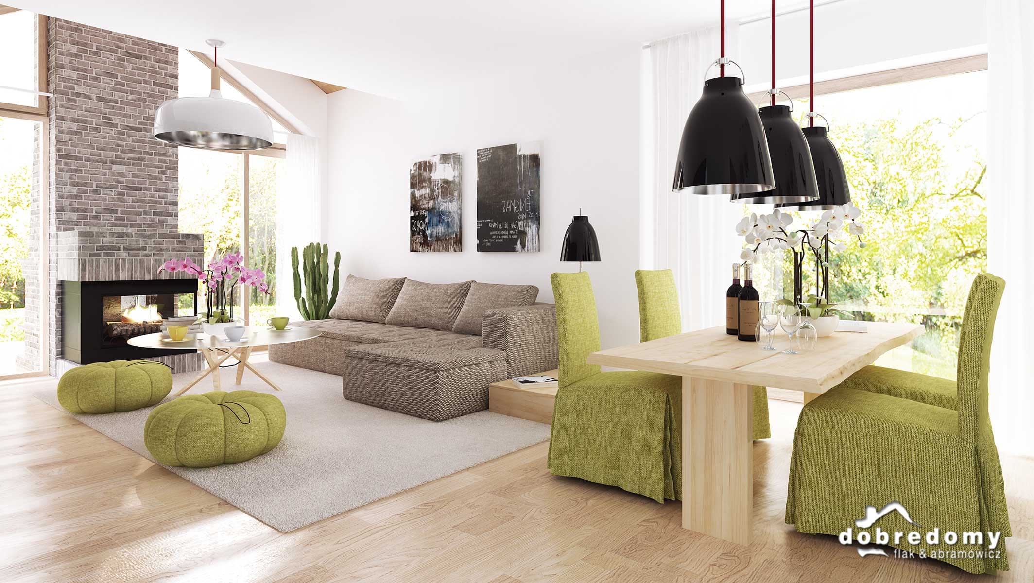 Dom z użytkowym poddaszem, przeznaczony dla 4-osobowej rodziny. Na parterze znajduje się pokój dzienny z bezpośrednim wyjściem do ogrodu, przestrzennie połączony z jadalnią oraz częściowo otwartą kuchnią. Przy jednostanowiskowym garażu znajduje się obszerne pomieszczenie gospodarcze. Na poddaszu znajdują się trzy pokoje, w tym jeden z własną garderobą, oraz łazienka.