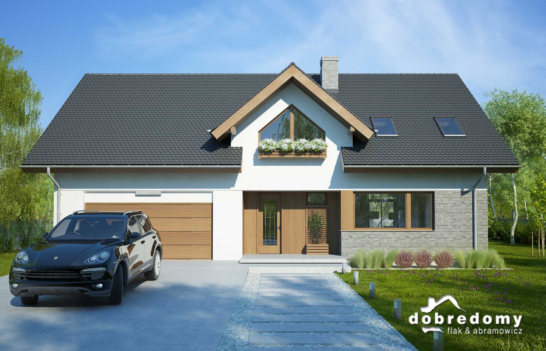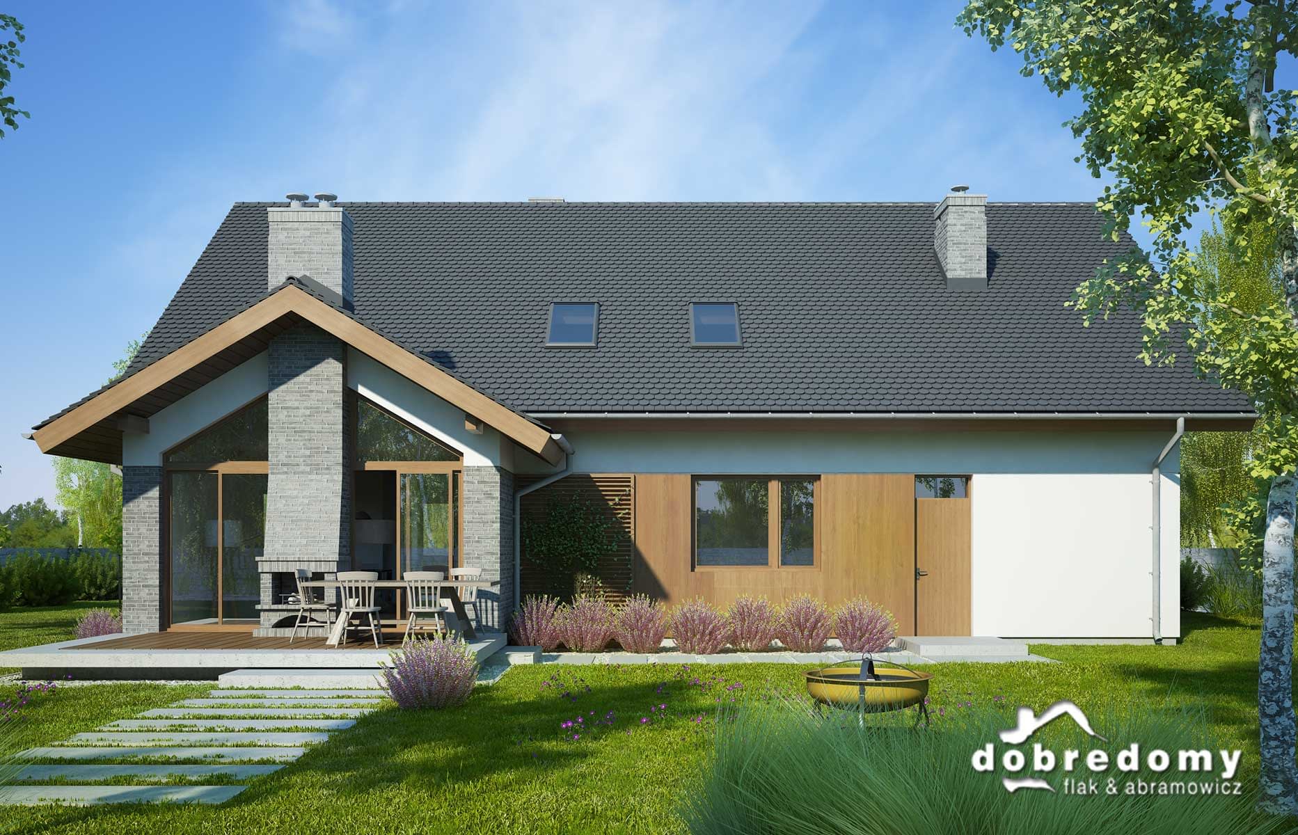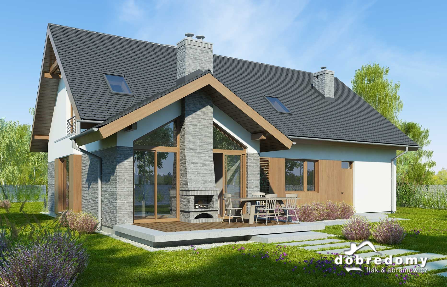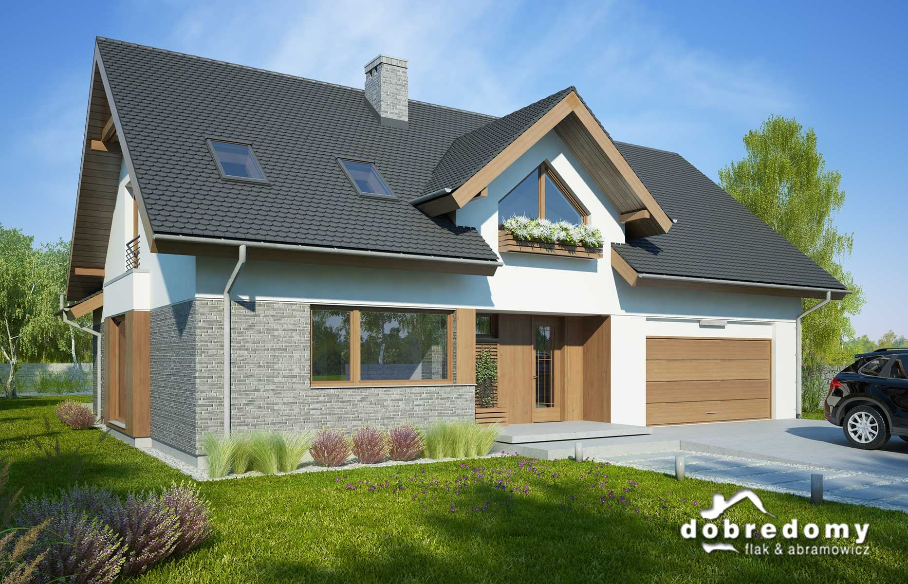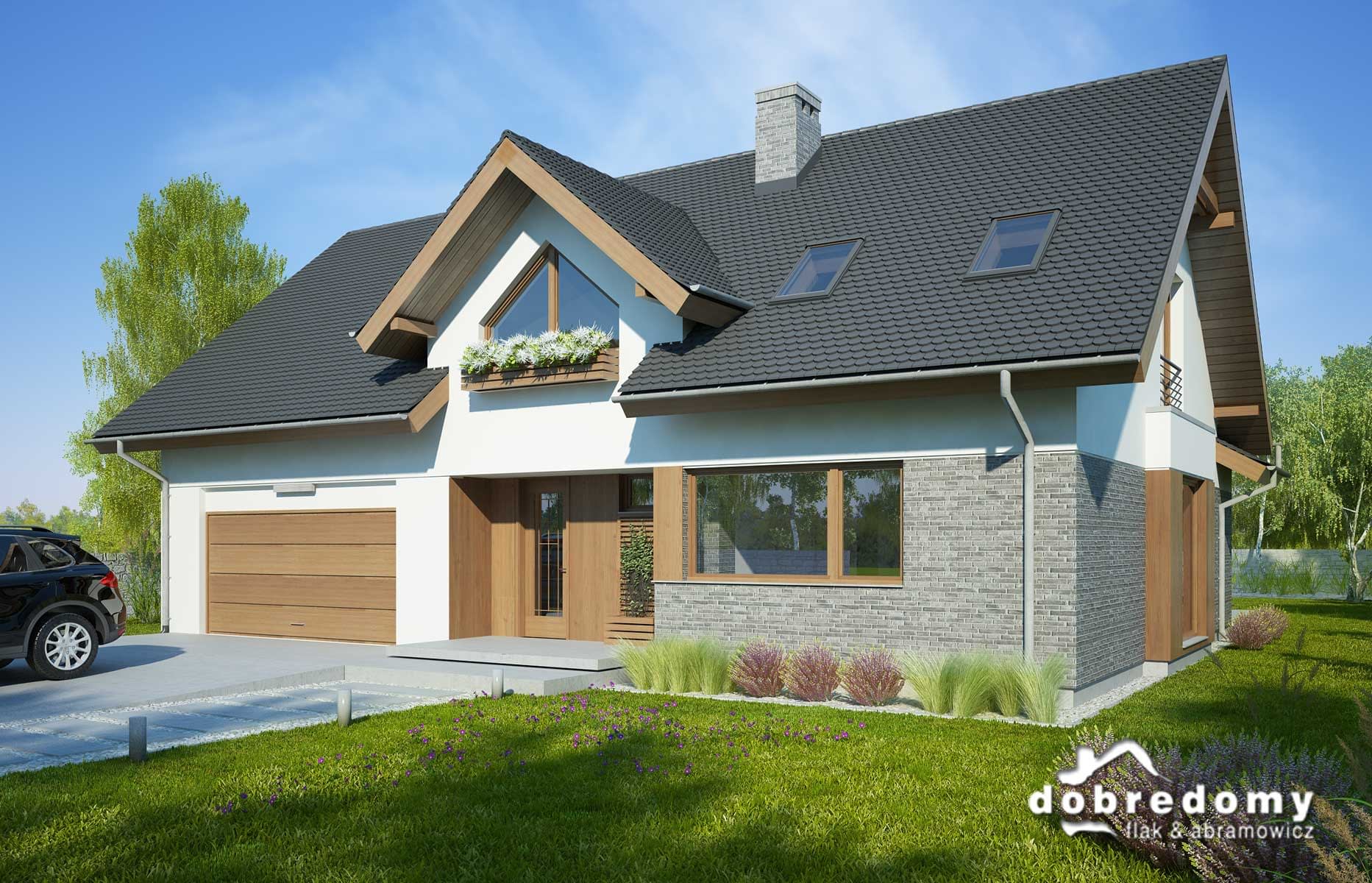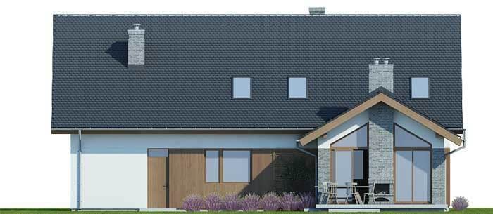 Elewacje pokryte tynkiem strukturalnym w systemie ociepleń Termo Organika, okładziną klinkierową oraz drewnianą. W projekcie zastosowano okna dachowe marki FAKRO. Pokrycie dachu - dachówka ceramiczna lub cementowa CREATON.