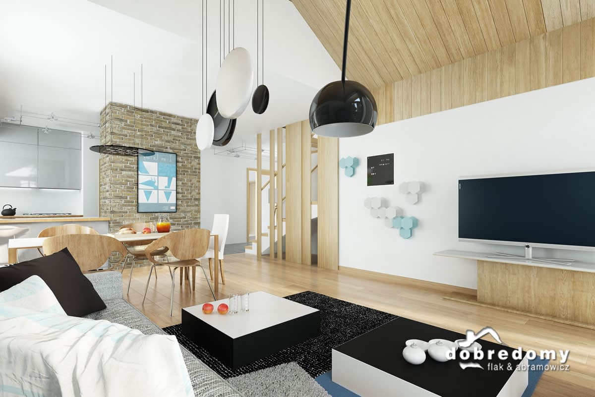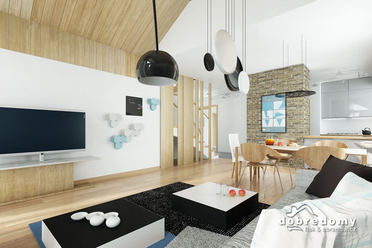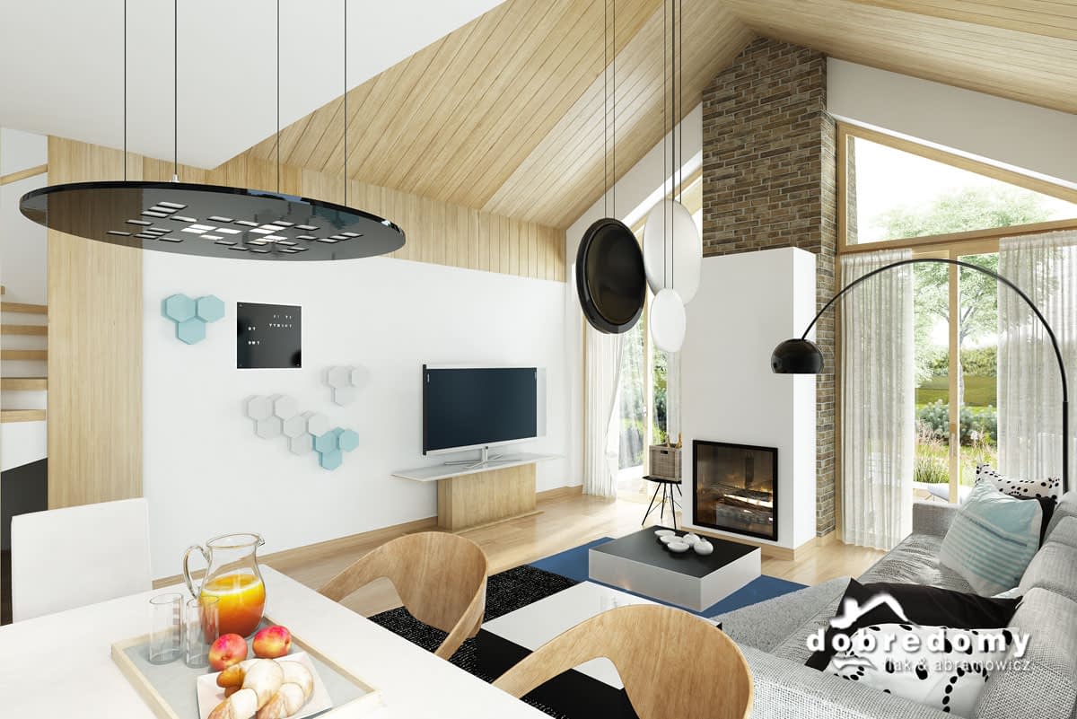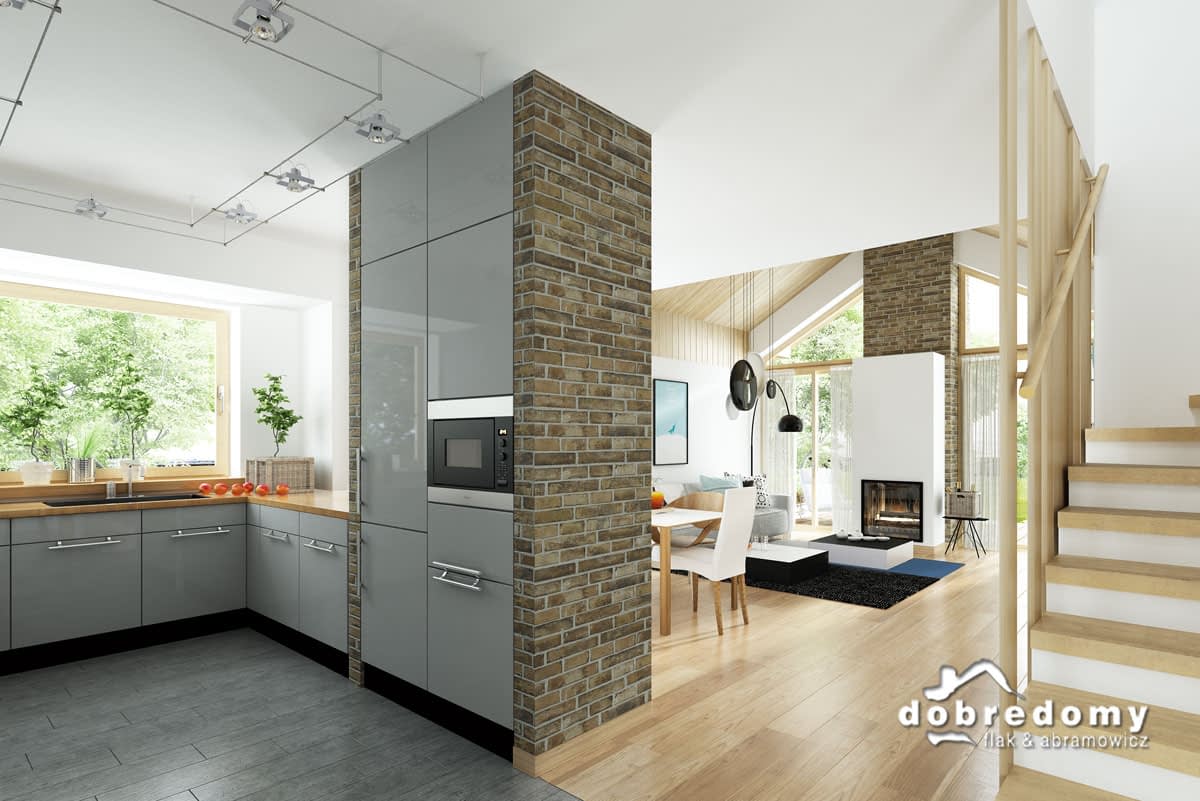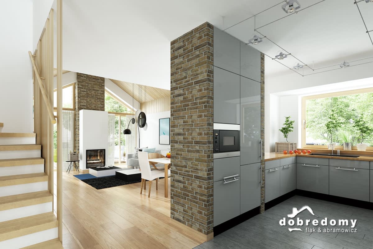 Elewacje pokryte tynkiem strukturalnym w systemie ociepleń Termo Organika, okładziną klinkierową oraz drewnianą. W projekcie zastosowano okna dachowe marki FAKRO. Pokrycie dachu - dachówka ceramiczna lub cementowa CREATON.