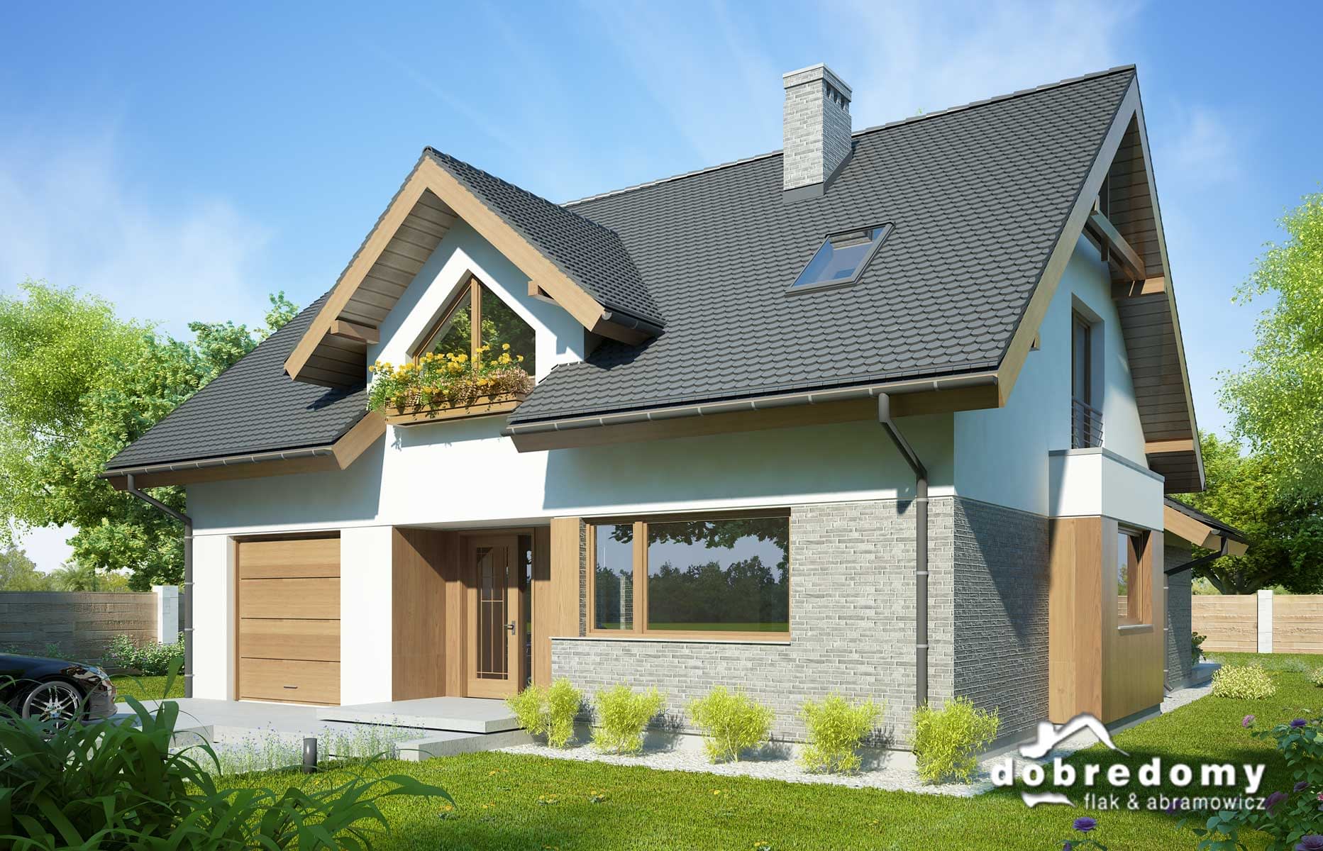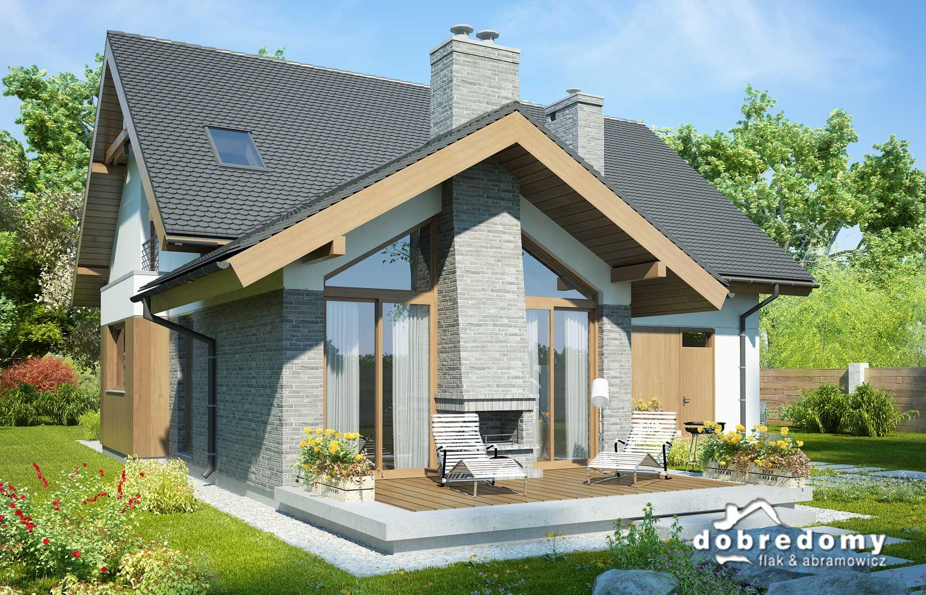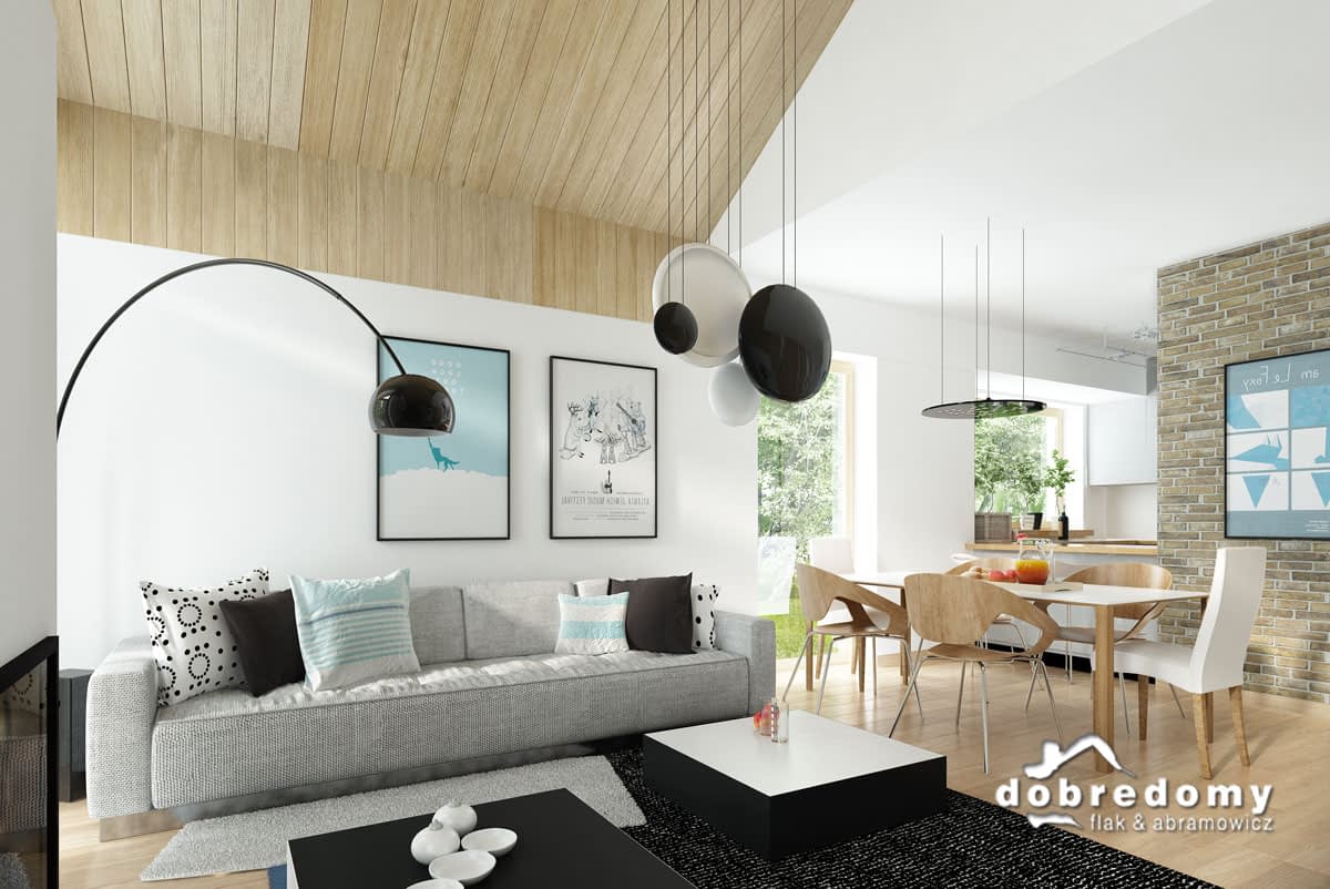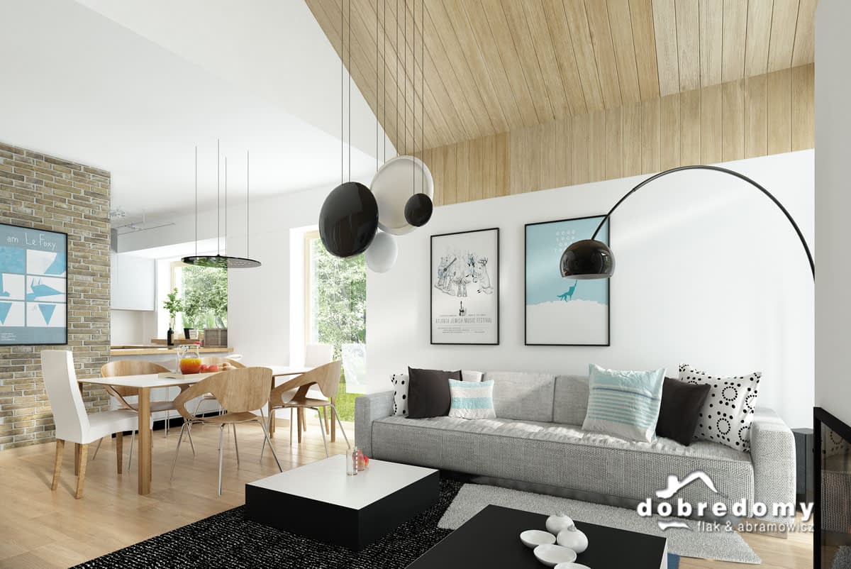 Elewacje pokryte tynkiem strukturalnym w systemie ociepleń Termo Organika, okładziną klinkierową oraz drewnianą. W projekcie zastosowano okna dachowe marki FAKRO. Pokrycie dachu - dachówka ceramiczna lub cementowa CREATON.