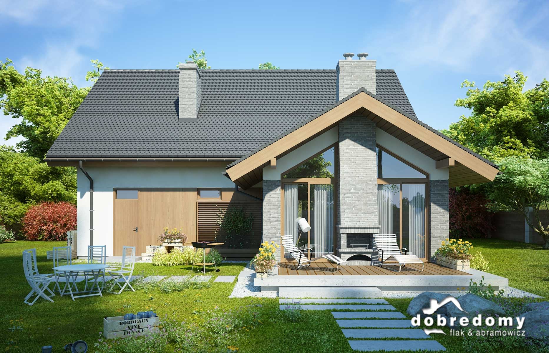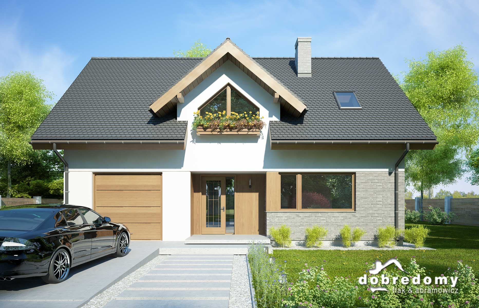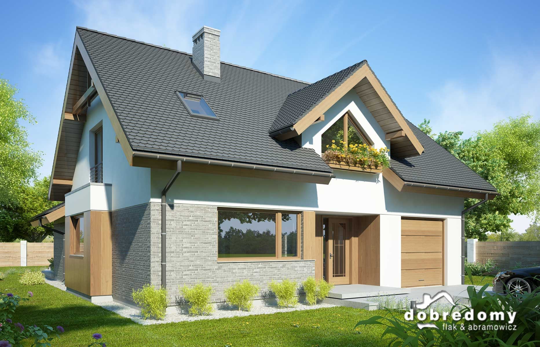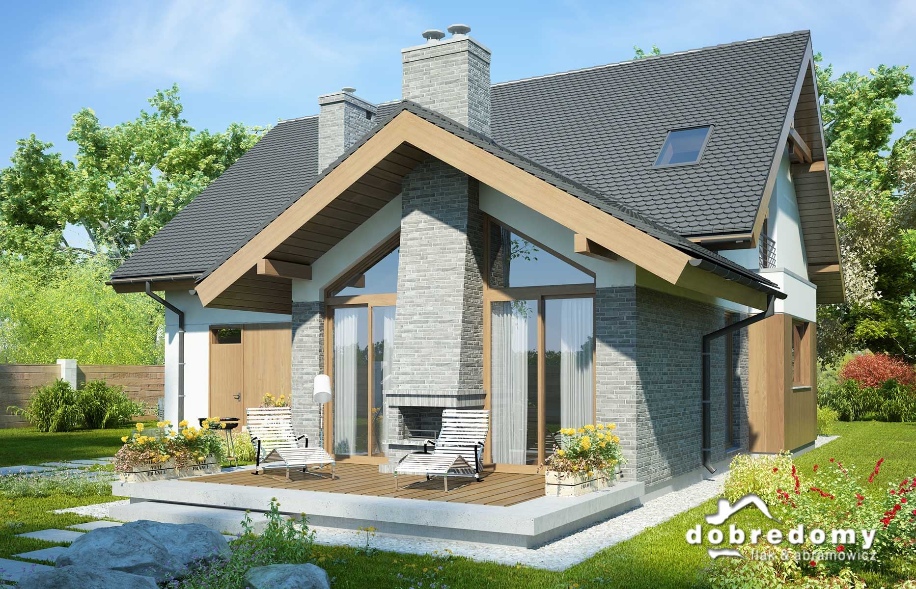 Elewacje pokryte tynkiem strukturalnym w systemie ociepleń Termo Organika, okładziną klinkierową oraz drewnianą. W projekcie zastosowano okna dachowe marki FAKRO. Pokrycie dachu - dachówka ceramiczna lub cementowa CREATON.