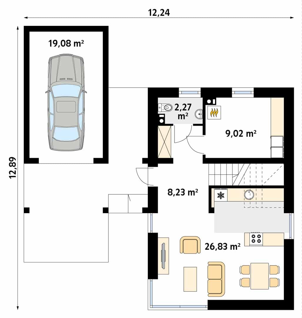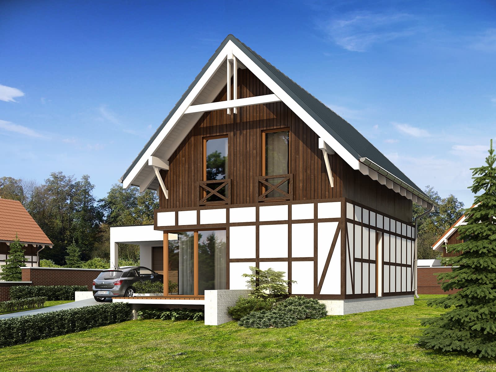 Niewielki dom mieszkalny przeznaczony dla 4-osobowej rodziny. Na stosunkowo niewielkiej powierzchni zaprojektowano bogaty program funkcjonalny. Na parterze znajduje się przestronny salon z aneksem kuchennym oraz duże wielofunkcyjne pomieszczenie gospodarcze, które z powodzeniem może zostać zaadaptowane na kotłownię na paliwo stałe. Na poddaszu znajduje się funkcjonalna łazienka oraz trzy sypialnie. Sypialnia rodziców dodatkowo posiada oddzielną garderobę.Konstrukcja