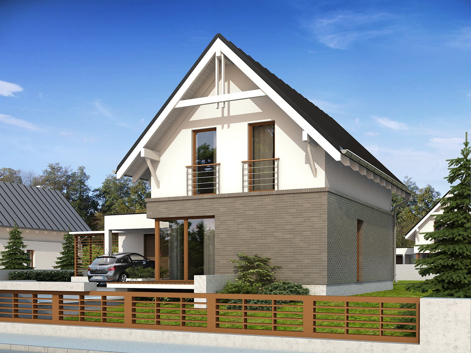 Niewielki dom mieszkalny przeznaczony dla 4-osobowej rodziny. Na stosunkowo niewielkiej powierzchni zaprojektowano bogaty program funkcjonalny. Na parterze znajduje się przestronny salon z aneksem kuchennym oraz duże wielofunkcyjne pomieszczenie gospodarcze, które z powodzeniem może zostać zaadaptowane na kotłownię na paliwo stałe. Na poddaszu znajduje się funkcjonalna łazienka oraz trzy sypialnie. Sypialnia rodziców dodatkowo posiada oddzielną garderobę.Konstrukcja