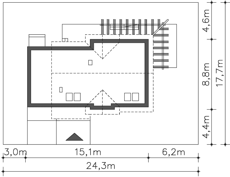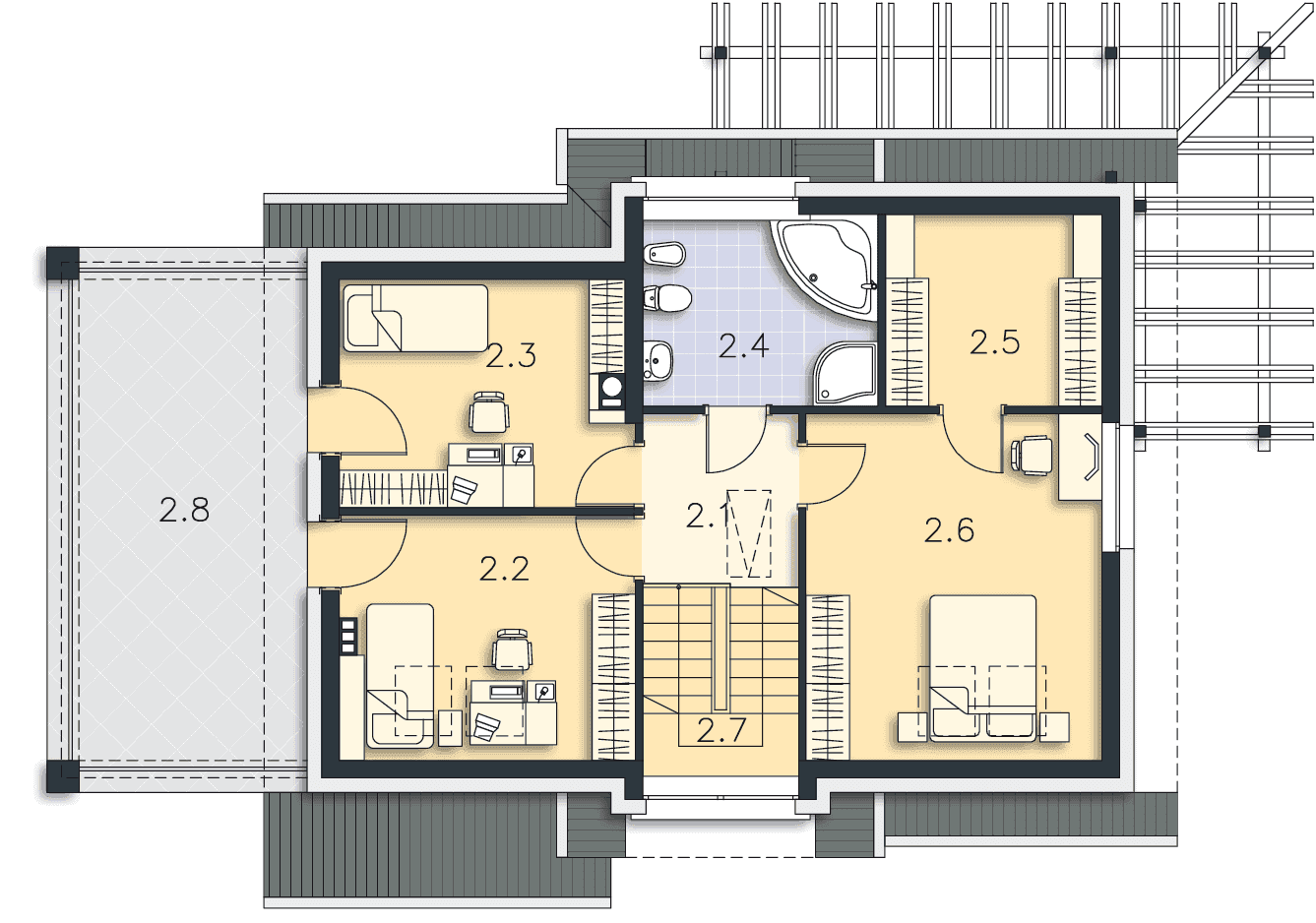 Projekt Tokio III, w odróżnieniu od Tokio, to wersja dla tych, którzy posiadają działkę z wjazdem od północy. Przestawiliśmy część wejściową z garażem, a pozostałe elementy są bez zmian. Jakby nie patrzeć, ten projekt wyróżnia się spośród innych niezależnie od wersji. Posiada to trudne do określenia „coś”, które może kryje się w prostocie bryły urozmaiconej ładnym, nowoczesnym detalem, a może w proporcjach. Niewątpliwie jednak połączona została tu ładna bryła z doskonałym układem funkcjonalnym, pozwalającym na stworzenie naprawdę ładnych wnętrz.