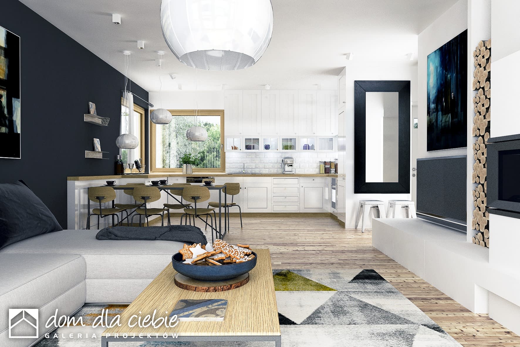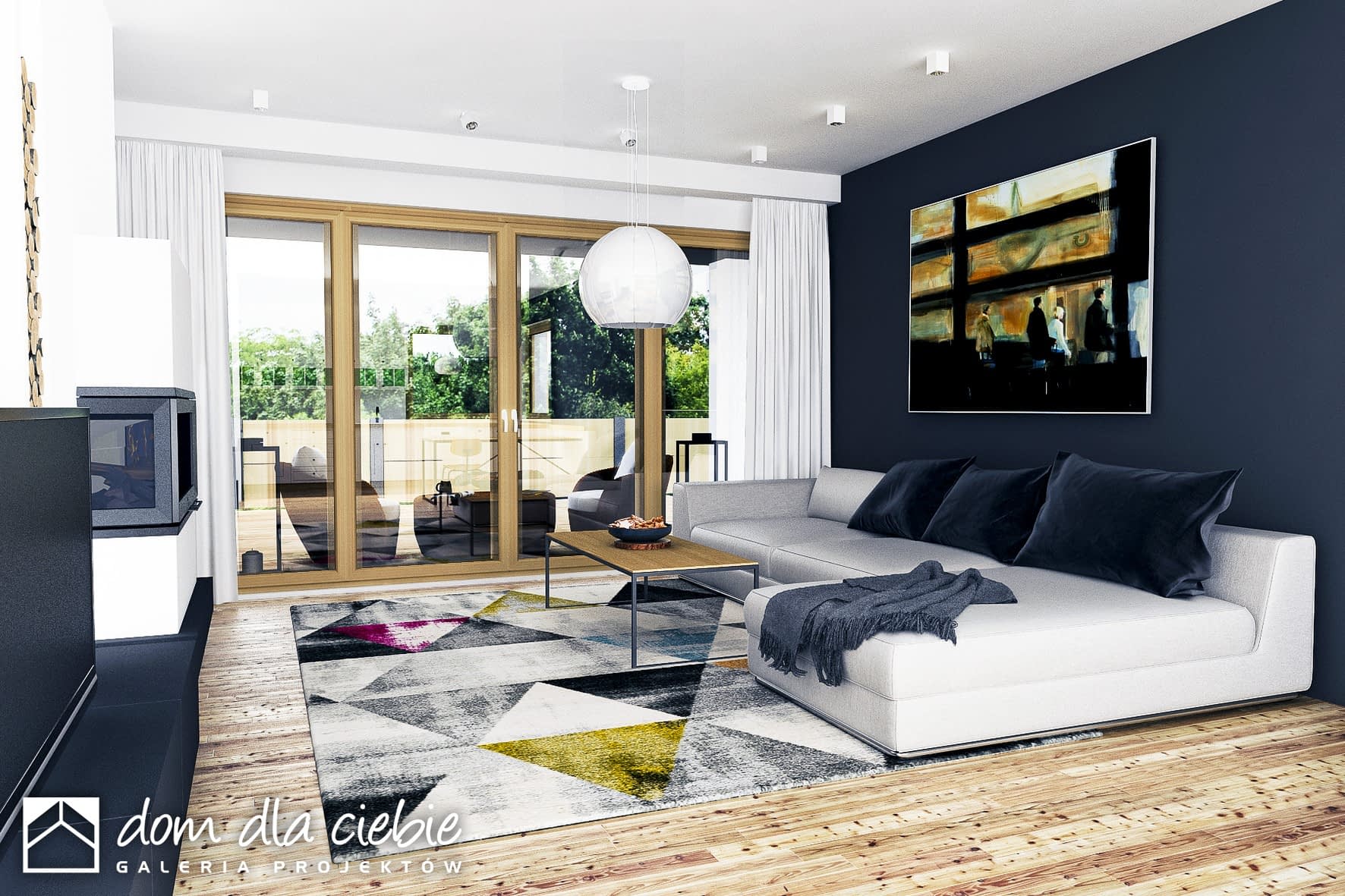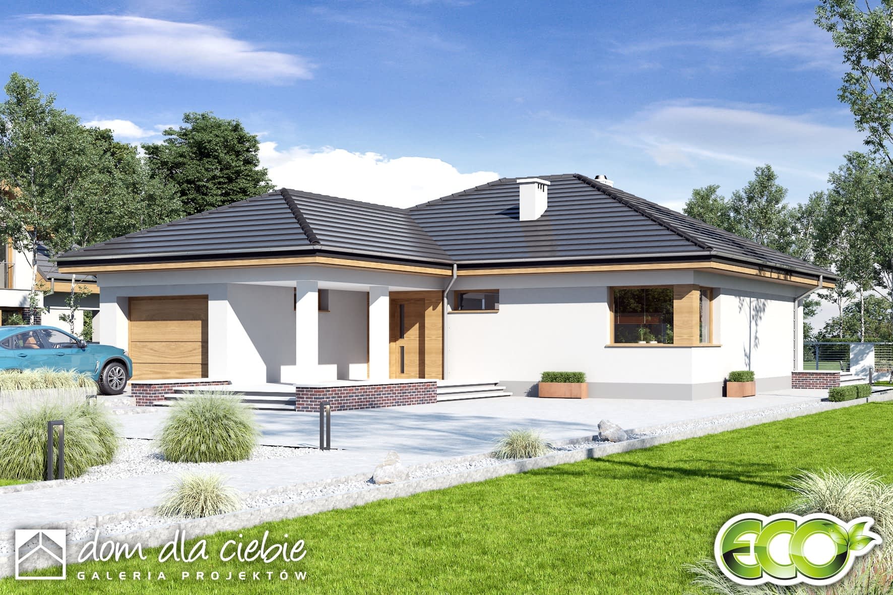 Dom parterowy, niepodpiwniczony, dla 4-5cio osobowej rodziny o prostej i wyważonej bryle z poddaszem przeznaczonym na cele magazynowe. Czytelny i funkcjonalny rozkład pomieszczeń oraz wyraźny ich podział na strefy dzienną i nocną daje poczucie komfortu i wygody. Strefa dzienną zaprojektowano jako otwartą, łączącą wejście główne i część ogrodową działki. Strefę nocną (3 sypialnie) zorganizowano wokół centralnie umieszczonej łazienki, garderoby i spiżarni. Z salonu zaprojektowano wyjście na zadaszony taras. Centralnie zlokalizowany kominek umożliwia rozprowadzenie ciepła po całym domu.