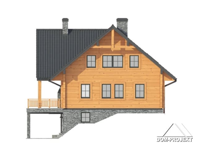 Dom z bali drewnianych. Podpiwniczony. Duży salon z aneksem kuchennym, kominkiem i wyjściami na zadaszony taras. Pokój, łazienka i spiżarka. Na poddaszu dwa pokoje, łazienka, komunikacja i antresola. W piwnicach garaż, kotłownia , piwnice i komunikacja.Rzuty