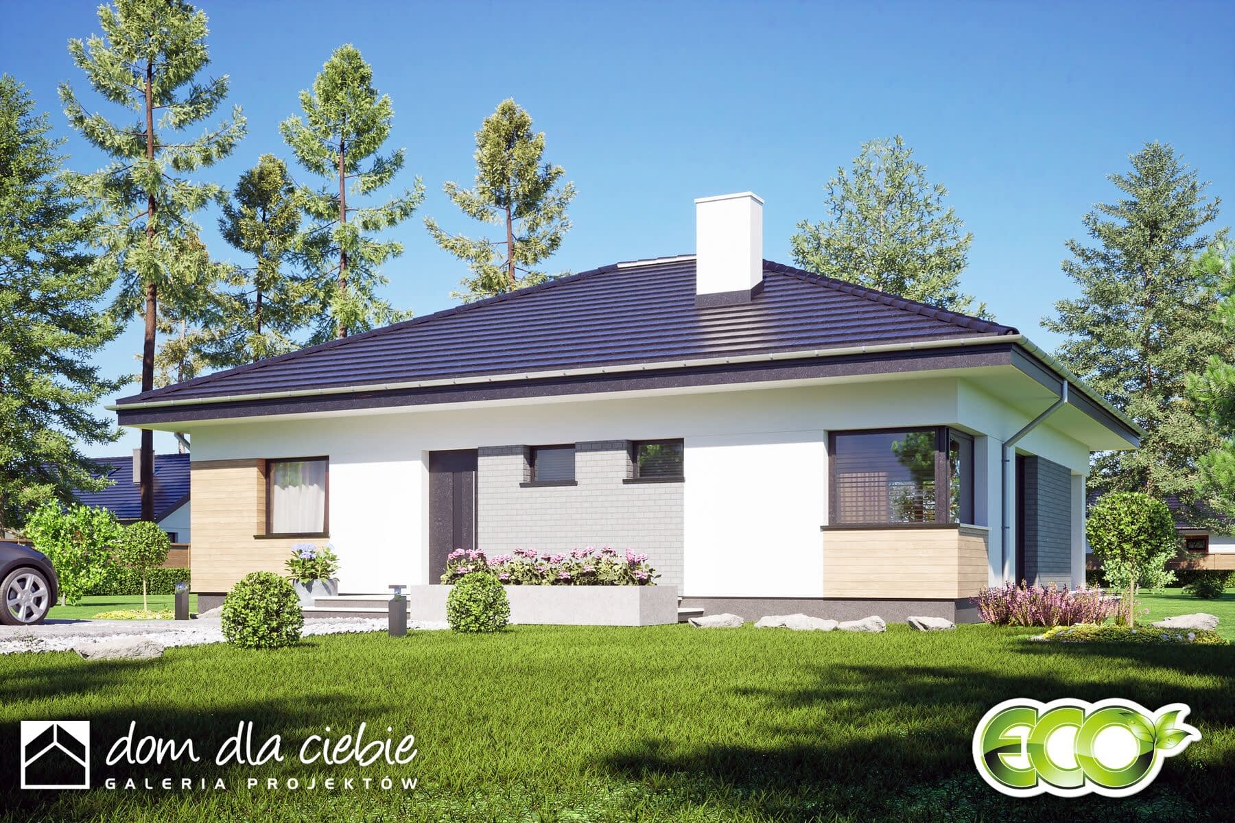 Topaz to niewielki projekt domu parterowego przeznaczony dla 4 osób, z czterospadowym symetrycznym dachem.