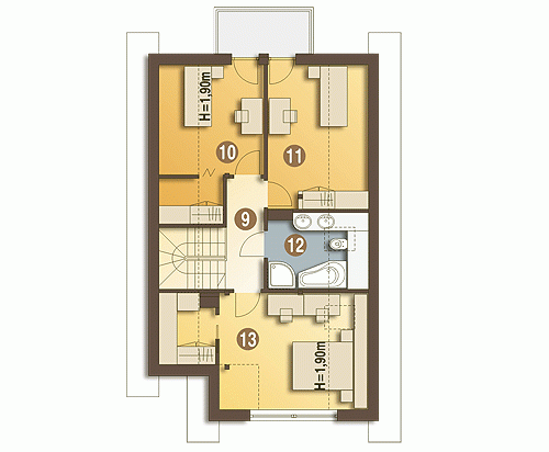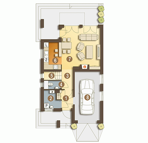 Tosia trend to projekt Tosia w nowoczesnej szacie. Zgrabny, niewielki dom jednorodzinny, zaprojektowany na wąską działkę, dla 4 osobowej rodziny, nadający się na dom całoroczny lub letniskowy. Drzwi wejściowe oraz jedno z wyjść tarasowych chronione są przed opadami funkcjonalnymi podcieniami. Z wiatrołapu dostępne jest wygodne pom. gospodarcze z piecem CO oraz wbudowany garaż. Kuchnię, w zależności od upodobań inwestorów, można pozostawić otwartą na ustawny pokój dzienny lub zamknąć ścianką działową. Na poddaszu zaprojektowano 3 wygodne sypialnie oraz dość dużą łazienkę.