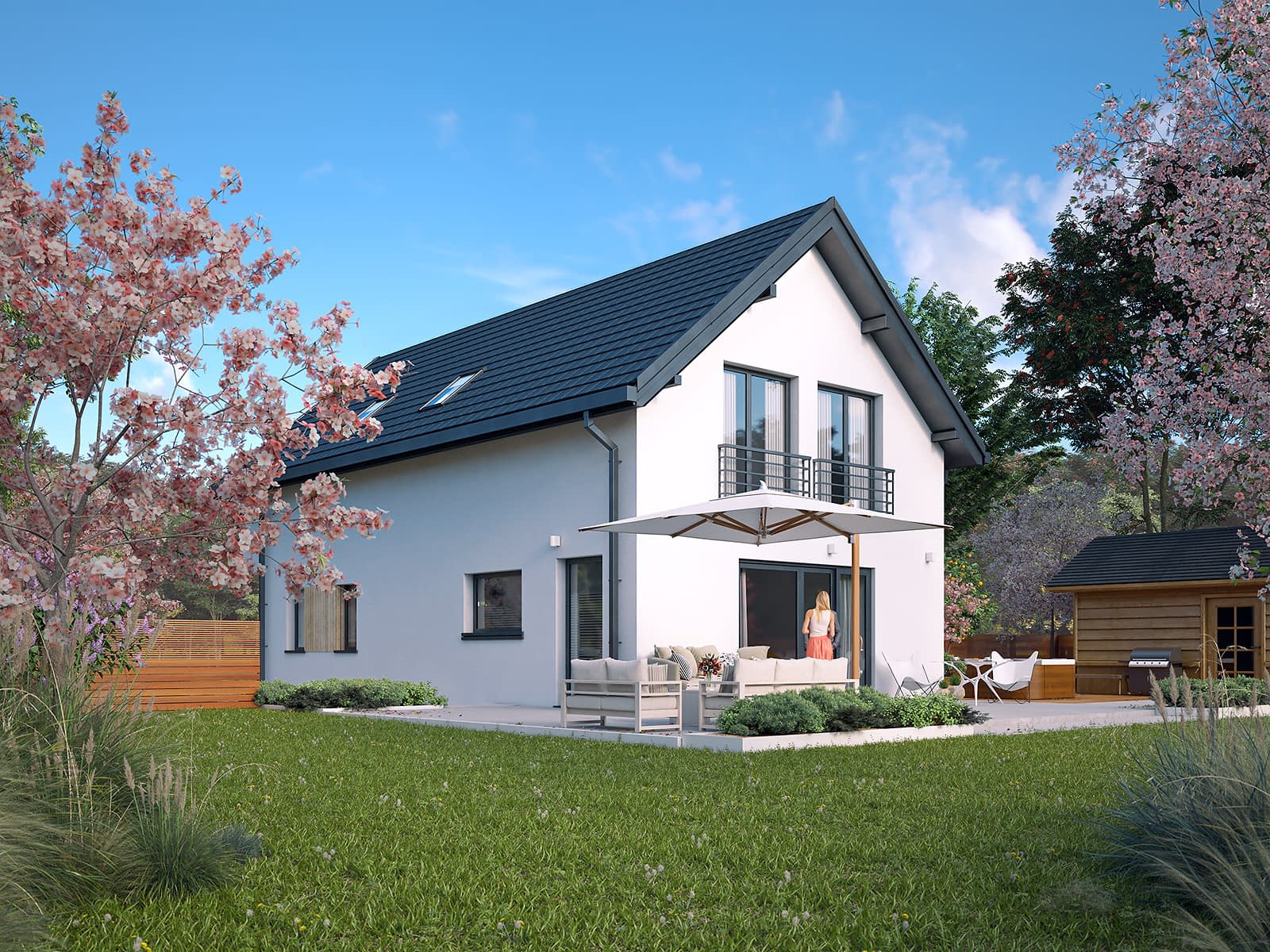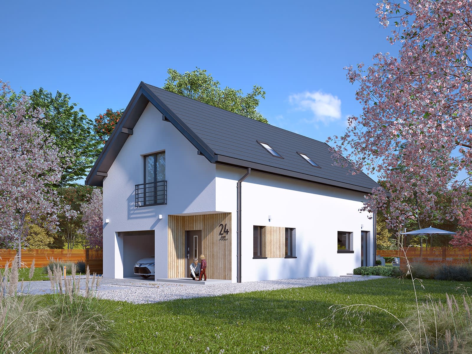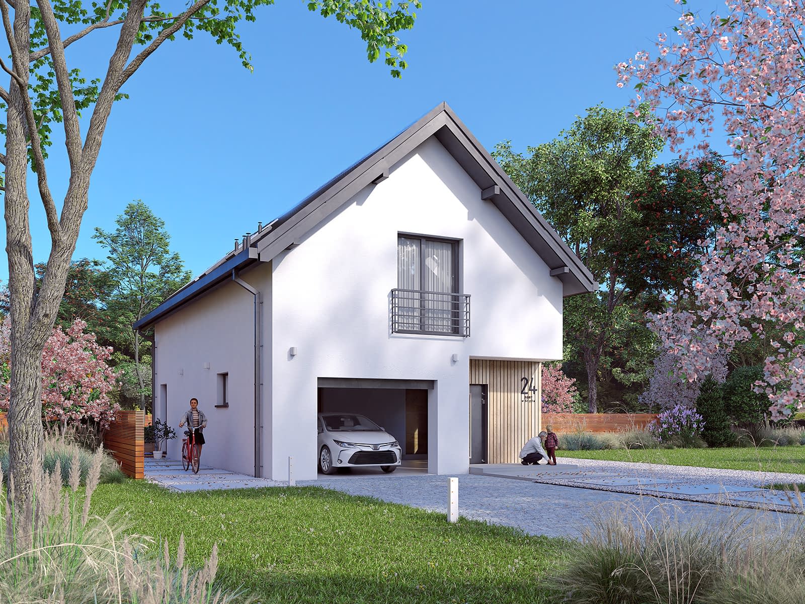 Trakt to projekt domu z użytkowym poddaszem, którego powierzchnię rozplanowano na 123 m2. Projekt utrzymano w nowoczesnym stylu. Będzie idealny na wąską działkę. Na parterze zaprojektowano otwartą część dzienna z salonem, kuchnią i jadalnią. Przewidziano tu liczne przeszklenia. Na poddaszu pojawiły się trzy sypialnie oraz gabinet do pracy i nauki.Konstrukcja