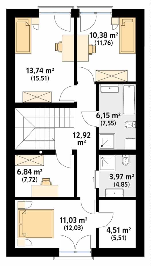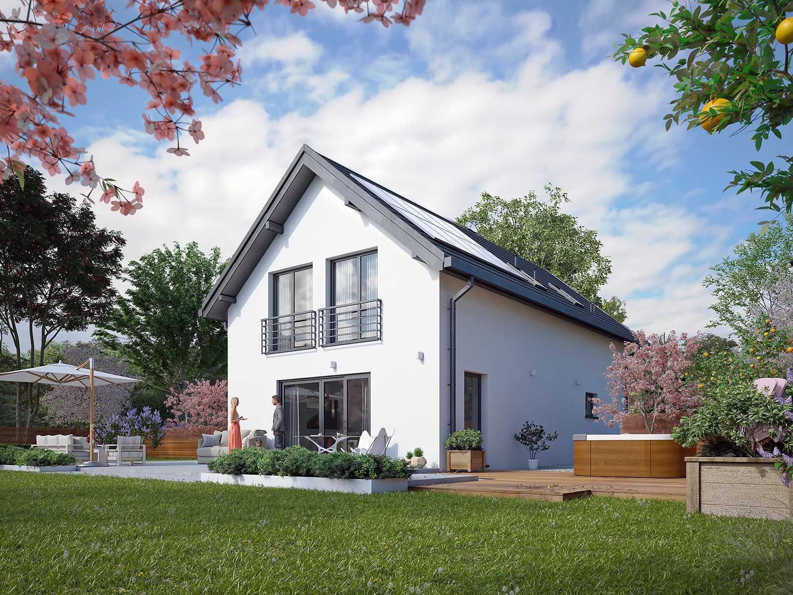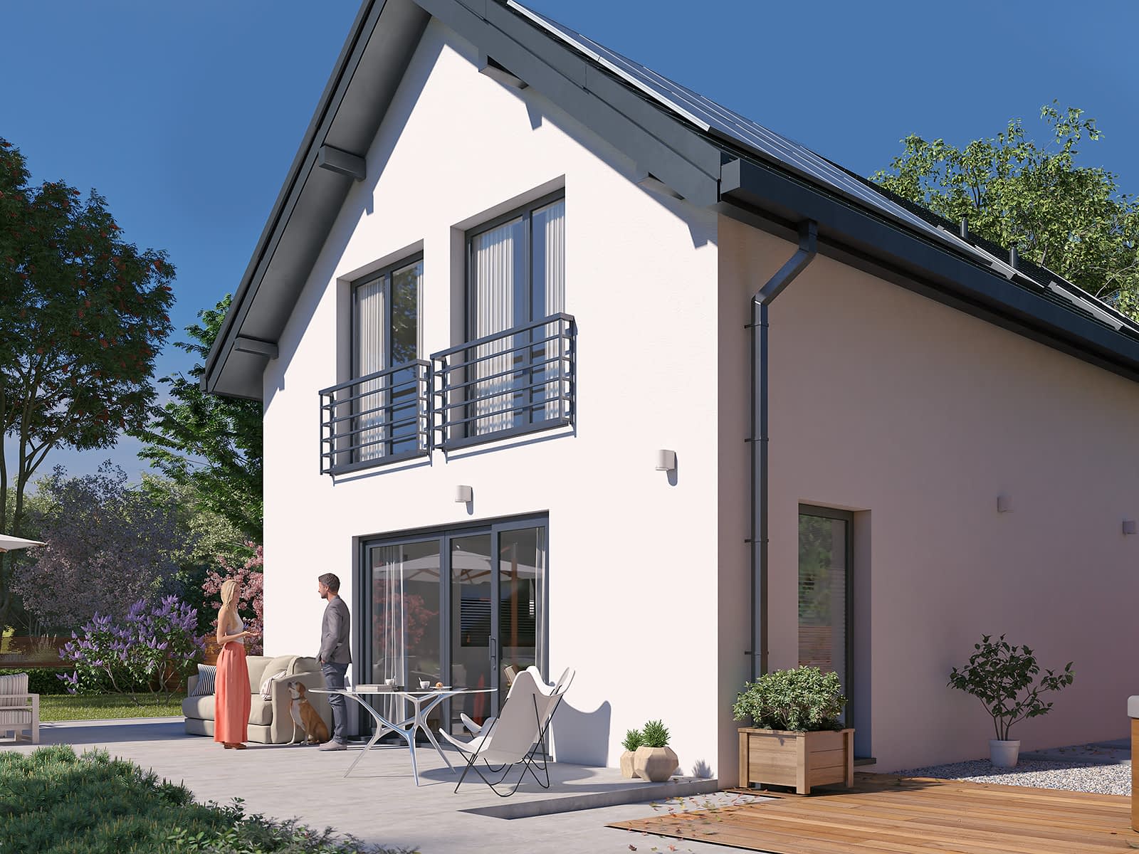 Trakt to projekt domu z użytkowym poddaszem, którego powierzchnię rozplanowano na 123 m2. Projekt utrzymano w nowoczesnym stylu. Będzie idealny na wąską działkę. Na parterze zaprojektowano otwartą część dzienna z salonem, kuchnią i jadalnią. Przewidziano tu liczne przeszklenia. Na poddaszu pojawiły się trzy sypialnie oraz gabinet do pracy i nauki.Konstrukcja