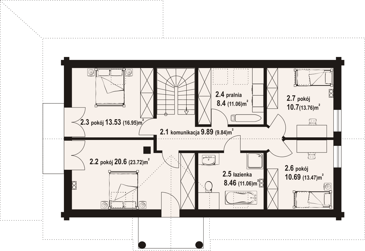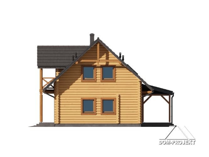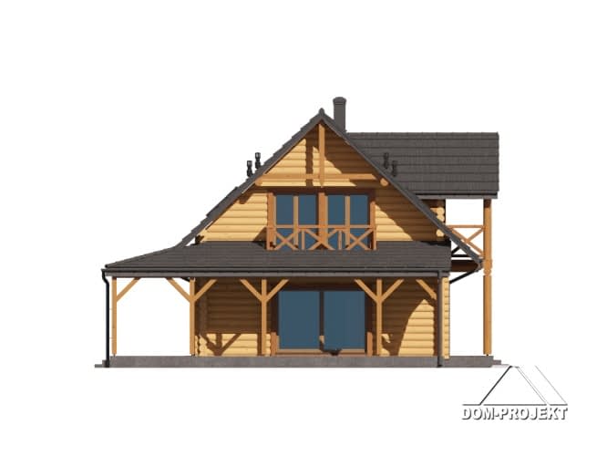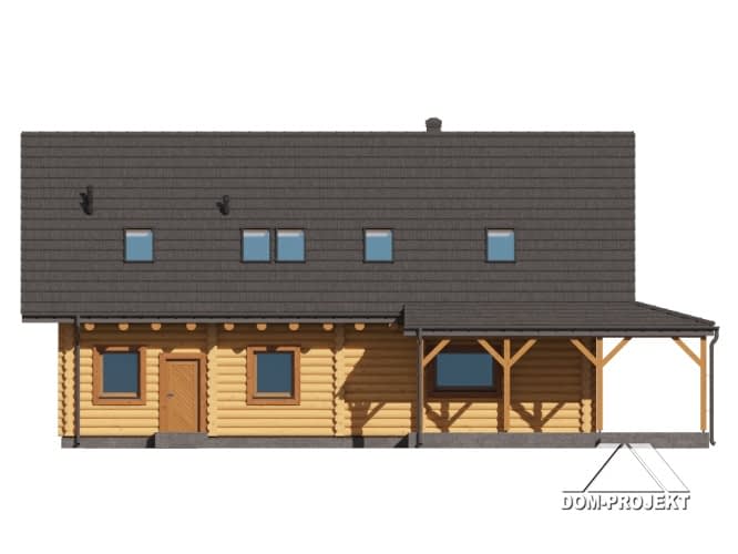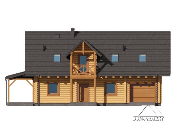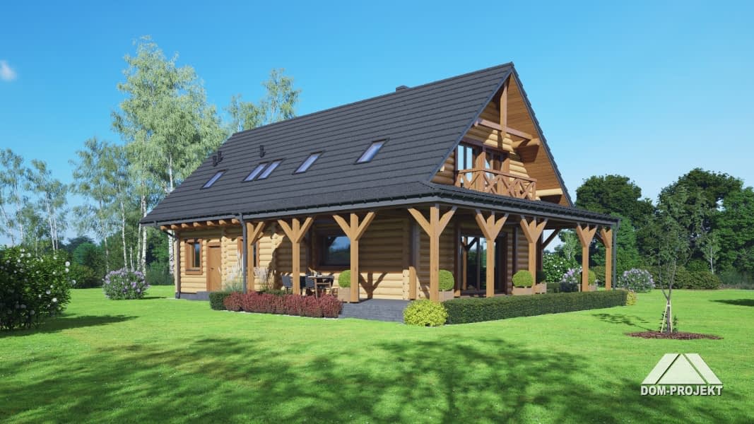 Projekt domu z bali, z poddaszem użytkowym, o klasycznej elewacji i bardzo wygodnym układzie funkcjonalnym. Sercem domu jest salon z kominkiem i wyjściem na zadaszony taras oraz otwarta kuchnia z dostępem do spiżarki. Ponadto na parterze dodatkowy pokój, łazienka oraz wiatrołap z przejściem do garażu i pomieszczenia gospodarczego. Na poddaszu cztery pokoje, łazienka oraz bardzo praktyczna pralnia.Rzuty