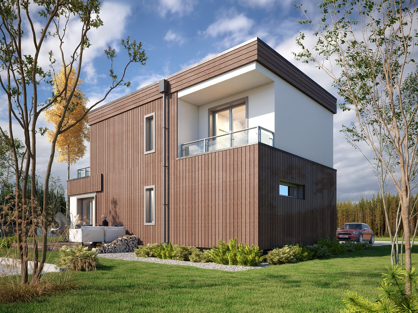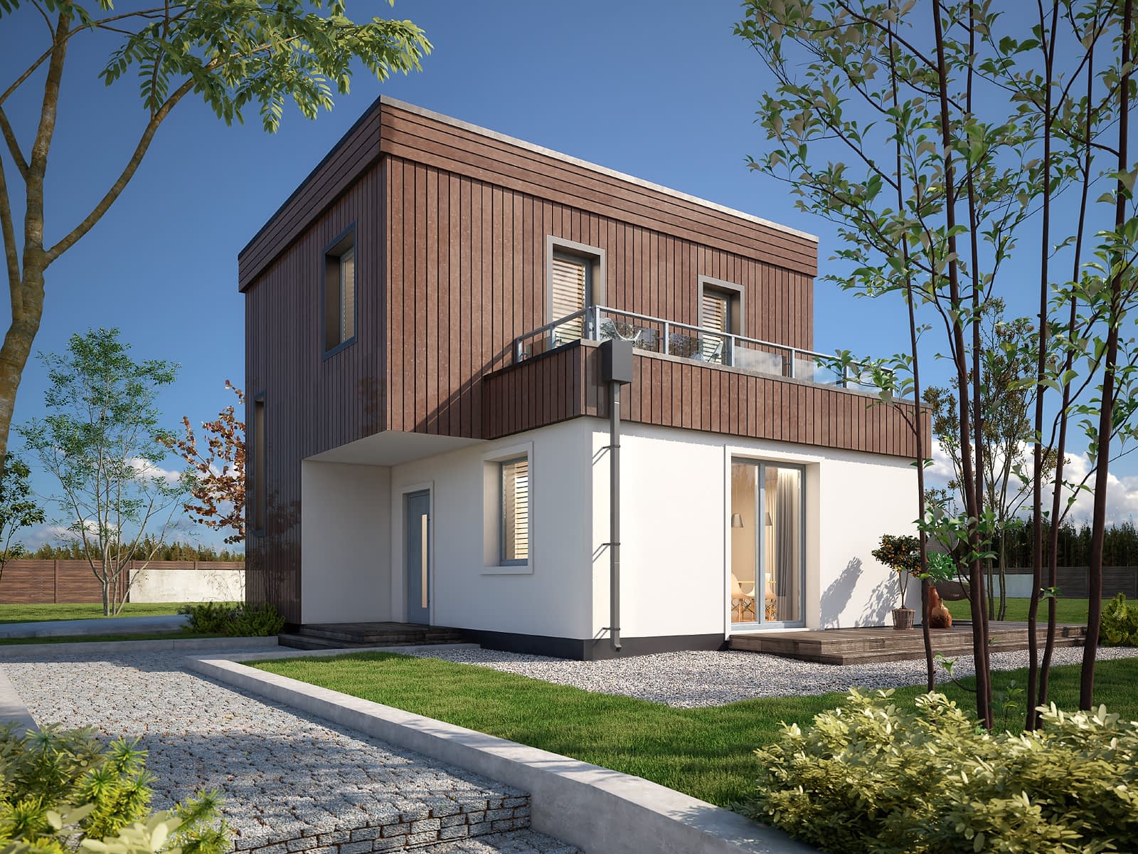 Trawertyn 2 to nowoczesny projekt domu o dwóch kondygnacjach, który wyróżnia się nowoczesną bryłą z płaskim dachem i efektownie wykończoną elewacją. Jasny tynk został połączony z brązową szalówką oraz szarą stolarką. Strefy użytkowe w projekcie zostały podzielone miedzy dwie kondygnacje. Na parterze znajduje się otwarta strefa dzienna z salonem, kuchnią oraz jadalnią. Salon został zaprojektowany od frontu, dzięki czemu projekt idealnie wpasuje się na działkę z wjazdem od południa. Na parterze znajduje się również toaleta oraz pomieszczenie gospodarcze prowadzące do jednostanowiskowego garażu. Strefa nocna została zaprojektowano na piętrze i składa się z trzech sypialni oraz ogólnodostępnej łazienki. Do dyspozycji mieszkańców na piętrze znajduje się taras nad częścią dzienną oraz balkon w formie loggi od strony ogrodowej. Na parterze strefę wypoczynkową na świeżym powietrzu tworzy taras biegnący wzdłuż dwóch ścian budynku.Konstrukcja