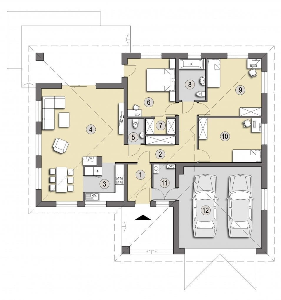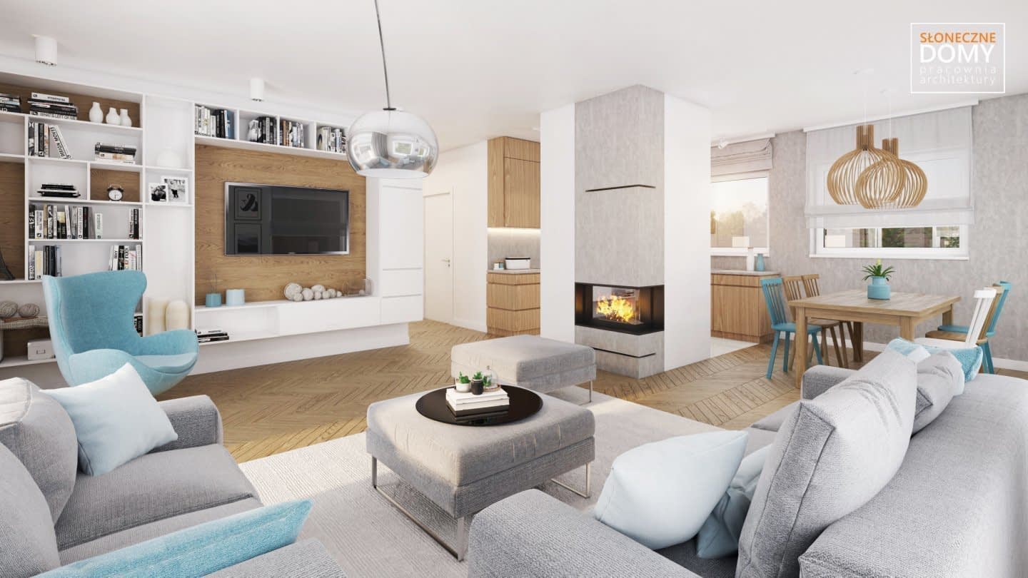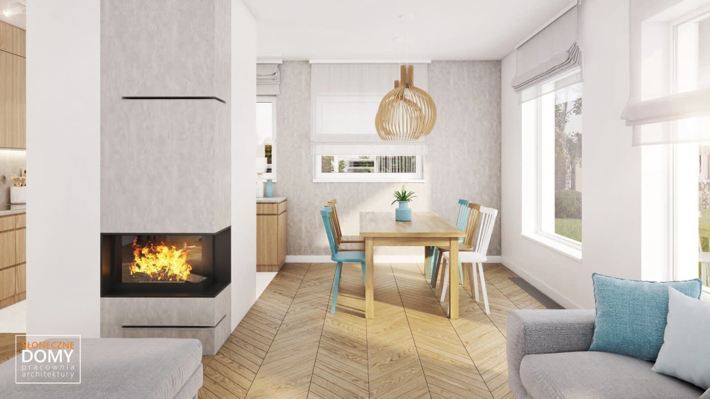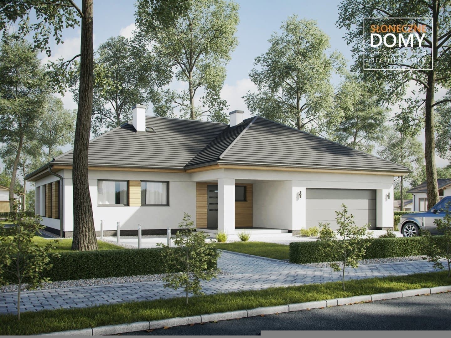 Układ funkcjonalny domu został podzielony na strefę dzienną i nocną. Kuchnia od strony ulicy została zaprojektowana jako pomieszczenie otwarte na jadalnie. Salon z wyjściem na taras i kominkiem usytuowanym w centralnej części to miejsce doskonałe do wypoczynku. Strefa nocna to trzy wygodne sypialnie i łazienka. Pozostałe pomieszczenia to w.c., pomieszczenie gospodarcze i dwustanowiskowy garaż.