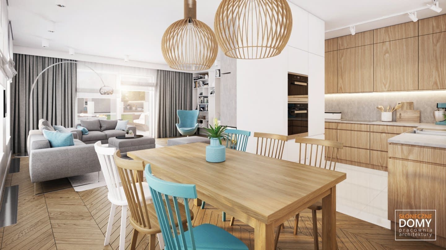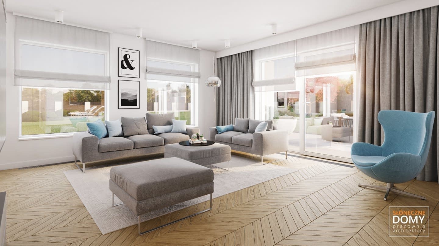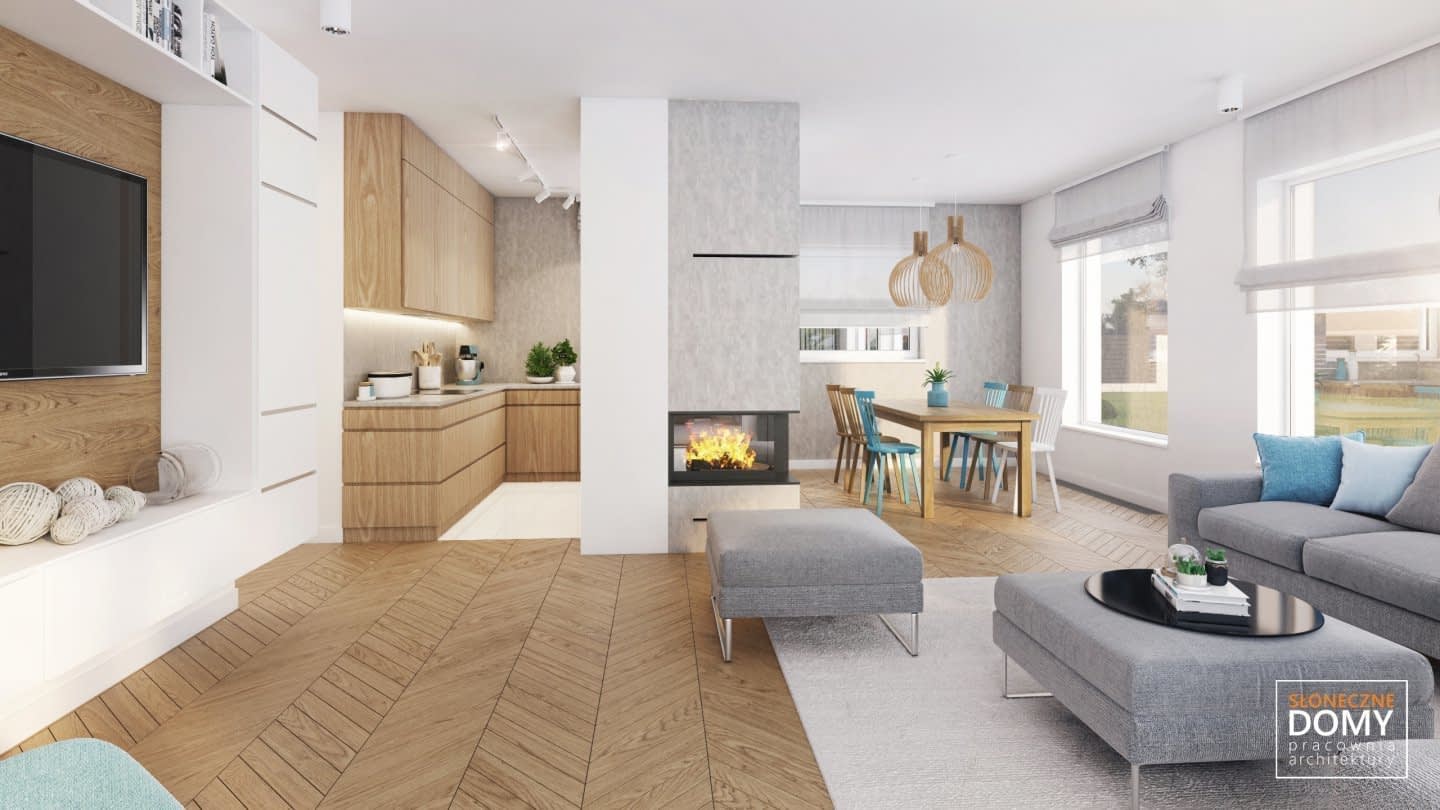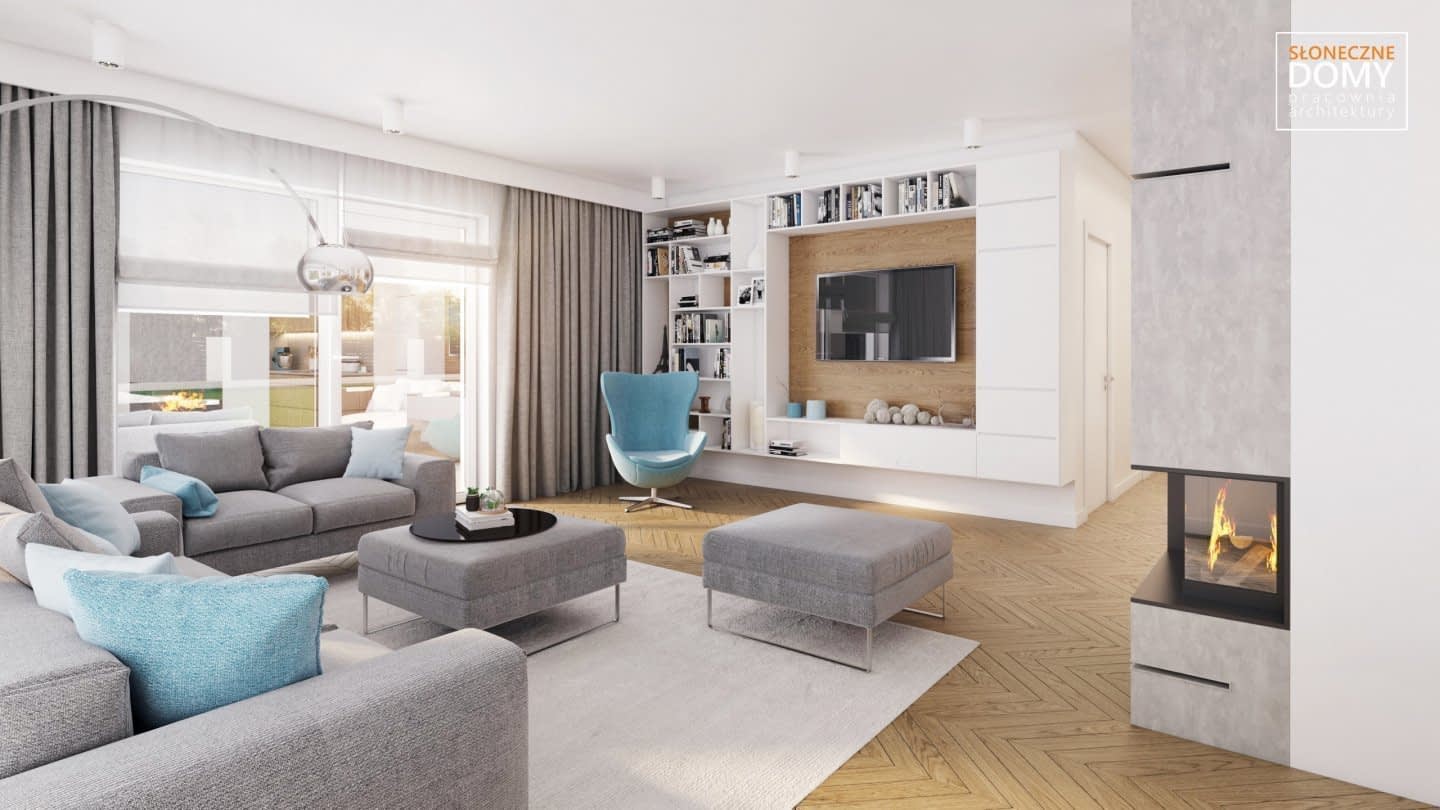 Układ funkcjonalny domu został podzielony na strefę dzienną i nocną. Kuchnia od strony ulicy została zaprojektowana jako pomieszczenie otwarte na jadalnie. Salon z wyjściem na taras i kominkiem usytuowanym w centralnej części to miejsce doskonałe do wypoczynku. Strefa nocna to trzy wygodne sypialnie i łazienka. Pozostałe pomieszczenia to w.c., pomieszczenie gospodarcze i dwustanowiskowy garaż.