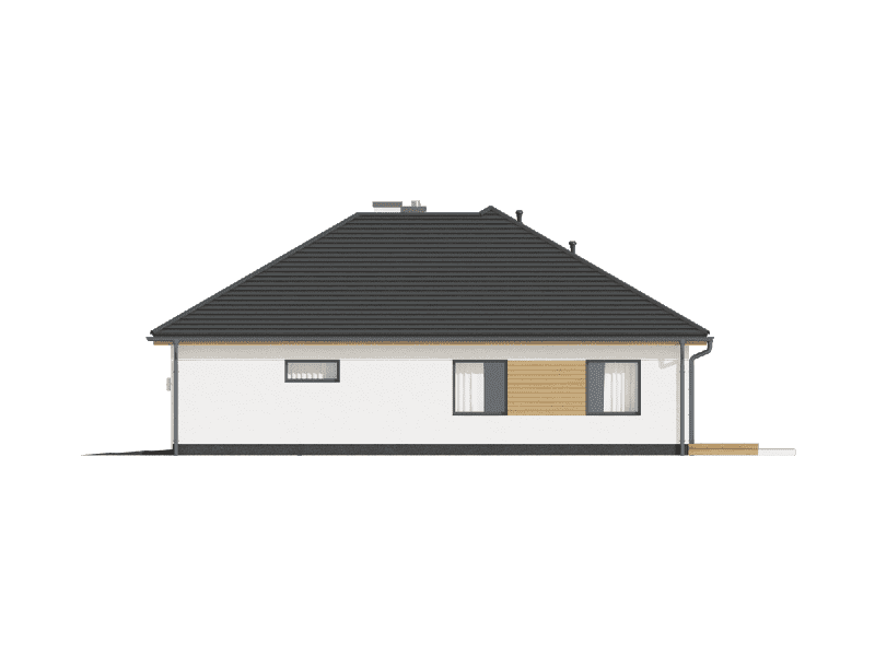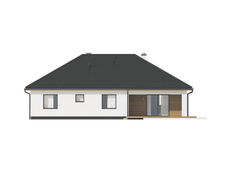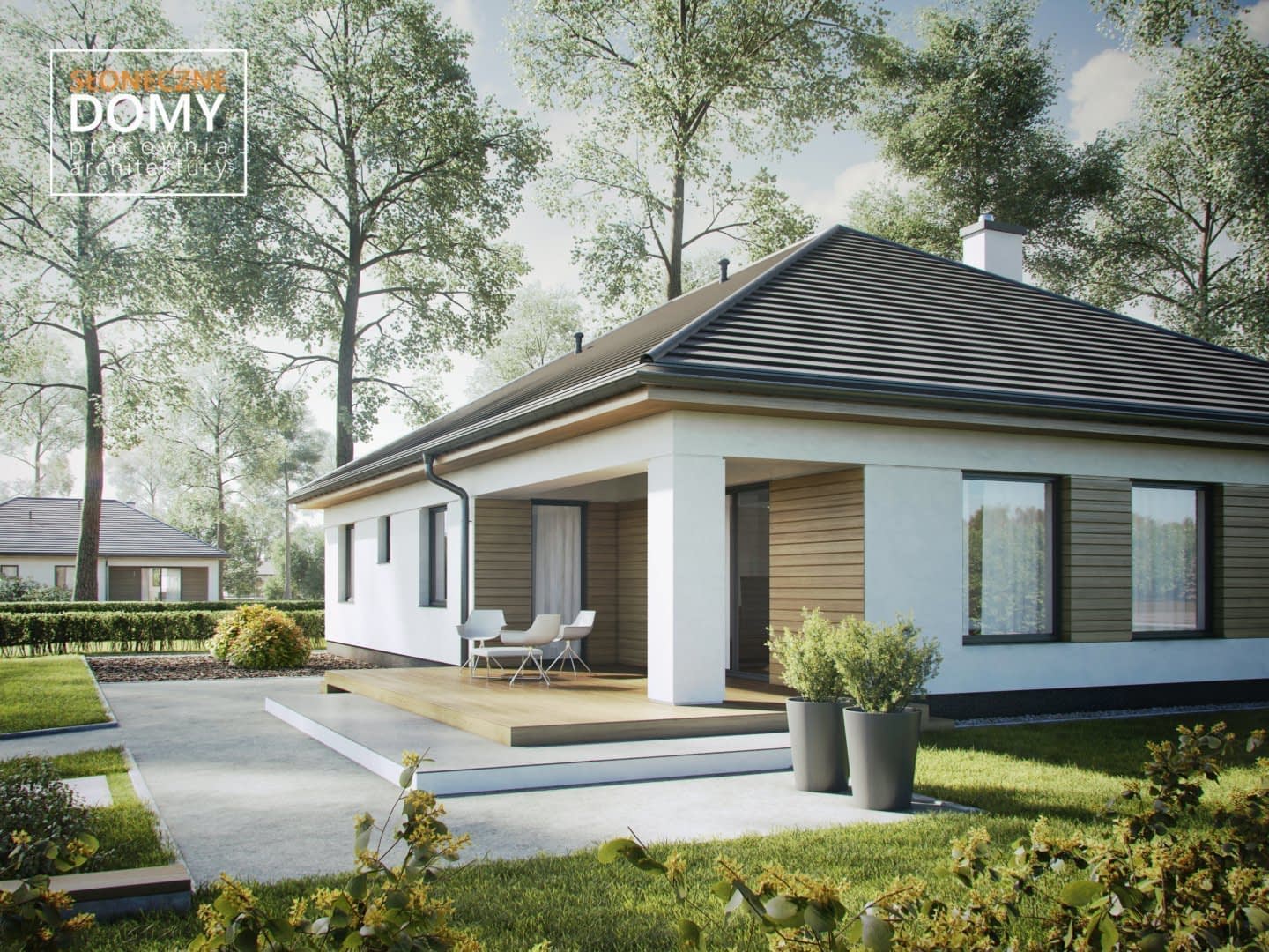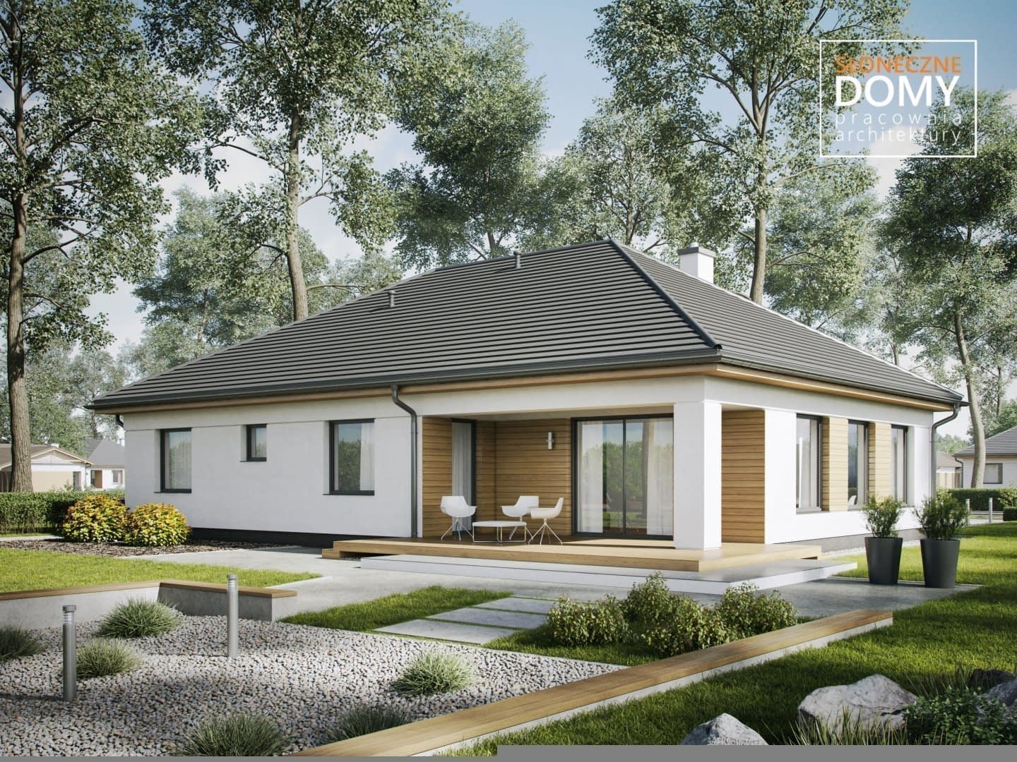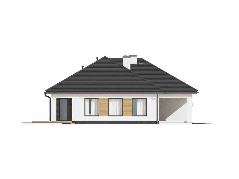 Projekt domu Trentino B to propozycja dla osób, które poszukują domu nowoczesnego, parterowego z funkcjonalnym wnętrzem. Na elewacji domu zastosowano ponadczasowe drewno. Inne charakterystyczne elementy dla tego projektu to zadaszony taras i podcień w strefie wejściowej.