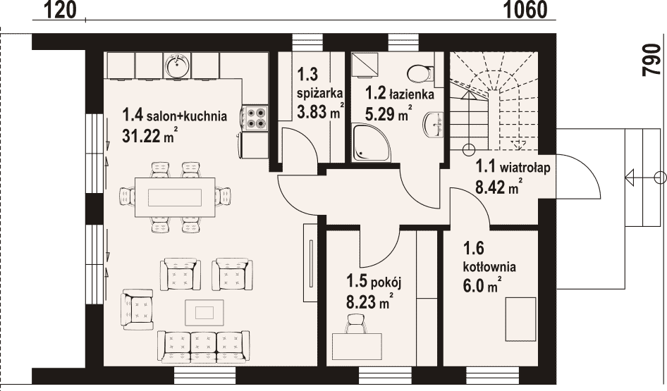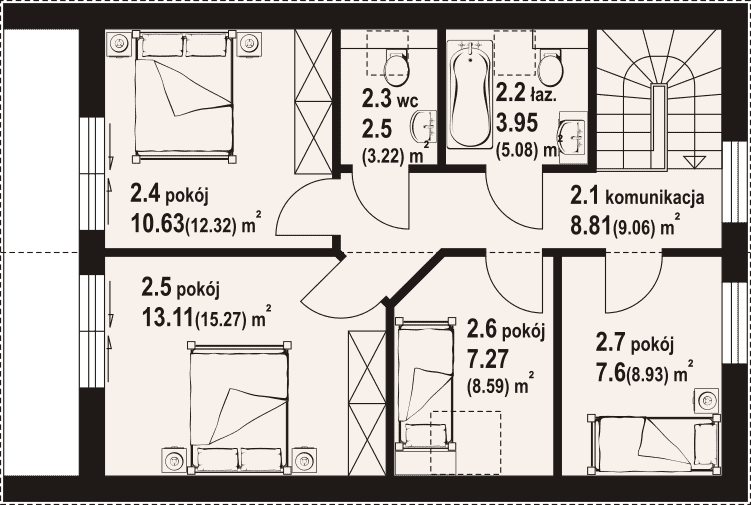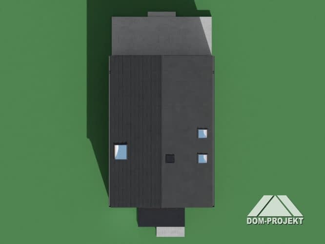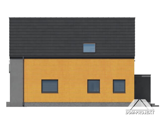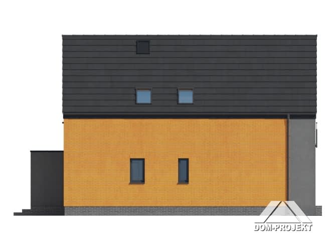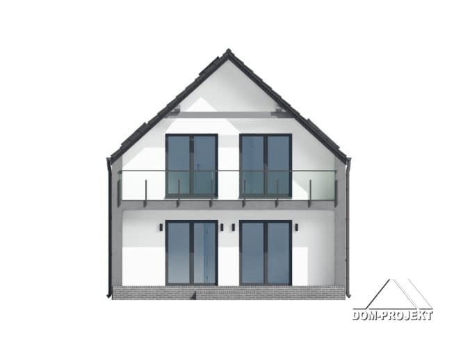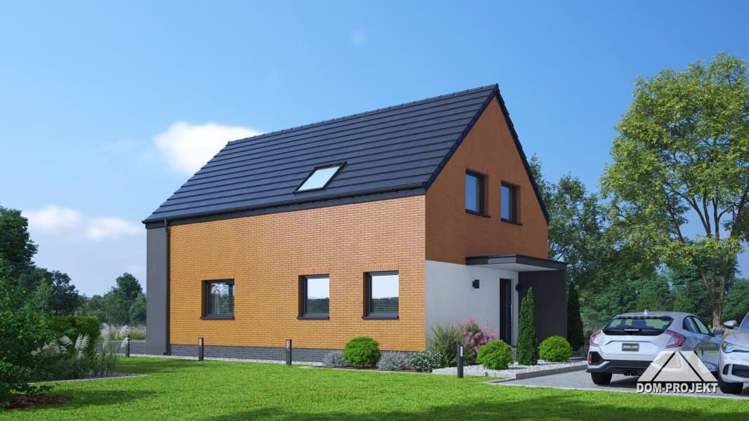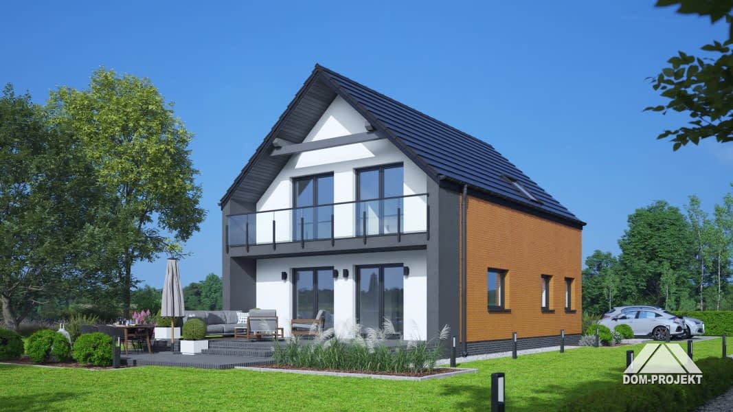 Dom z poddaszem użytkowym. Na parterze salon z aneksem kuchennym oraz wyjściem na taras. Pokój, kotłownia, wiatrołap, łazienka, spiżarka. Na poddaszu cztery pokoje, wc, łazienka, komunikacja oraz balkon dostępny z dwóch pokoi. Zwarta bryła budynku oraz dach dwuspadowy sprzyjają szybkiej i taniej budowie oraz niskim kosztom eksploatacji.Rzuty