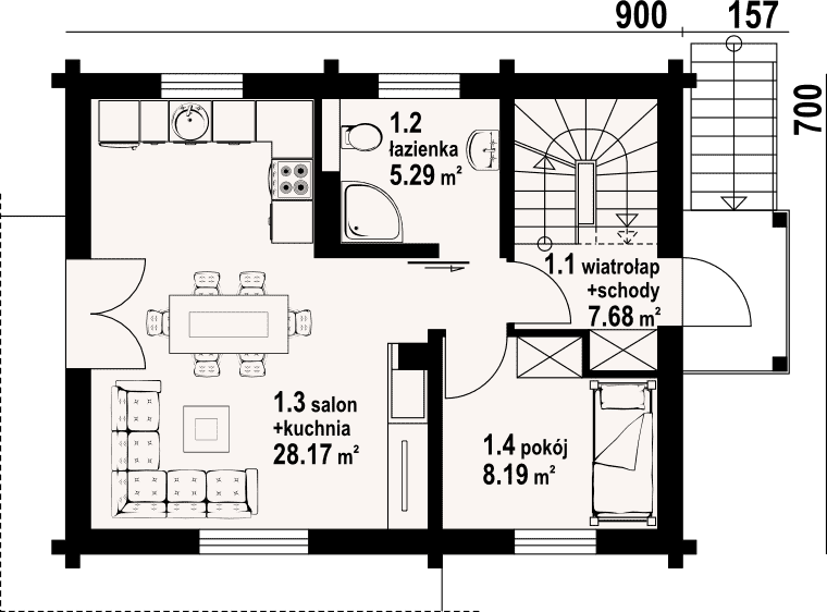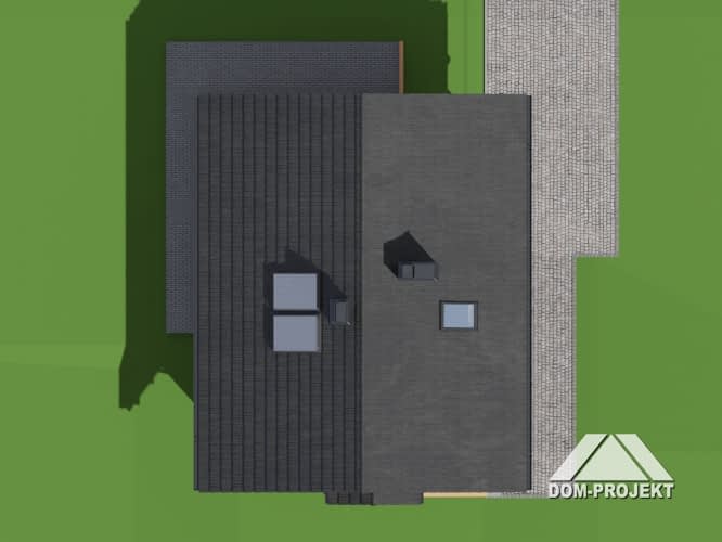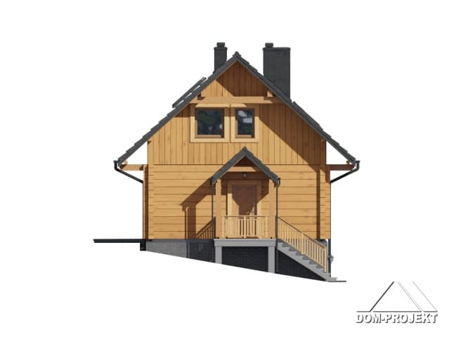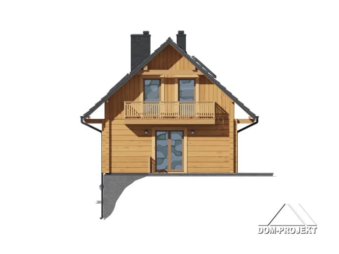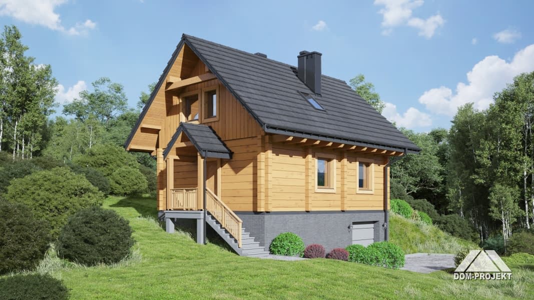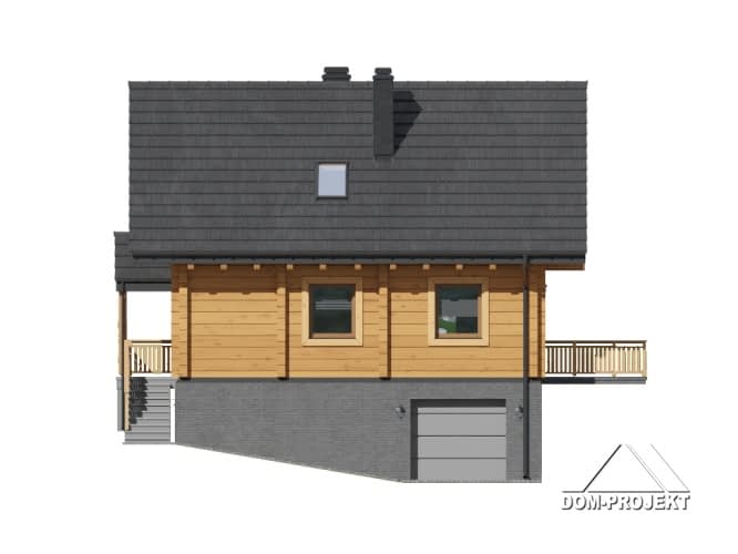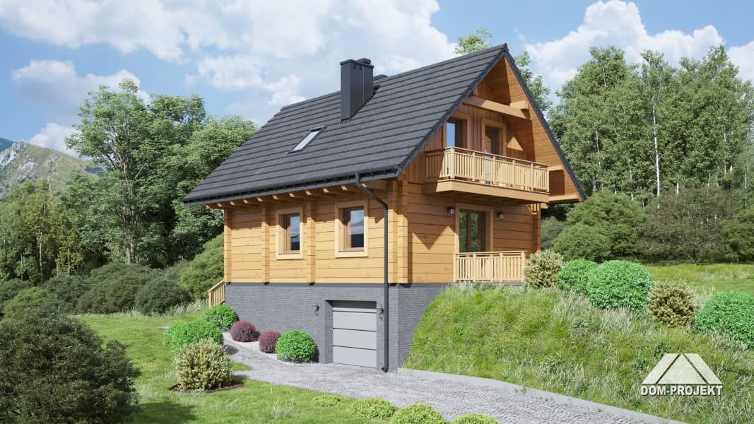 Dom z bali. Podpiwniczony. Na parterze salon z kuchnią, kominkiem i wyjściem na taras. Pokój, łazienka, wiatrołap. Na poddaszu trzy pokoje, łazienka i komunikacja. Z dwóch pokoi poddasza wyjście na balkon. W podpiwniczeniu garaż, pralnia, komunikacja i piwnica. Zwarta bryła budynku i dach dwuspadowy sprzyjają szybkiej i taniej budowie i niskim kosztom eksploatacji.Rzuty