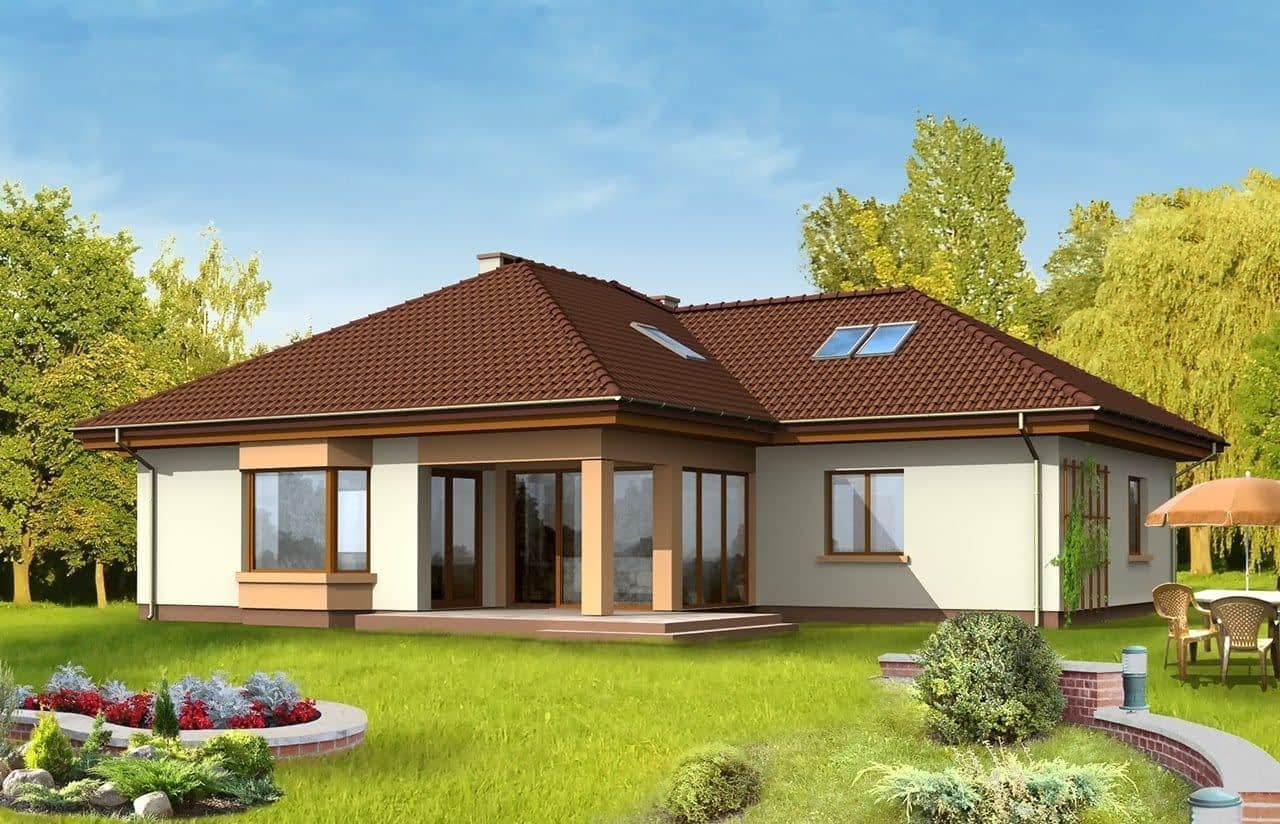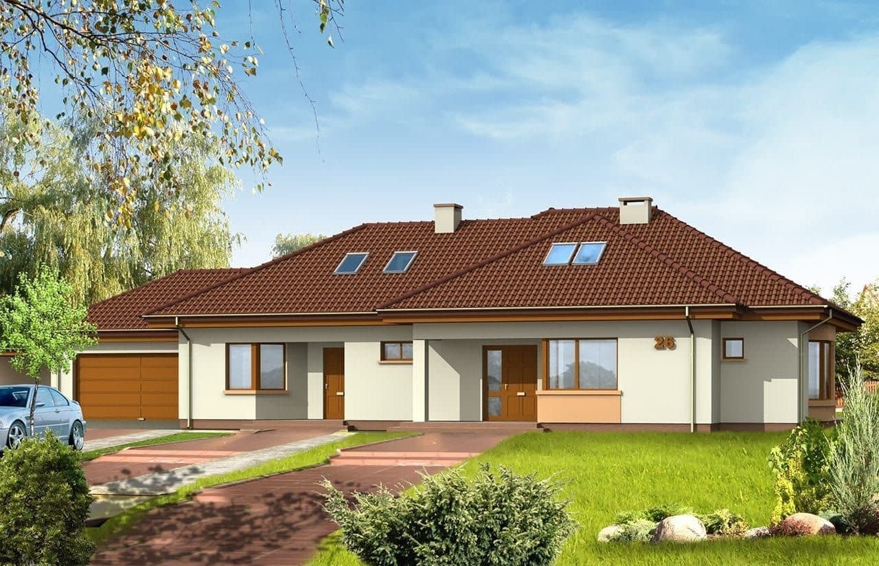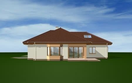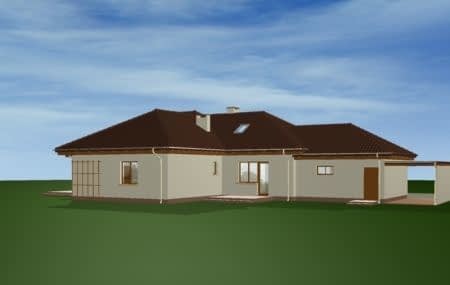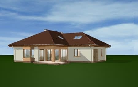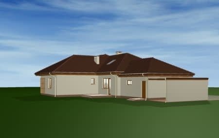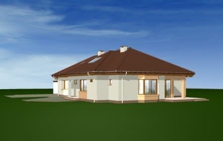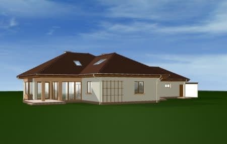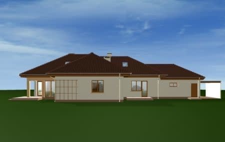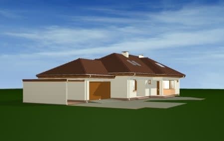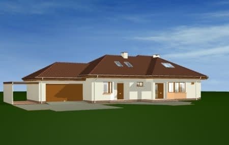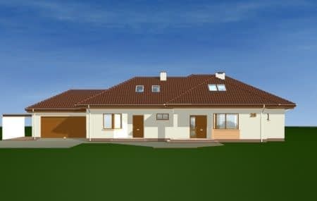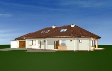 Projekt domu Trzypokoleniowy to rozległy budynek. Dom zaprojektowano z myślą o dużej, trzypokoleniowej rodzinie. Zawiera oddzielne mieszkanie dla dziadków lub dorosłych dzieci. Osobne mieszkanie może też pełnić funkcję pracowni lub biura. Dom Trzpokoleniowy zaprojektowano tak, aby mieszkańcy mieli maksymalny kontakt z ogrodem - duże przeszklenia i drzwi na otaczające tarasy. Na parterze oprócz części dziennej znajduje się sypialnia rodziców, natomiast na poddaszu zaplanowano sypialnie dzieci. Salon w domu Trzypokoleniowy został podwyższony - z pustką i antresolą na poddaszu. W osobnym skrzydle domu znajduje się niezależne dwupokojowe mieszkanie i dwustanowiskowy garaż. Projekt domu Trzypokoleniowy dostępny jest również w wersji bez tarasu zadaszonego oraz w odbiciu lustrzanym.