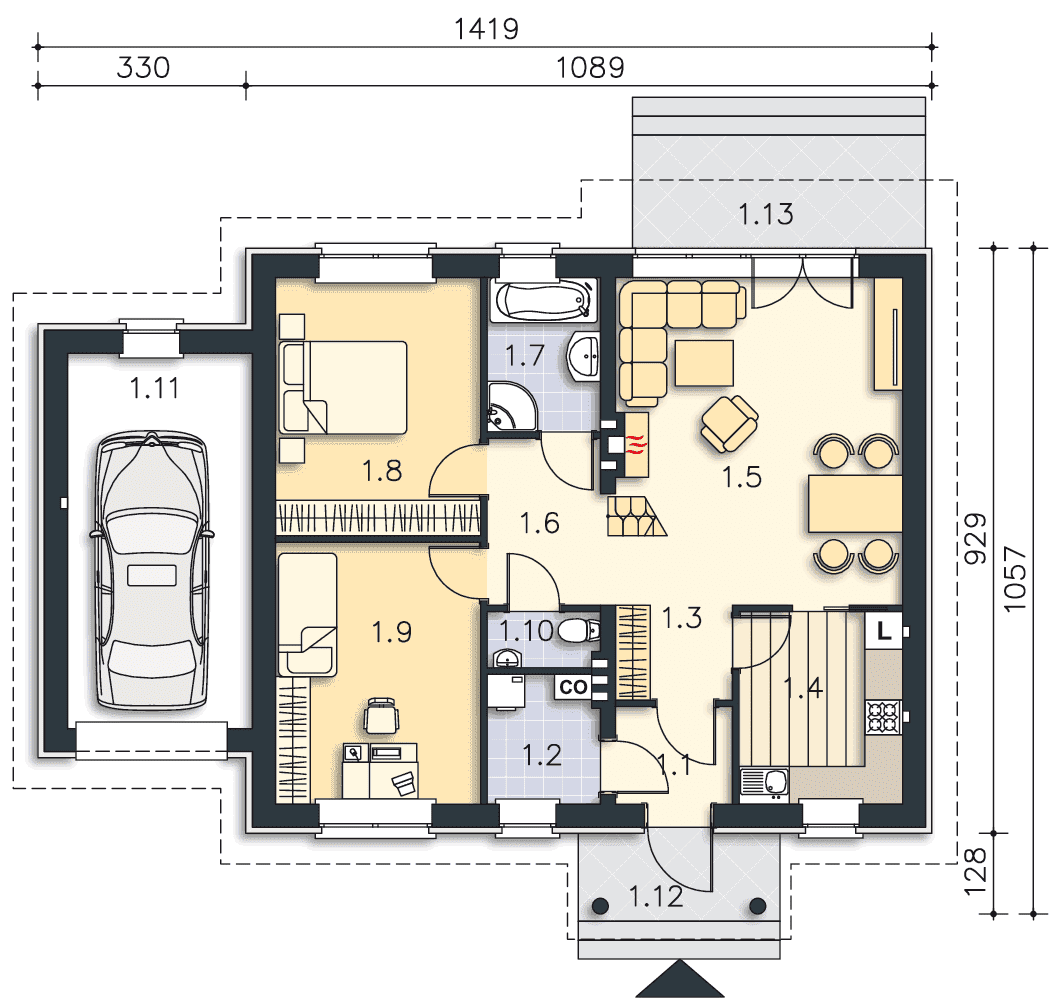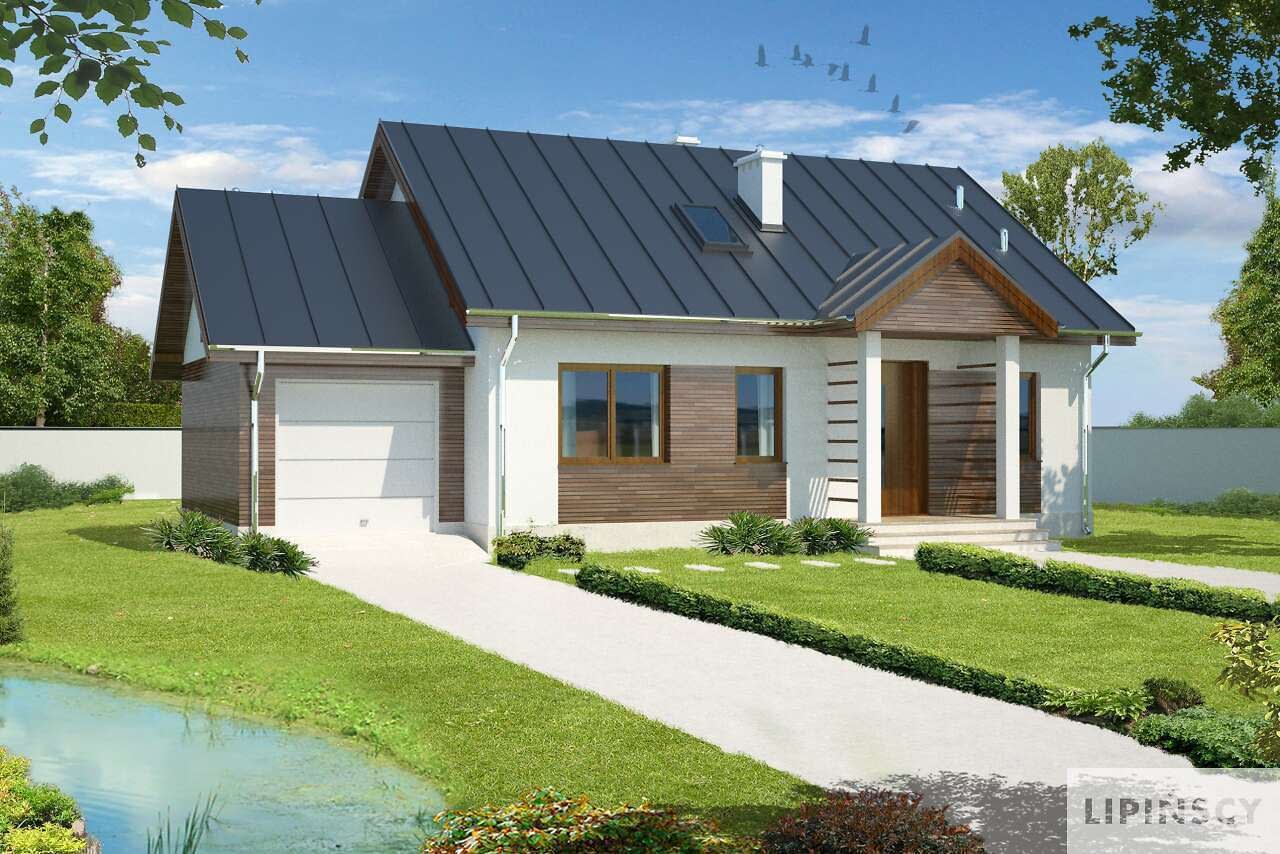 Niewielki, wygodny dom parterowy z garażem, który dzięki prostej konstrukcji i dwuspadowemu dachowi jest niedrogi w budowie. W domu widać wyraźny podział na część dzienną – salom z miejscem na stół. wc i kuchnię oraz na część prywatną – dwie sypialnie i wygodną łazienkę z wanną i prysznicem. Dom posiada ogrzewanie gazowe, kocioł został zlokalizowany w pomieszczeniu gospodarczym, które może być także pralnią.