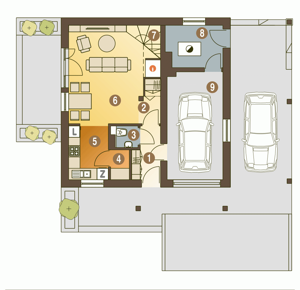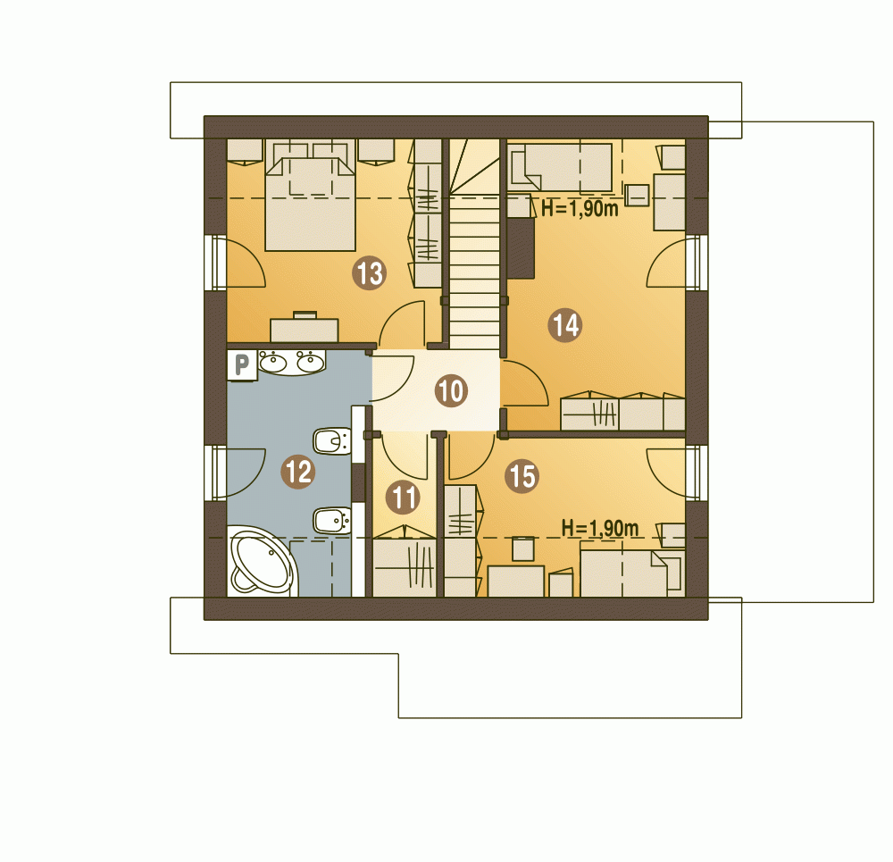 Projekt gotowy Turkawka zawiera w swoim programie użytkowym:salon z jadalnią, otwarta kuchnią, schodami na górę i kominkiem oraz witryna ogrodową. Na parterze po za tym znajdują się jeszcze takie pomieszczenia jak: garderoba wiatrołap , WC, garaż i kotłownia oraz spiżarnia. Piętro składa się z przedpokoju, trzech sypialni i łazienki oraz garderoby.Turkawka jest bardzo prosta i oszczędna - będzie tania w budowie i ekonomiczna.