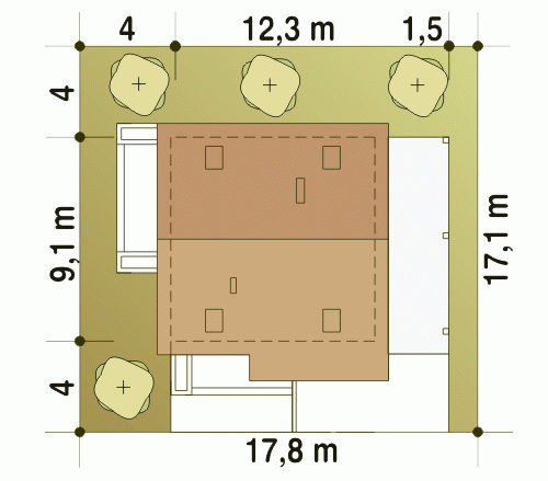 - Minimalne wymiary działki17.1 x 17.8m