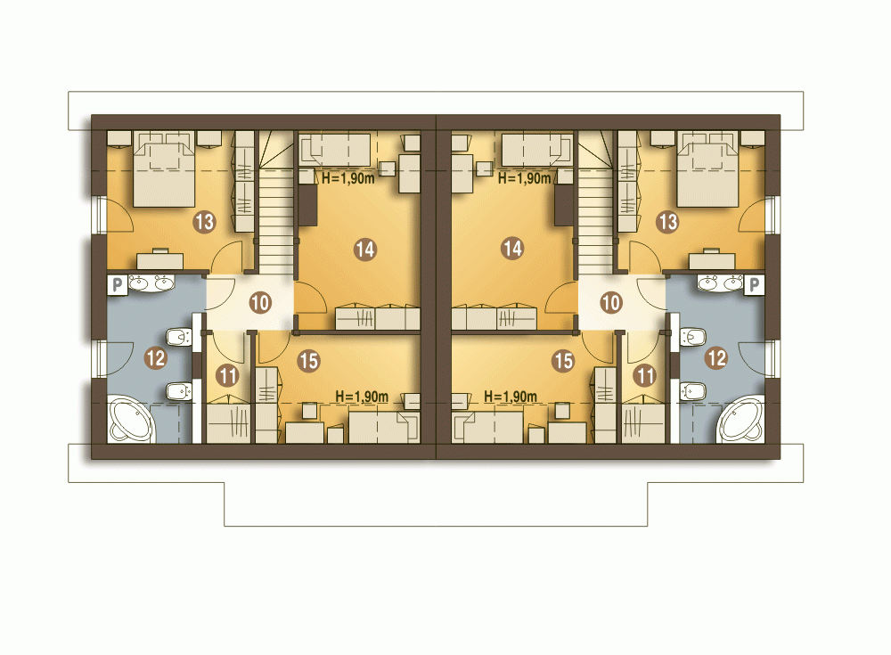 (Uwaga: projekty typu bliźniak oferujemy jako domy dwulokalowe, projekt można zamówić również w zabudowie bliźniaczej)Turkawka A-BL1 powstanie poprzez połączenie dwóch segmentów, poniższy opis dotyczy jednego z nich. Projekt gotowy Turkawka zawiera w swoim programie użytkowym:salon z jadalnią, otwartą kuchnią, schodami na górę i kominkiem oraz witryną ogrodową. Na parterze po za tym znajdują się jeszcze takie pomieszczenia jak: garderoba wiatrołap , WC, garaż i kotłownia oraz spiżarnia. Piętro składa się z przedpokoju, trzech sypialni i łazienki oraz garderoby.Turkawka jest bardzo prosta i oszczędna - będzie tania w budowie i ekonomiczna.