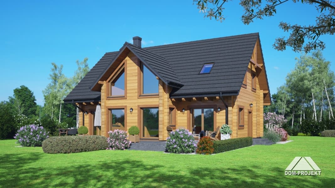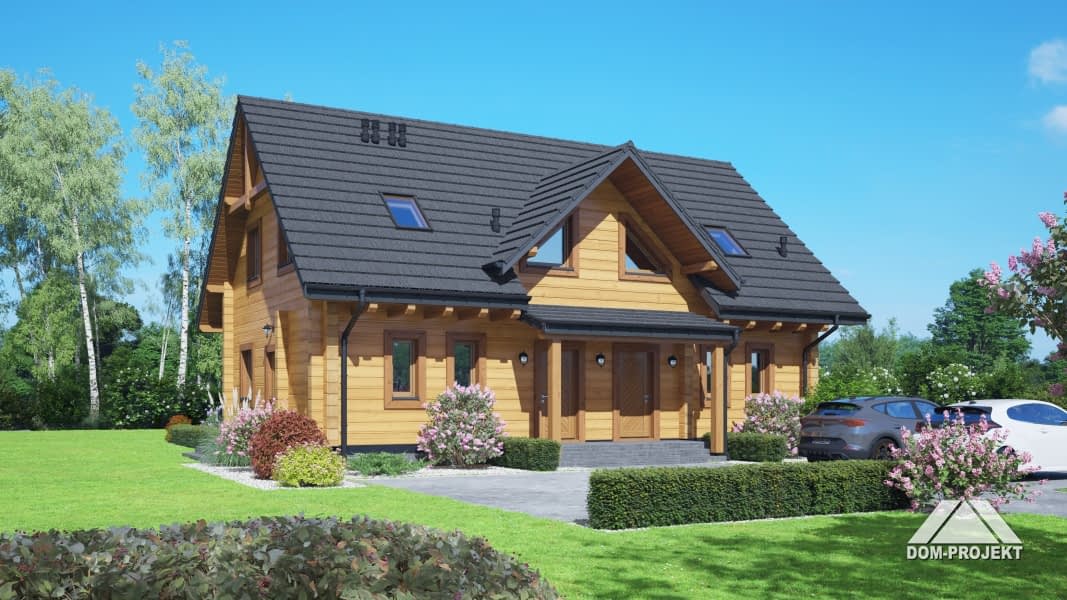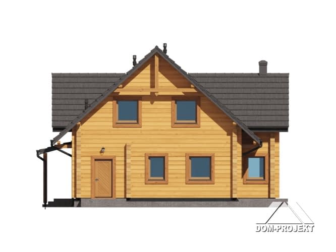 projekt nowoczesnego, ekologicznego, wygodnego domu z bali, z poddaszem użytkowym. Na parterze przestronny, dobrze doświetlony salon, otwarta kuchnia z wyspą i spiżarnią, wygodna łazienka i pomieszczenie gospodarcze. Ponadto wydzielone mini mieszkanie z własnym wejściem, aneksem kuchennym i łazienką. Na poddaszu bardzo dużo przestrzeni dla całej rodziny - trzy pokoje i wspólna łazienka.Rzuty