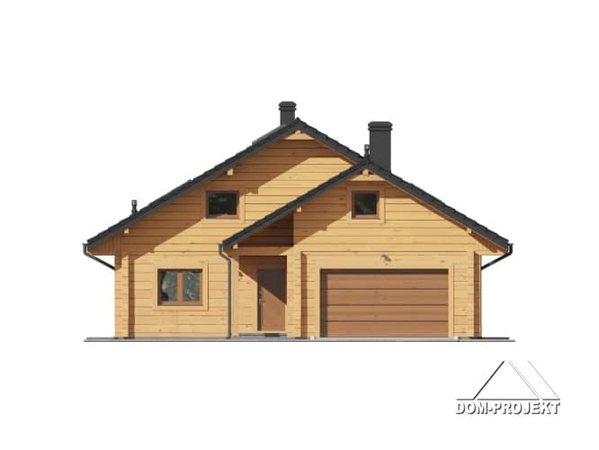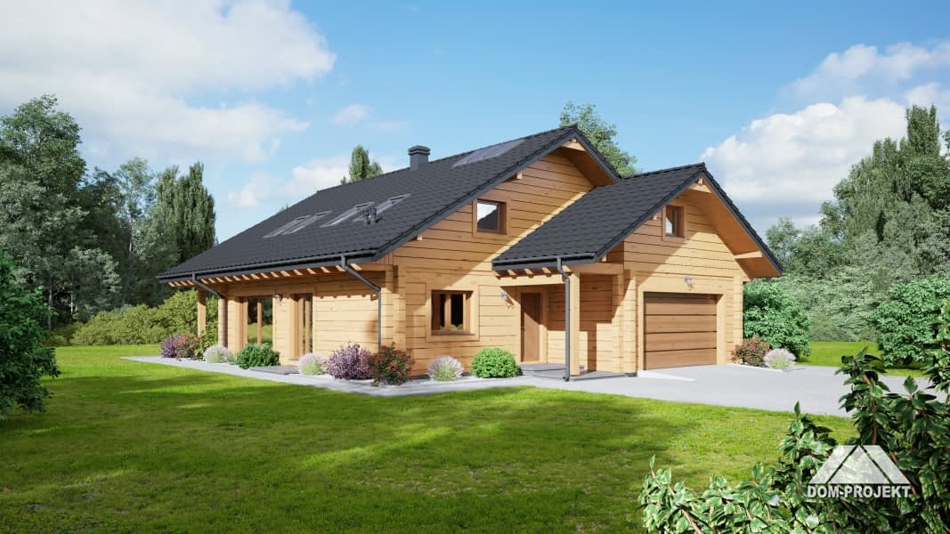 Dom z bali drewnianych. Duży salon, aneks kuchenny, pokój, łazienka, wc - pralnia, komunikacja, wiatrołap, garderoba, spiżarka, kotłownia, garaż. Na poddaszu: pokój, strych, antresola i pustka nad salonem.Rzuty