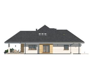 Tytan to projekt domu z użytkowym poddaszem, który zwraca uwagę imponującą powierzchnią użytkową wynoszącą niemal 500m2. Projekt odznacza się efektownym designem oraz oferuje komfortowy program użytkowy. Na parterze zaprojektowano rozbudowany układ funkcjonalny, na który składa się strefa dzienna, nocna oraz gospodarcza. W strefie dziennej znajduje się przestronny salon, duża jadalnia oraz wydzielona kuchnia ze spiżarnią, chłodnią oraz wyspą z miejscem do przyrządzania i spożywania posiłków. Charakteru dodają liczne przeszklenia, które idealnie doświetlają wnętrza naturalnym światłem. Z salonu znajduje się również wyjście na zadaszony taras, umożliwiający wypoczynek na świeżym powietrzu niezależnie od warunków pogodowych. Układ funkcjonalny na parterze uzupełnia strefa nocna, składająca się z dwóch sypialni z garderobą, dwóch łazienek oraz przestronnego holu, w którym zaprojektowano jednobiegowe schody prowadzące na poddasze. Na poddaszu zaprojektowano prywatną strefę gospodarzy, na którą składa się duża sypialnia z prywatną garderobą, łazienka, siłownia oraz dodatkowe pomieszczenia do dowolnej aranżacji. Uzupełnieniem programu funkcjonalnego jest obszerna strefa gospodarcza na parterze, w której znajduje się dwustanowiskowy garaż, pralnia, kotłownia oraz dwa pomieszczenia gospodarcze z dodatkowym wyjściem zewnętrznym.Konstrukcja