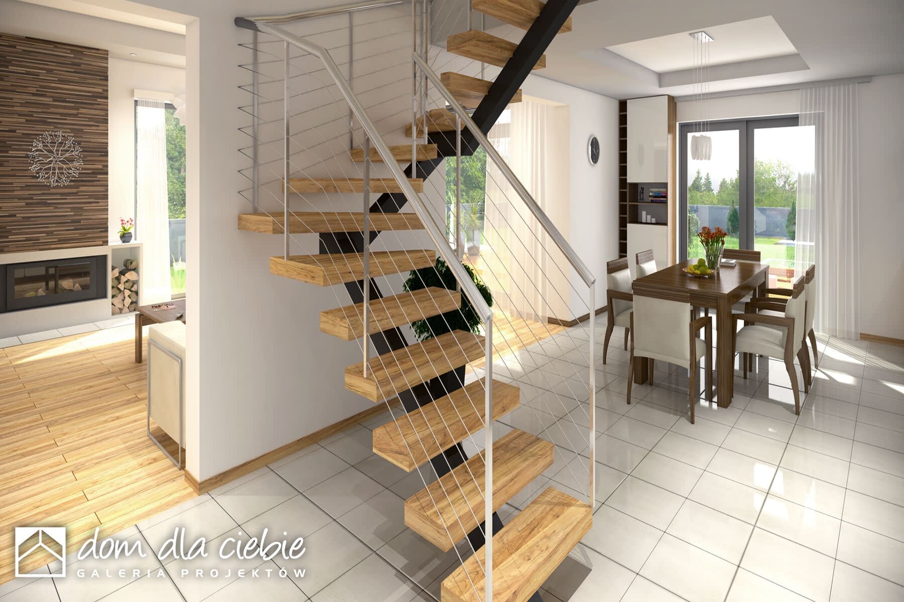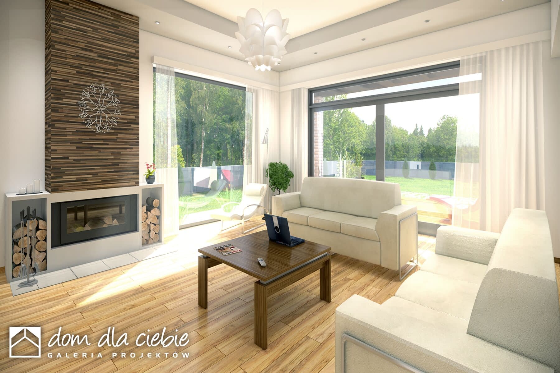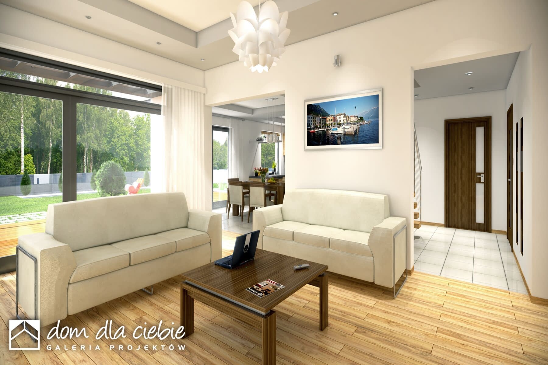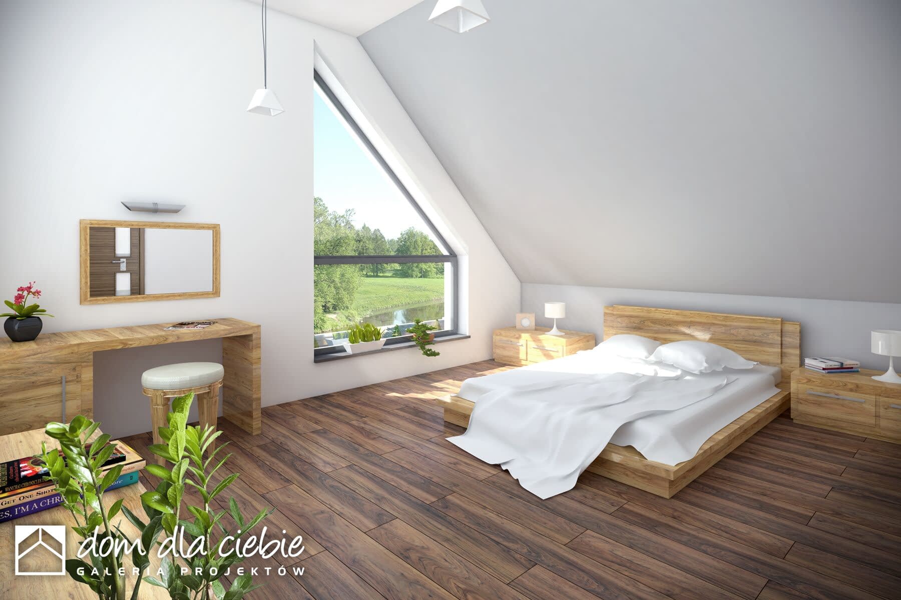 Wygodny, funkcjonalny i nowoczesny dom parterowy z poddaszem użytkowym dla 4-5 osobowej rodziny. Parter obejmuje wiatrołap, garderobę, hol, schody prowadzące na poddasze, przestronny salon z kominkiem i wyjściem na taras, kuchnię z przejściem do kotłowni, łazienkę, dodatkowy pokój, który może służyć jako gabinet. Poddasze to część prywatna w której zawierają się 3 sypialnie z charakterystycznym przeszkleniem oraz łazienką ogólnodostępną. Największa sypialnia posiada garderobę, którą można zaadoptować na łazienkę. W celu nadania budynkowi bardziej nowoczesnego stylu zaproponowano okładzinę drewnianą. Warto zaznaczyć, że prosta choć bardzo elegancka bryła i nieskomplikowana konstrukcja budynku z pewnością pozwala na zmniejszenie kosztów budowy.