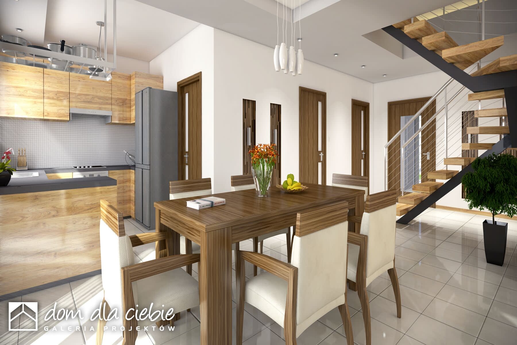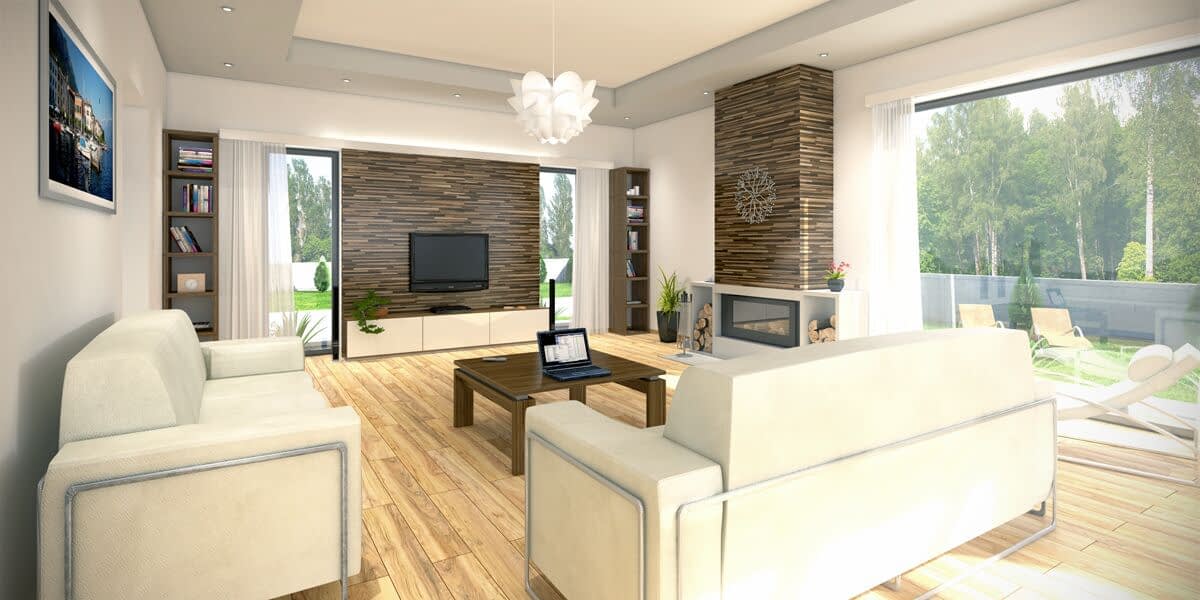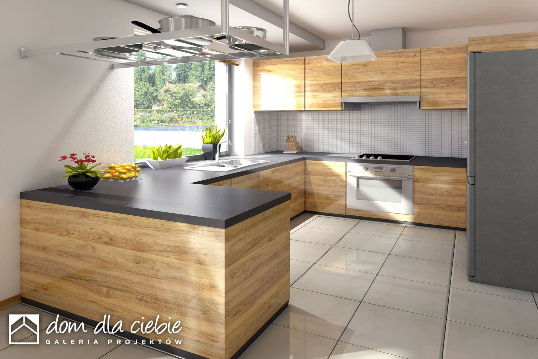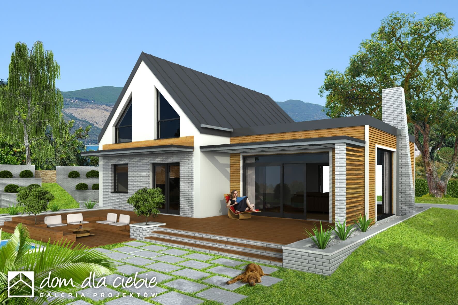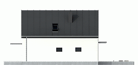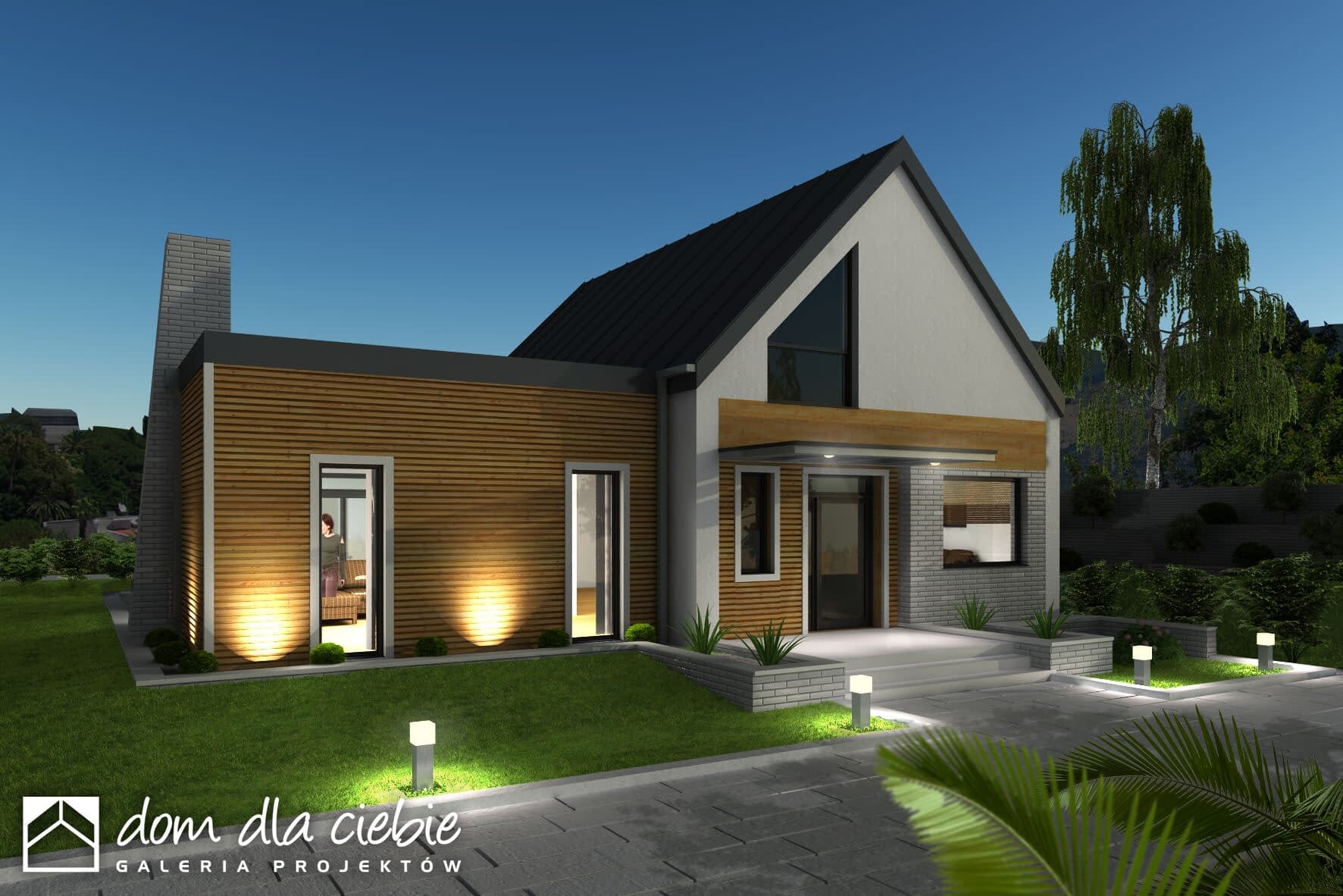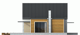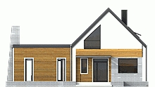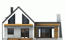 Wygodny, funkcjonalny i nowoczesny dom parterowy z poddaszem użytkowym dla 4-5 osobowej rodziny. Parter obejmuje wiatrołap, garderobę, hol, schody prowadzące na poddasze, przestronny salon z kominkiem i wyjściem na taras, kuchnię z przejściem do kotłowni, łazienkę, dodatkowy pokój, który może służyć jako gabinet. Poddasze to część prywatna w której zawierają się 3 sypialnie z charakterystycznym przeszkleniem oraz łazienką ogólnodostępną. Największa sypialnia posiada garderobę, którą można zaadoptować na łazienkę. W celu nadania budynkowi bardziej nowoczesnego stylu zaproponowano okładzinę drewnianą. Warto zaznaczyć, że prosta choć bardzo elegancka bryła i nieskomplikowana konstrukcja budynku z pewnością pozwala na zmniejszenie kosztów budowy.