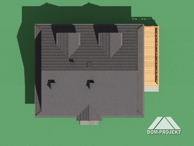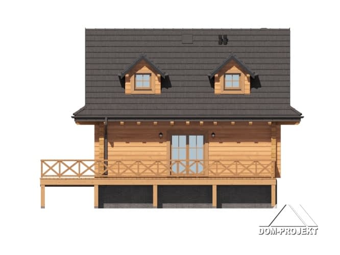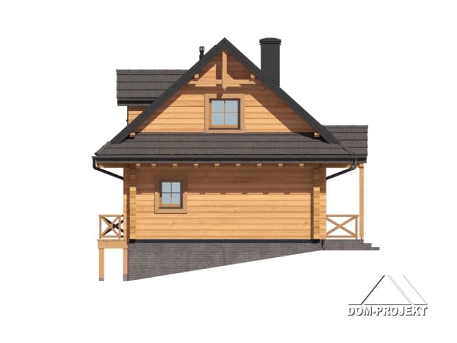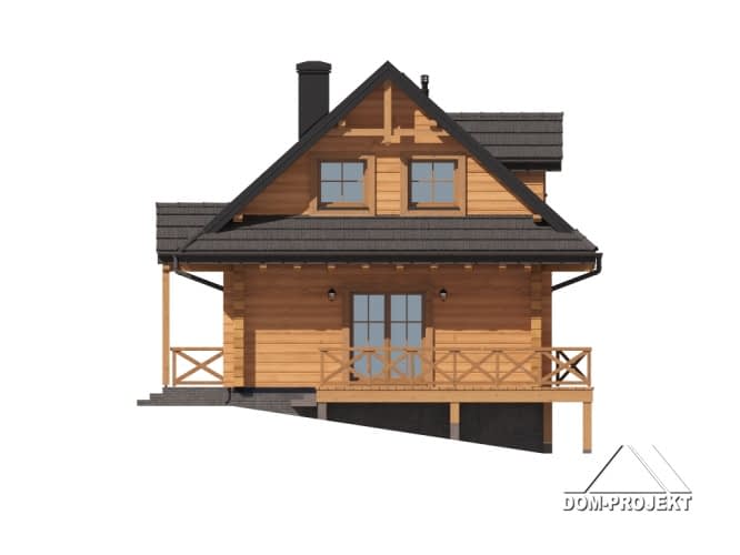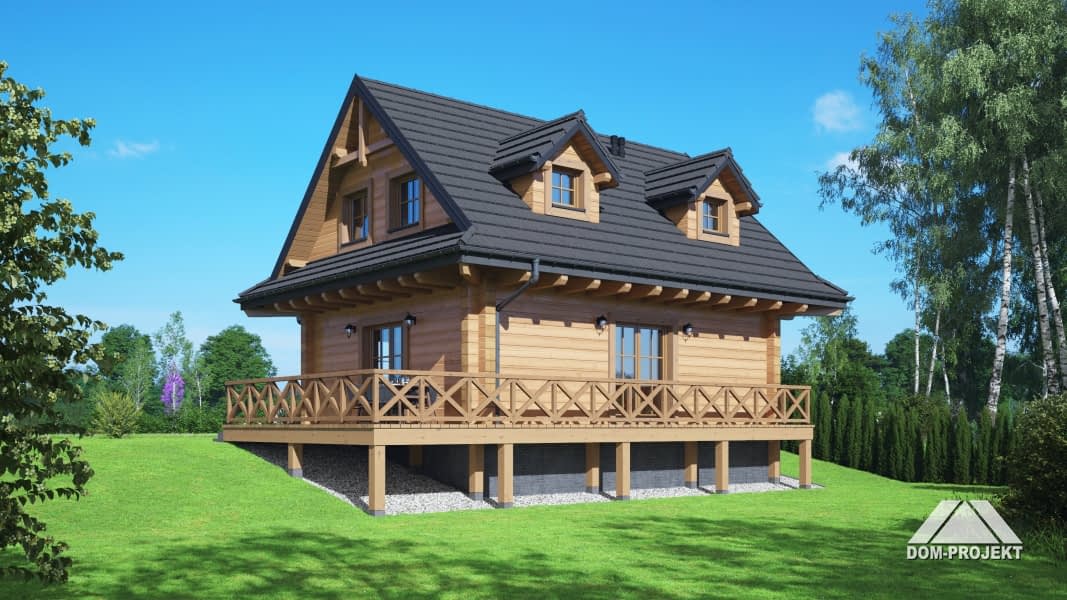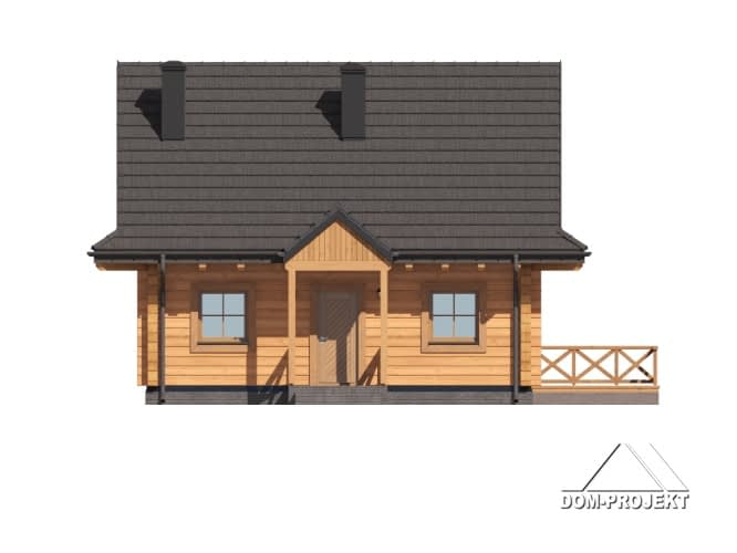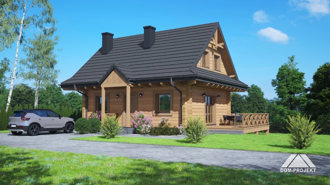 Dom z bali. Na parterze salon z kuchnią, kominkiem oraz wyjściem na taras. Łazienka, kotłownia, komunikacja, wiatrołap. Na poddaszu dwa pokoje, łazienka, garderoba, komunikacja. Zwarta bryła budynku oraz dach dwuspadowy sprzyjają szybkiej i taniej budowie oraz niskim kosztom eksploatacji.Rzuty