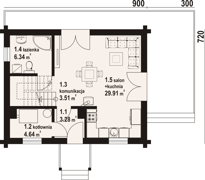 - 1.5 - kuchnia, salon29.91 m²