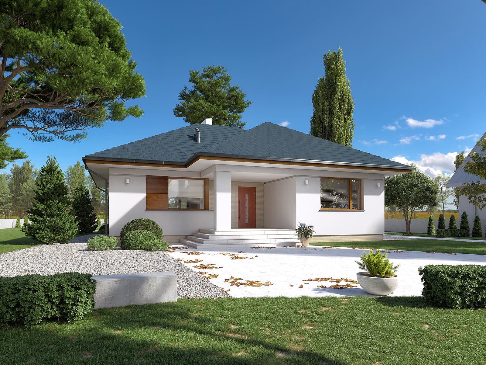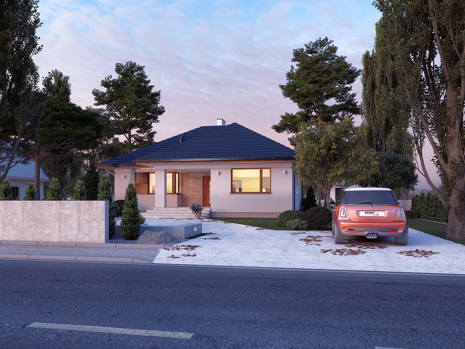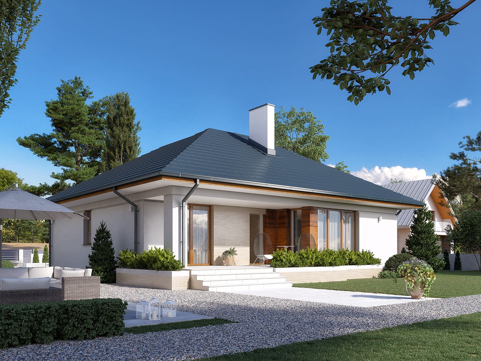 Jednorodzinny budynek mieszkalny, parterowy, niepodpiwniczony, przeznaczony dla 3 – 4-osobowej rodziny. Atutem projektu jest duży zadaszony taras oraz kotłownia na każdy rodzaj paliwa. W części dziennej zaprojektowano salon z jadalnią oraz kuchnię ze spiżarnią. W części nocnej umieszczono dwie sypialnie oraz łazienkę.Konstrukcja