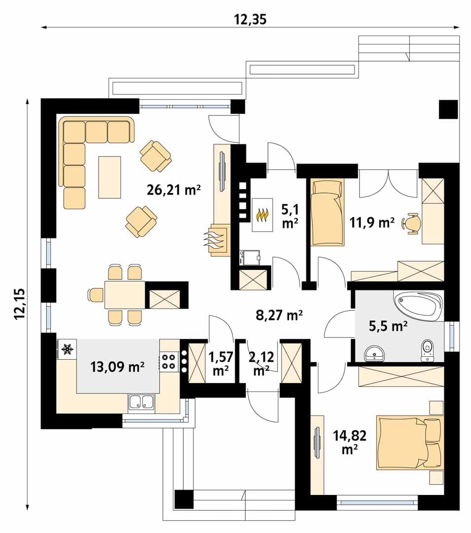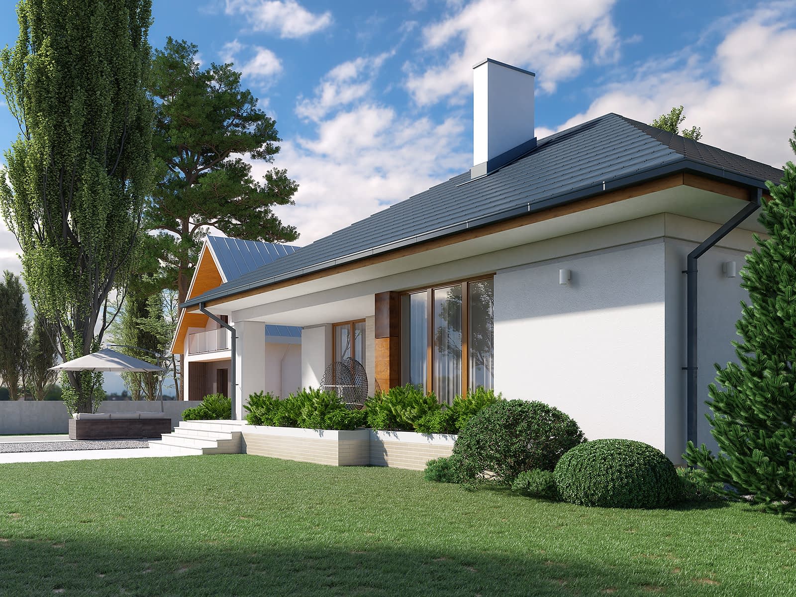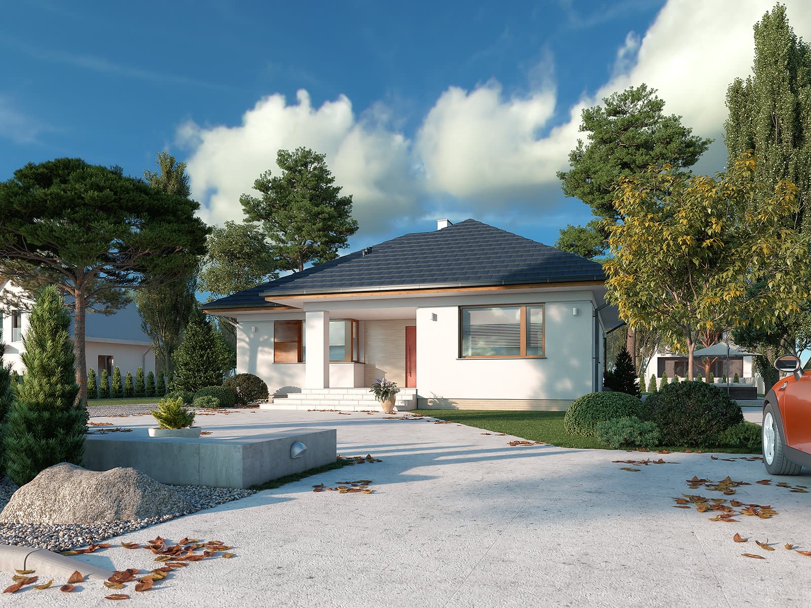 Jednorodzinny budynek mieszkalny, parterowy, niepodpiwniczony, przeznaczony dla 3 – 4-osobowej rodziny. Atutem projektu jest duży zadaszony taras oraz kotłownia na każdy rodzaj paliwa. W części dziennej zaprojektowano salon z jadalnią oraz kuchnię ze spiżarnią. W części nocnej umieszczono dwie sypialnie oraz łazienkę.Konstrukcja