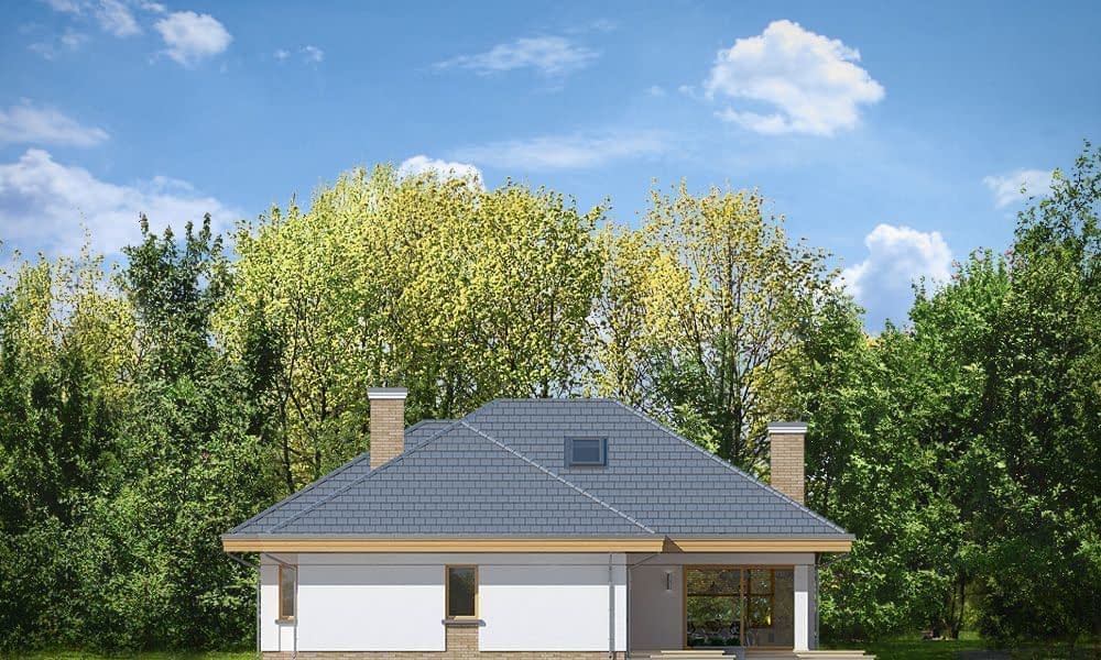 Projekt domu Uroczy to parterowy dom jednorodzinny o wdzięcznej nazwie dla 3-5 cioosobowej rodziny. Dom Uroczy został zaprojektowany na planie litery „T”. Jego rozłożysty plan parteru, na którym zmieszczono wszystkie funkcje domu przykryto wielospadowym dachem kryjącym przestronny strych. Projekt domu Uroczy został zaplanowany w taki sposób, aby nadawał się do zastosowania zarówno na działkę z wjazdem od północy, jak i od południa, od nasłonecznionej strony. Dzięki dobremu doświetleniu salonu z trzech stron i przesunięciu tarasów na boczną elewację, nawet na mniej korzystnie usytuowanej względem słońca działce, zarówno wnętrza, jak i tarasy będą bardzo dobrze doświetlone.Projekt domu Uroczy architektura i wnetrzeArchitektura domku Uroczy utrzymana jest w stylu komfortowej podmiejskiej willi - nowoczesnej, ale osadzonej w tradycyjnej bryle.Duże przeszklenia otwierają wnętrze budynku na otaczający ogród. Wnętrze budynku Uroczy podzielono na część dzienną i osobną część nocną z pokojami mieszkańców. Do projektu Uroczy wchodzimy pięknymi szerokimi drzwiami z naświetlami do bardzo obszernego i tym samym wygodnego przedsionka, a stamtąd dalej do holu i części dziennej domu. W projekcie domku Uroczy połączony salon, z jadalnią, hol i kuchnia stanowią wspólne wnętrze dzienne. Przeszklony narożnik jadalni projektu Uroczy otwiera wnętrze domu na kameralny taras z dużym podcieniem. Z okna kuchennego między szafkami można obserwować przyjęcia na tarasie. Obszerna kuchnia ze spiżarką otwiera się na salon półwyspem z hokerami. Nad częścią dzienną projektu Uroczy otwiera się pustka nad salonem z widocznym dachem i antresolą na strychu. Z sieni projektu domu Uroczy przechodzimy też do dwustanowiskowego garażu i kotłowni. Część nocna domu to apartament rodziców z własną łazienką, garderobą i tarasem, dwie sypialnie dziecięce z łazienką, oraz dodatkowy pokój - np. gabinet. Pokoje można podzielić w łatwy sposób inaczej. W projekcie domku Uroczy nad parterem mamy obszerny strych, oraz antresolę nad salonem. Strych można dowolnie zagospodarować - pozostawić go jako domowy magazyn, lub zaadaptować go na poddasze użytkowe zwiększając w ten sposób powierzchnię użytkową budynku. Projekt domu Uroczy został zaprojektowany jako energooszczędny, nieskomplikowany w budowie i maksymalnie funkcjonalny. Projekt dobrze nadaje się na dość wąską działkę, a szczególnie na parcelę z niekorzystnym wjazdem od południa lub zachodu. Do wymarzona propozycja dla ambitnych i ceniących estetykę Inwestorów. Pracownia MGProjekt dysponuje też odbiciel lustrzanym projektu domku Uroczy z garażem po lewej stronie.