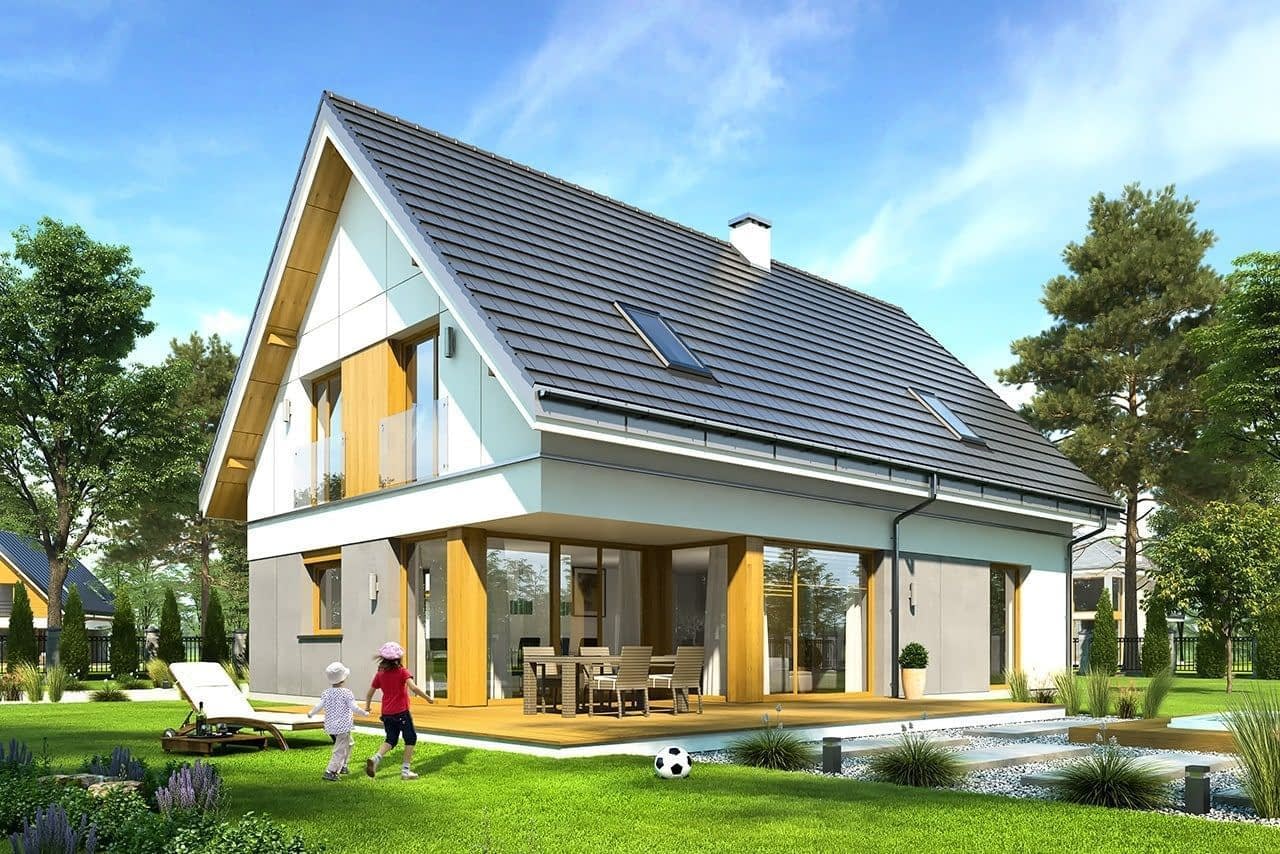 Projekt domu Viking to podstawowa bazowa wersja projektu z serii domów Viking. Jest to projekt parterowego budynku z poddaszem użytkowym, dla rodziny 4-6 osobowej. Dom o prostej nowoczesnej bryle, energooszczędny, zbudowany na planie prostokąta, przykrytego dwuspadowym symetrycznym dachem, z dobudowanym parterowym garażem. Projekt domu Viking, dzięki odpowiedniemu rozplanowaniu pomieszczeń i otworów okiennych i drzwiowych, nadaje się zarówno na działkę z drogą naprzeciwko wejścia (równoległą do kalenicy ), jak i na działkę z wjazdem od południa ( wówczas wjazd znajduje się naprzeciwko wrót garażowych). Nowoczesna architektura i funkcjonalne wnętrze przypadną do gustu osobom ceniącym rozsądek i maksymalny efekt w architekturze z zastosowaniem minimalistycznych środków. Front Vikinga zaakcentowany jest dużym przeszkleniem kuchni, oraz podcieniem z wejściowymi drzwiami z bocznym naświetlem. Ściany frontowa i garażowa tworzą wejściowo-wjazdowy placyk –dziedziniec. Dzięki takiemu rozwiązaniu przed domem znajdzie się sporo miejsca na wygodny podjazd, parking, oraz reprezentacyjną zieleń. Z tyłu domu królują duże przeszklenia salonu i jadalni otwierające wnętrze parteru na ogród, oraz wygodny podcień będący zadaszeniem części tarasu. Wnętrze podzielono część dzienną i gospodarczą na parterze, oraz sypialnie na poddaszu. Na parterze zaprojektowano jednoprzestrzenne wnętrze salonu, jadalni i holu, z częściowo otwartą na jadalnię kuchnią ze spiżarką. Obok salonu znajduje się dodatkowy pokój : gabinet lub sypialnia gościnna i łazienka, a obok schodów przechodzimy do części gospodarczej, z pomieszczeniem gospodarczym, kotłownią i dwustanowiskowym garażem. Na poddaszu zaprojektowano dwie duże sypialnie dziecięce z szafami wbudowanymi, łazienkę, pralnię, oraz osobny apartament rodziców, z dwiema garderobami i oddzielną dużą łazienką. Dom jest bardzo wygodny i komfortowy. Jednocześnie jego prosta bryła i konstrukcja pozwoli na sprawną w niedrogą budowę, a energooszczędne rozwiązania i zwartość bryły budynku - na niewysokie koszty utrzymania domu. Projekt domu Viking dostępny jest w odbiciu lustrzanym jak i w kilku innych wersjach np. z garażem jednostanowiskowym i zwężoną bryłą główną (projekt domu Viking 2), bez garażu (projekt domu Viking 3), z zadaszeniem nad garażem (projekt domu Viking 4), oraz największy (projekt domu Viking 5) Dom można łatwo dostosować do standardu NF40. Zapraszamy.