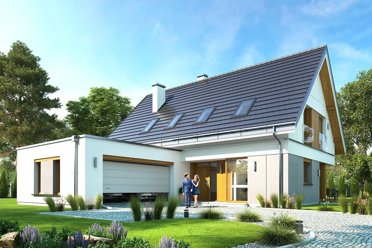 Projekt domu Viking to podstawowa bazowa wersja projektu z serii domów Viking. Jest to projekt parterowego budynku z poddaszem użytkowym, dla rodziny 4-6 osobowej. Dom o prostej nowoczesnej bryle, energooszczędny, zbudowany na planie prostokąta, przykrytego dwuspadowym symetrycznym dachem, z dobudowanym parterowym garażem. Projekt domu Viking, dzięki odpowiedniemu rozplanowaniu pomieszczeń i otworów okiennych i drzwiowych, nadaje się zarówno na działkę z drogą naprzeciwko wejścia (równoległą do kalenicy ), jak i na działkę z wjazdem od południa ( wówczas wjazd znajduje się naprzeciwko wrót garażowych). Nowoczesna architektura i funkcjonalne wnętrze przypadną do gustu osobom ceniącym rozsądek i maksymalny efekt w architekturze z zastosowaniem minimalistycznych środków. Front Vikinga zaakcentowany jest dużym przeszkleniem kuchni, oraz podcieniem z wejściowymi drzwiami z bocznym naświetlem. Ściany frontowa i garażowa tworzą wejściowo-wjazdowy placyk –dziedziniec. Dzięki takiemu rozwiązaniu przed domem znajdzie się sporo miejsca na wygodny podjazd, parking, oraz reprezentacyjną zieleń. Z tyłu domu królują duże przeszklenia salonu i jadalni otwierające wnętrze parteru na ogród, oraz wygodny podcień będący zadaszeniem części tarasu. Wnętrze podzielono część dzienną i gospodarczą na parterze, oraz sypialnie na poddaszu. Na parterze zaprojektowano jednoprzestrzenne wnętrze salonu, jadalni i holu, z częściowo otwartą na jadalnię kuchnią ze spiżarką. Obok salonu znajduje się dodatkowy pokój : gabinet lub sypialnia gościnna i łazienka, a obok schodów przechodzimy do części gospodarczej, z pomieszczeniem gospodarczym, kotłownią i dwustanowiskowym garażem. Na poddaszu zaprojektowano dwie duże sypialnie dziecięce z szafami wbudowanymi, łazienkę, pralnię, oraz osobny apartament rodziców, z dwiema garderobami i oddzielną dużą łazienką. Dom jest bardzo wygodny i komfortowy. Jednocześnie jego prosta bryła i konstrukcja pozwoli na sprawną w niedrogą budowę, a energooszczędne rozwiązania i zwartość bryły budynku - na niewysokie koszty utrzymania domu. Projekt domu Viking dostępny jest w odbiciu lustrzanym jak i w kilku innych wersjach np. z garażem jednostanowiskowym i zwężoną bryłą główną (projekt domu Viking 2), bez garażu (projekt domu Viking 3), z zadaszeniem nad garażem (projekt domu Viking 4), oraz największy (projekt domu Viking 5) Dom można łatwo dostosować do standardu NF40. Zapraszamy.