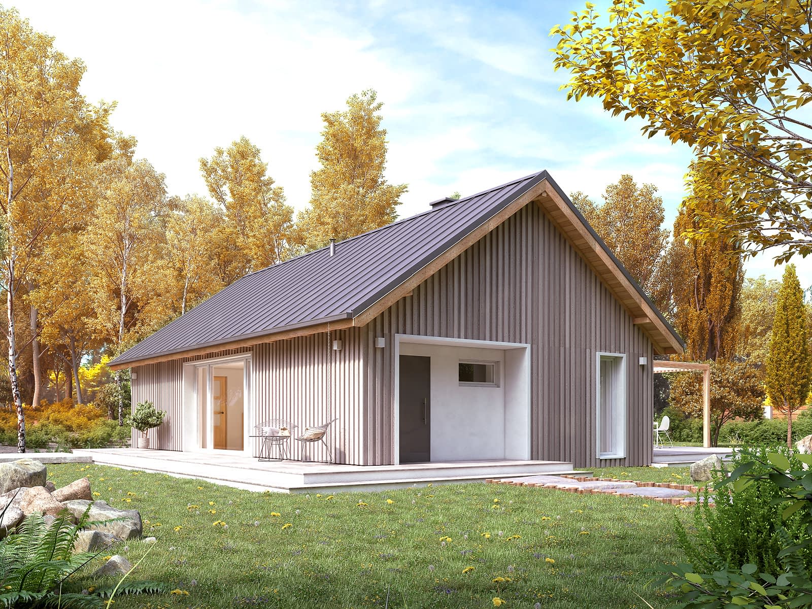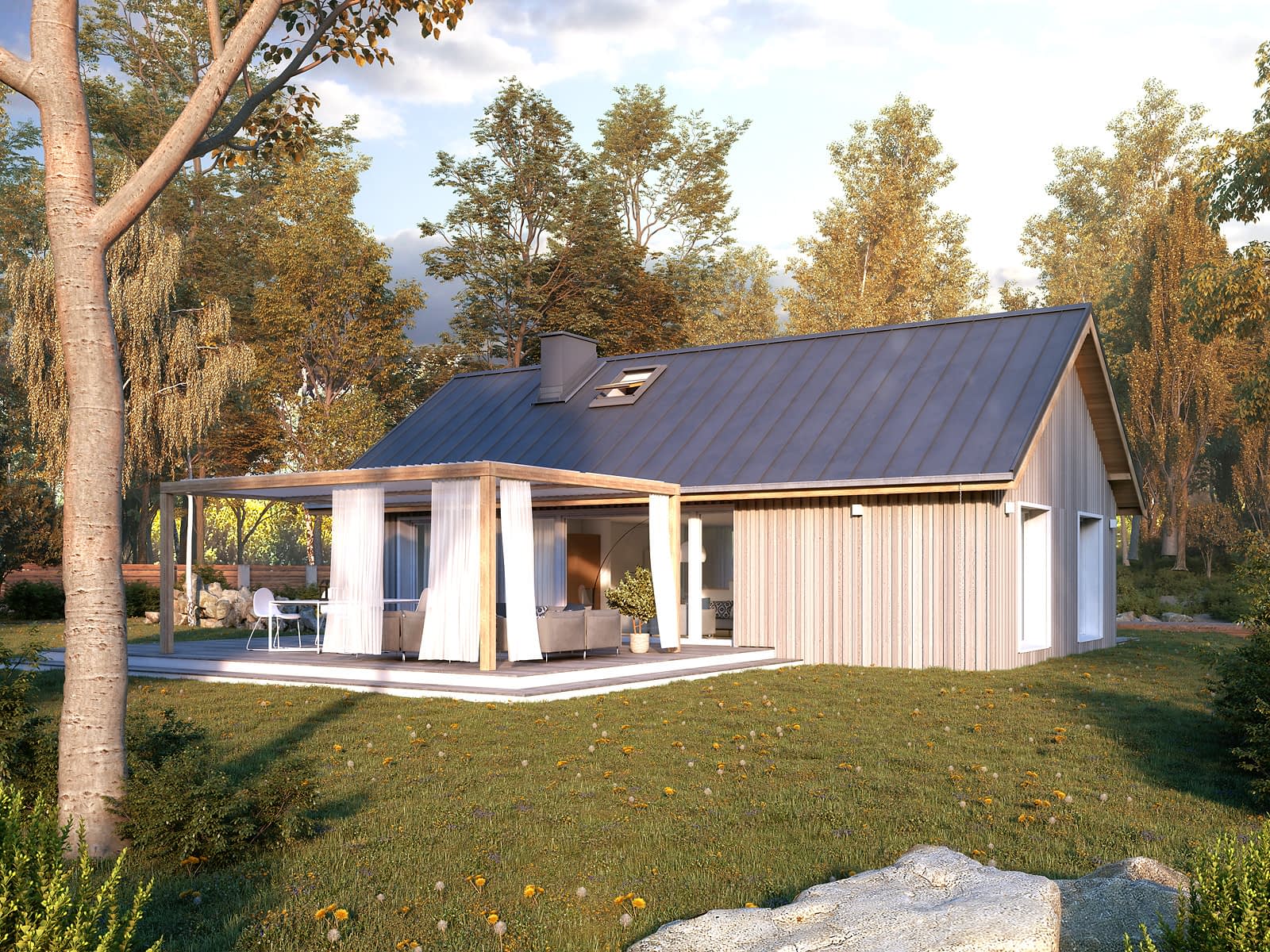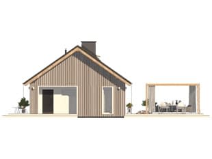 Projekt domu Wakacyjny 2 należy do kategorii domów nowoczesne stodoły. Tradycyjna bryła budynku kontrastuje z nowoczesnymi, dużymi przeszkleniami i rozwiązaniami materiałowymi. Atutem projektu jest zaprojektowany salon z otwartą kuchnią i jadalnią. Część wspólna jest sercem całego domu. Dodatkowo zaprojektowano trzy sypialnie oraz łazienkę z miejscem na piec gazowy. Dom może pełnić funkcję letniskową oraz całoroczną.Konstrukcja