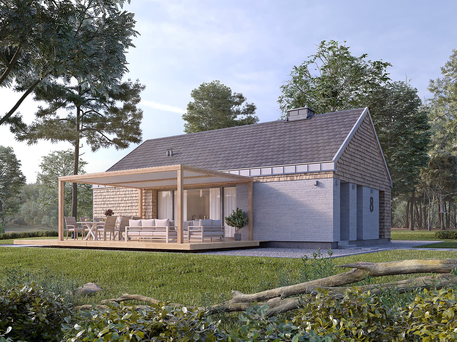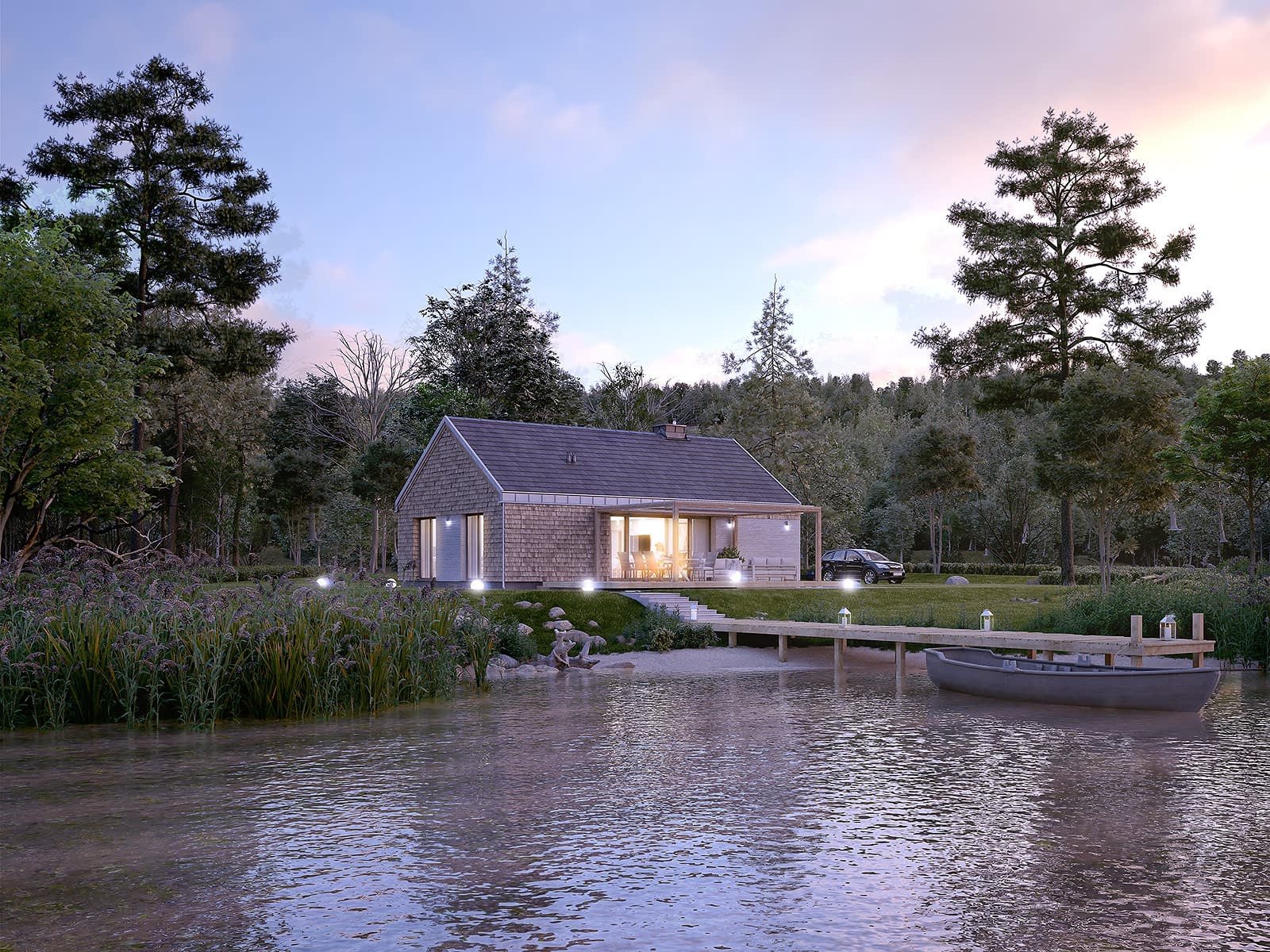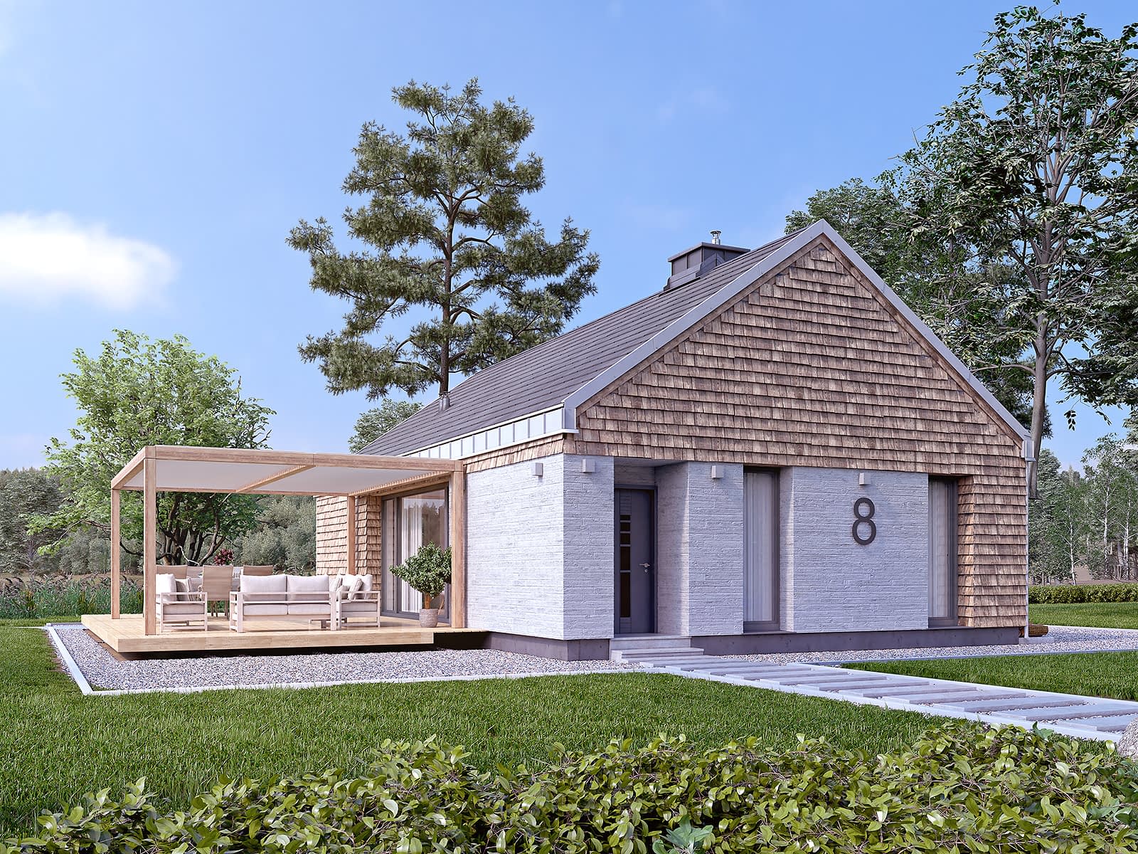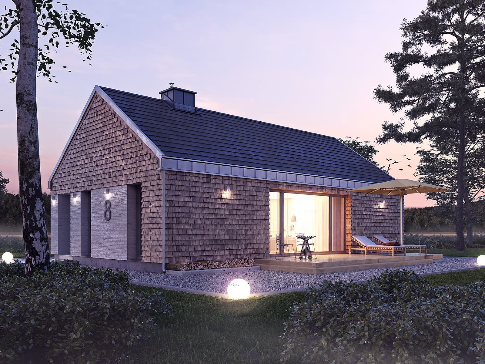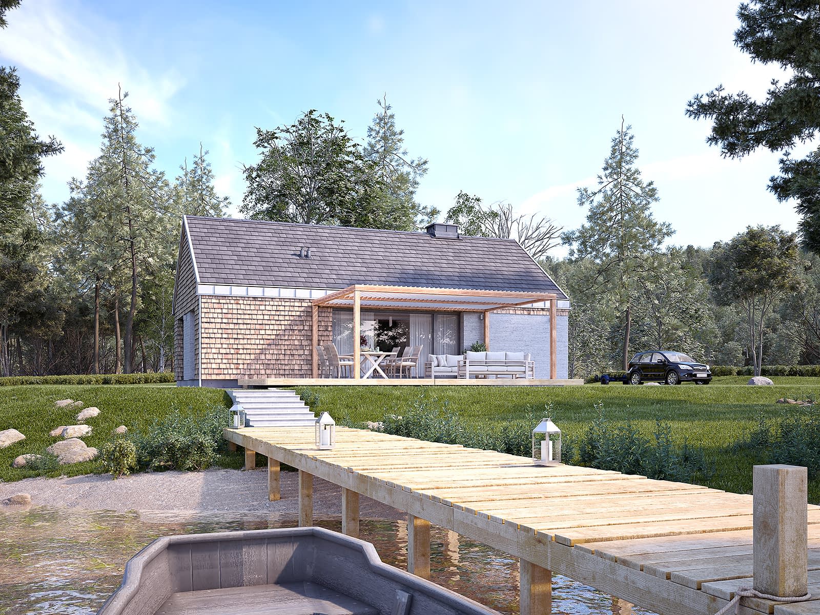 Projekt Wakacyjny to dom parterowy o charakterze wypoczynkowym. Zastosowanie dużych przeszkleń oraz naturalnych materiałów sprawiają, że dom będzie wpisywał się w otaczający krajobraz. W domu znajduje się otwarta kuchnia wraz z jadalnią i salonem. Zaprojektowano również niewielki wiatrołap oraz łazienkę z miejscem na piec gazowy. Dom może pełnić funkcję letniskową oraz całoroczną.Konstrukcja