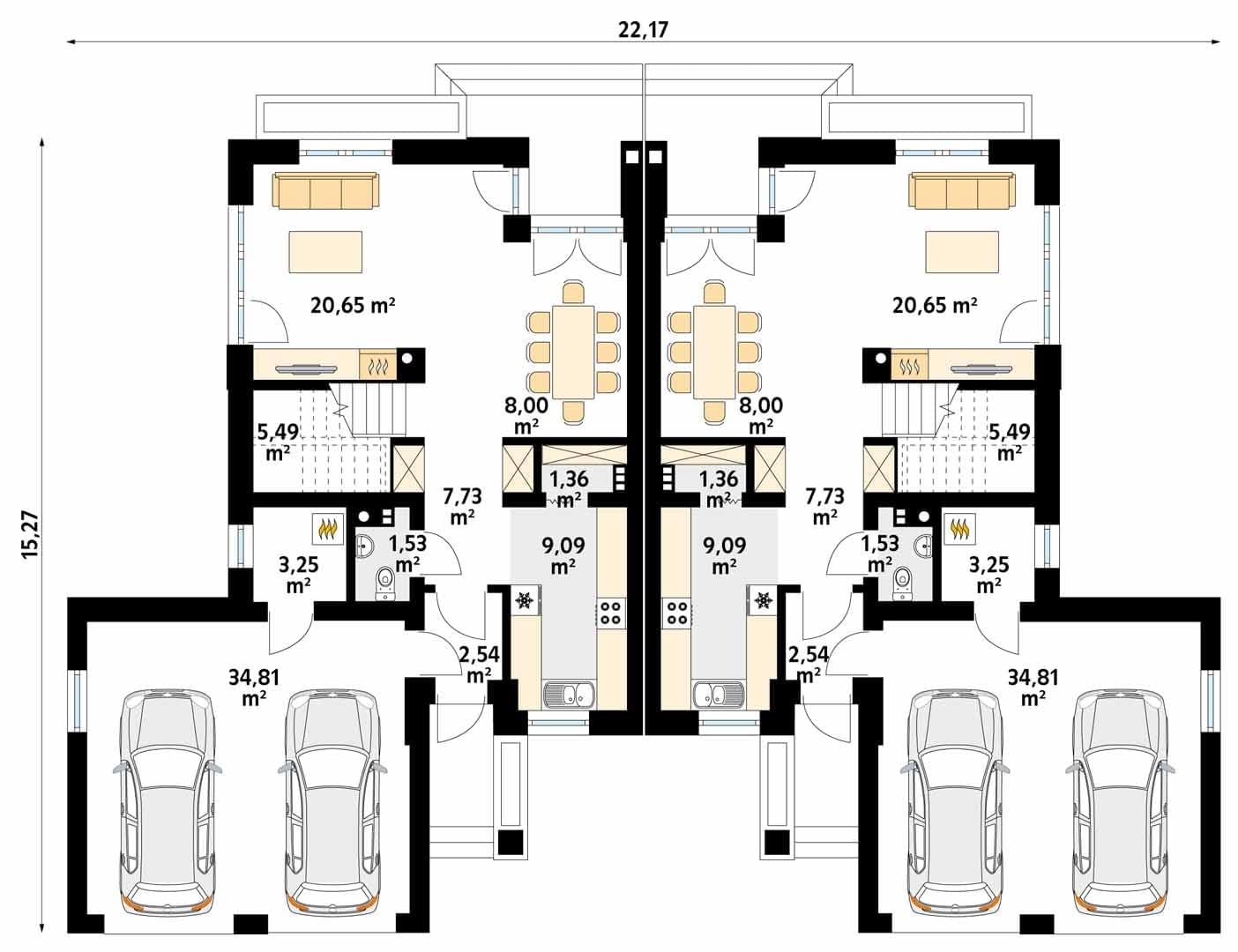 Waniliowy to projekt domu jednorodzinnego w zabudowie bliźniaczej, który wyróżnia się niebanalną stylistyką. Charakterystycznym elementem budynku są garaże, wysunięte od frontu, nad którymi zaprojektowano rozległe tarasy. Program funkcjonalny budynku został podzielony na strefę dzienną i nocną. Na parterze znajduje się strefa dzienna z salonem, jadalnią, kuchnia z praktyczna spiżarnią oraz WC. Piętro tworzy strefę nocną, na którą składają się trzy sypialnie oraz rodzinna łazienka. Główna sypialnia gospodarzy posiada prywatną garderobę oraz balkon od strony ogrodu.Konstrukcja